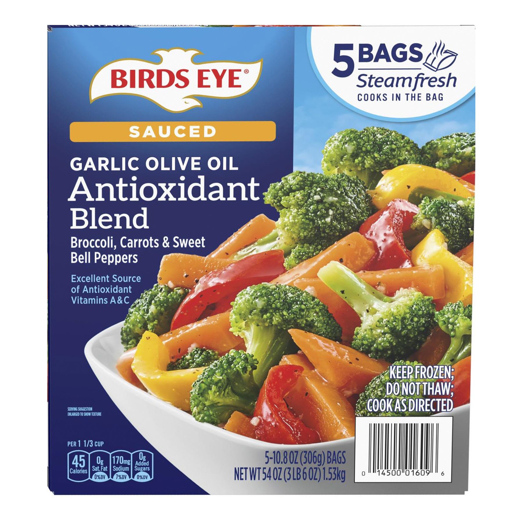 Enjoy delicious antioxidant rich vegetables with Birds Eye Steamfresh Sauced Garlic Olive Oil Antioxidant Blend. This vegetable mix features broccoli, carrots and sweet bell peppers coated in garlic olive oil to bring you a side dish that's an excellent source of antioxidant vitamins A and C. Each box includes five 10.8 oz. Steamfresh bags so you can stock your freezer with a veggie mix that is ready to prepare. The convenient Steamfresh bags allow you to cook your frozen veggies in the microwave in just minutes directly in the bag. Serve these steamed veggies as a side with your favorite protein for a wholesome family meal. Make mealtime complete with Birds Eye Steamfresh vegetables.