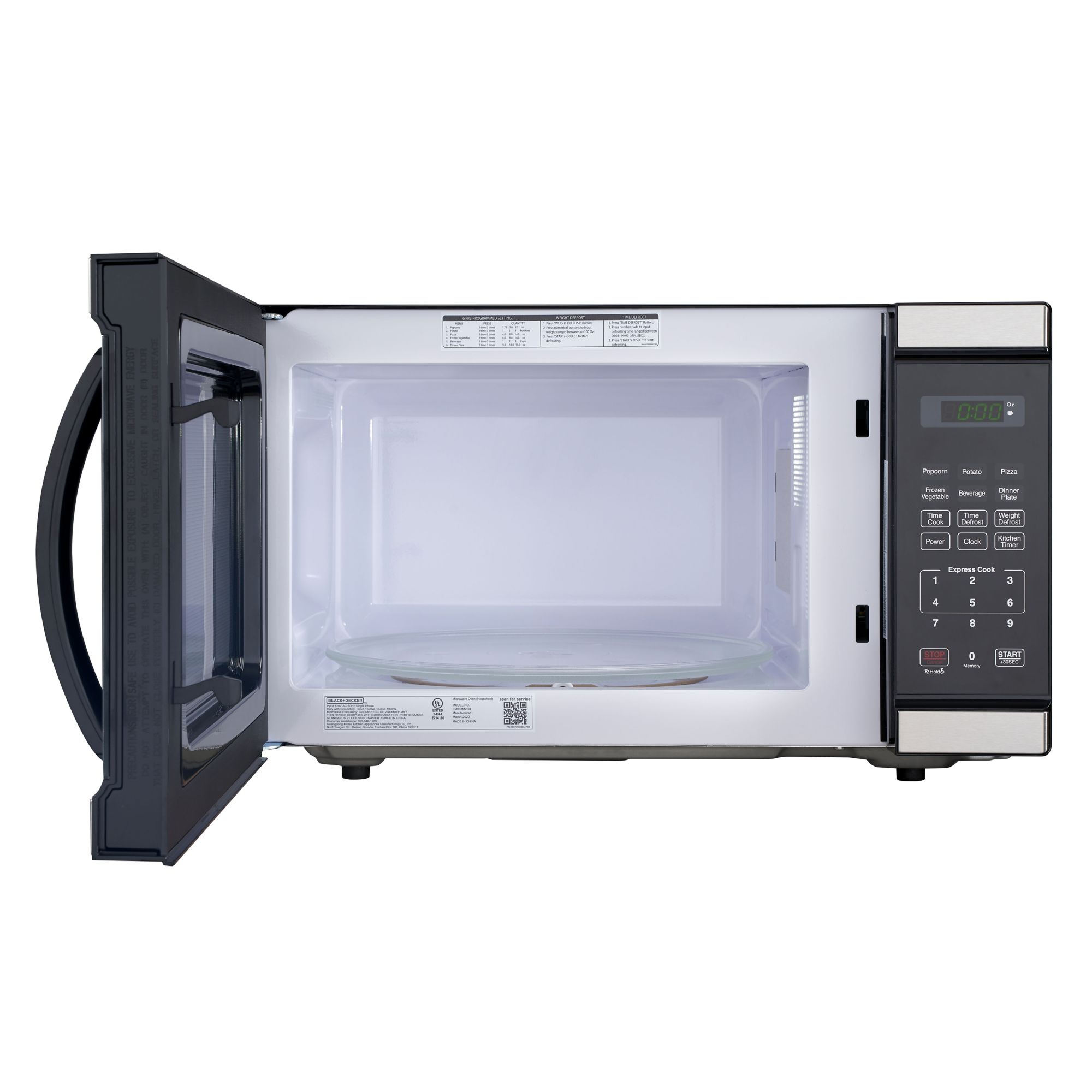 1.1-cu.-ft. capacity 1000 Watts output power Stainless steel outlook Six preset auto cooking programs Green LED display and interior LED lighting Defrost by weight and time Kitchen timer and clock function Child safety lock function 1-6 mins quick start and add 30seconds button