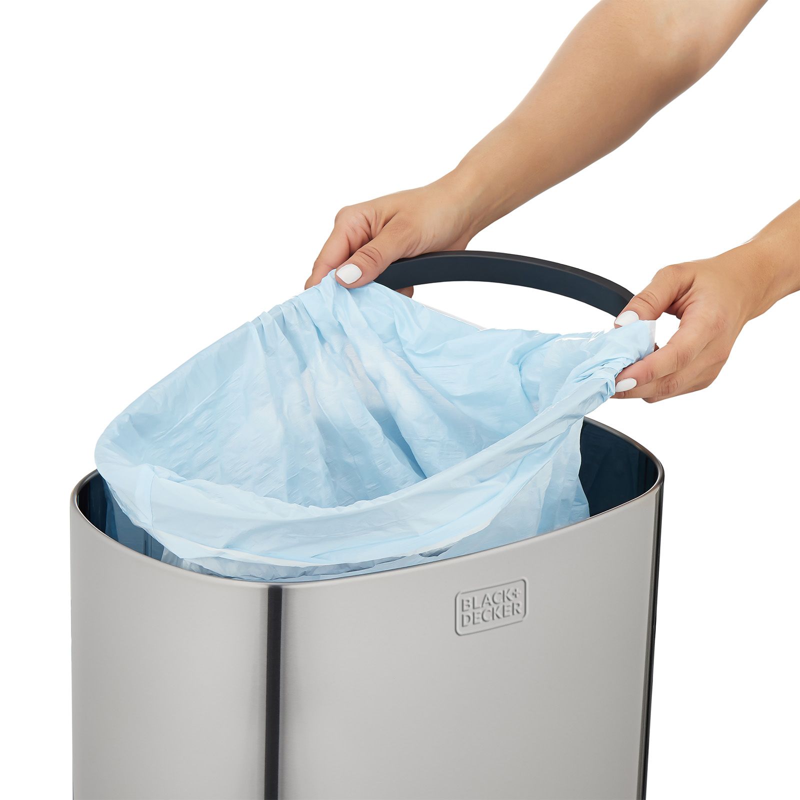 The Black & Decker 50L Motion Sensor Soft Close Trash Can has a motion sensor so you can wave to close or open the soft-close lid. It fits up to a 13 gallon trash bag. Made of brushed stainless steel, the body of the waste can is fingerprint-resistant. Easy bag removal and inner plastic rim secure the bag in place. It requires four AA batteries (not included).