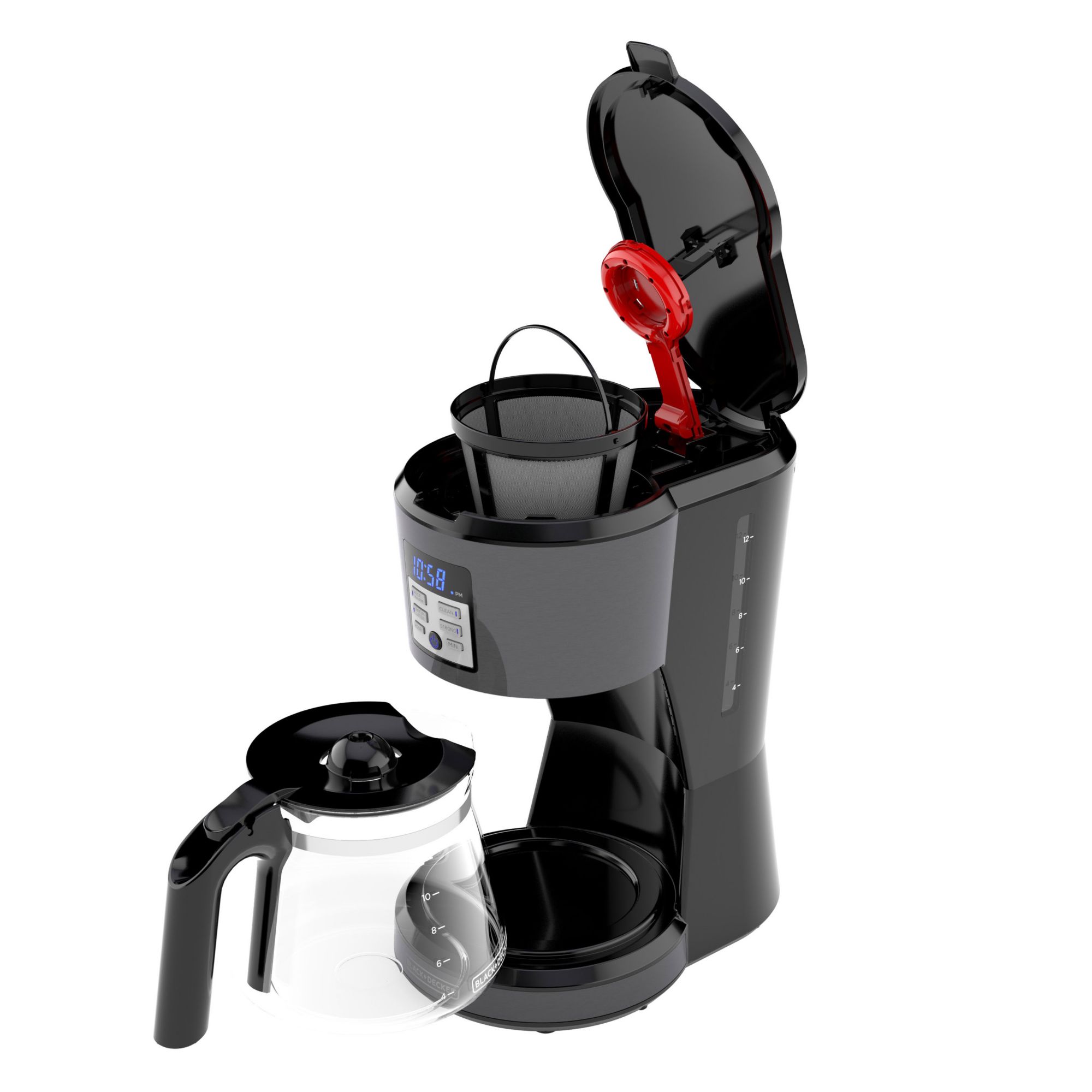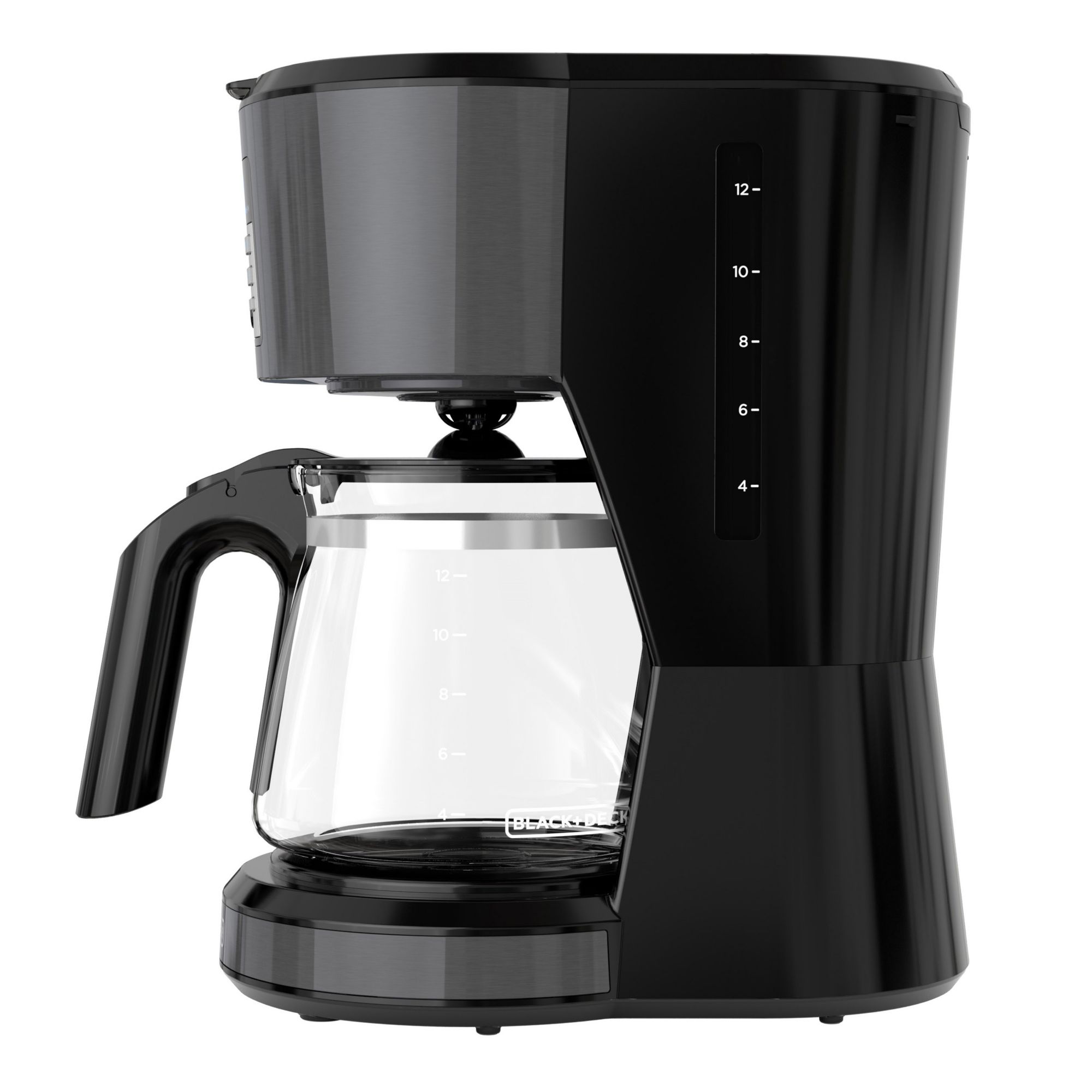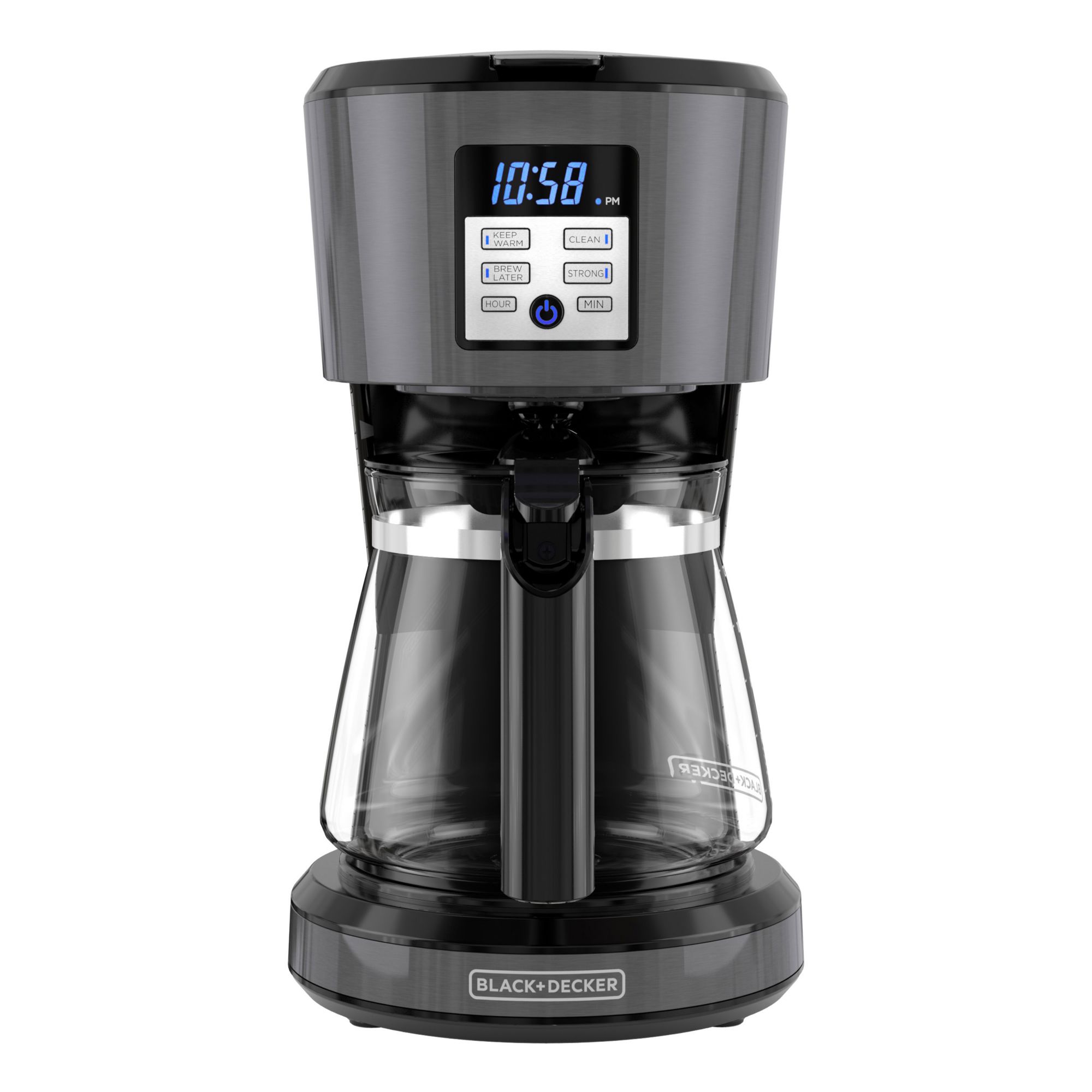 Black and Decker 12-Cup Programmable Coffee Maker. Evenly saturates grounds for full flavor extraction. Simple programmability to have your coffee made when you’re ready to drink it. Strong Function slows down brewing for bold flavor. Easy-Read LED Display Freshness timer Sneak-a-Cup - stops flow during brewing. Auto shutoff, auto-clean functionality, and adjustable keep-warm time.