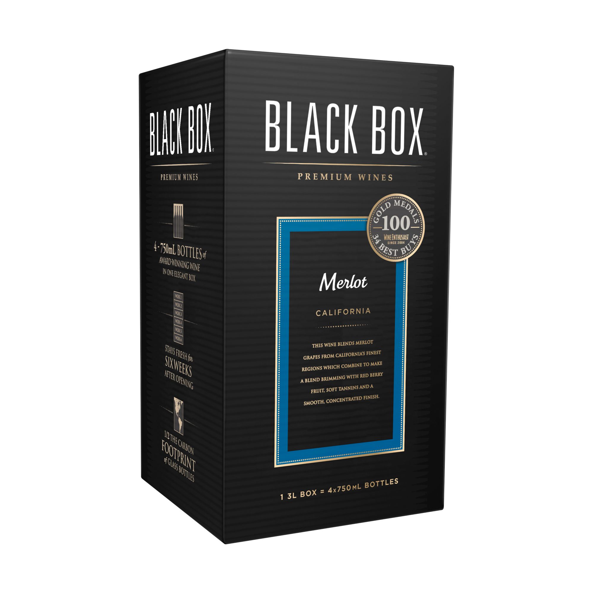 Hints of plum, black cherry, and baking spices unfold smoothly across the palate with soft tannins and supple acidity. A medium-bodied California red wine, Black Box Merlot boxed wine pairs heartily with grilled duck, pork roast, and tomato sauces.