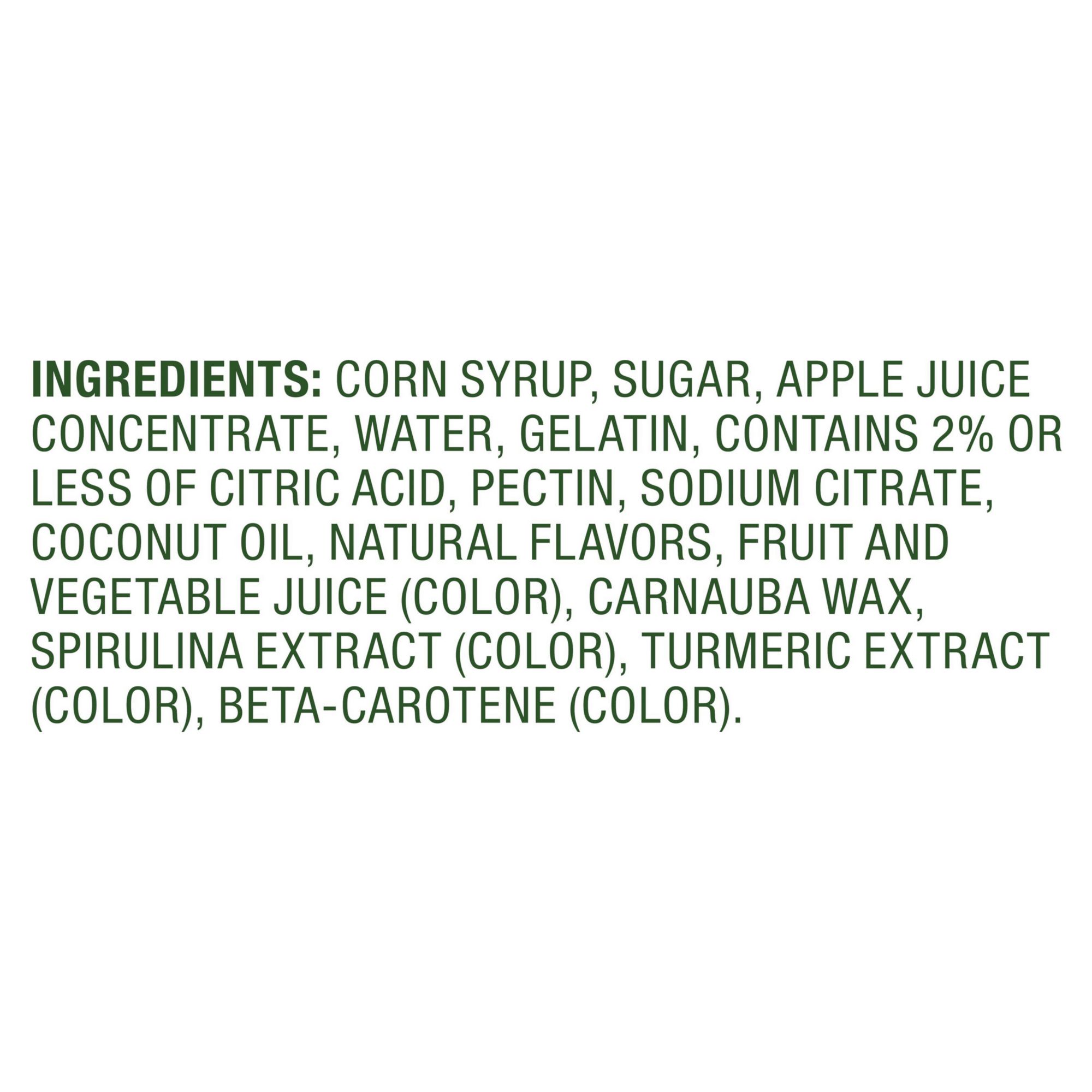 Ingredients: Corn Syrup, Sugar, Apple Juice Concentrate, Water, Gelatin, Contains 2% Or Less Of Citric Acid, Pectin, Sodium Citrate, Coconut Oil, Natural Flavors, Fruit And Vegetable Juice (Color), Carnauba Wax, Spirulina Extract (Color), Turmeric Extract (Color), Beta-carotene (Color).