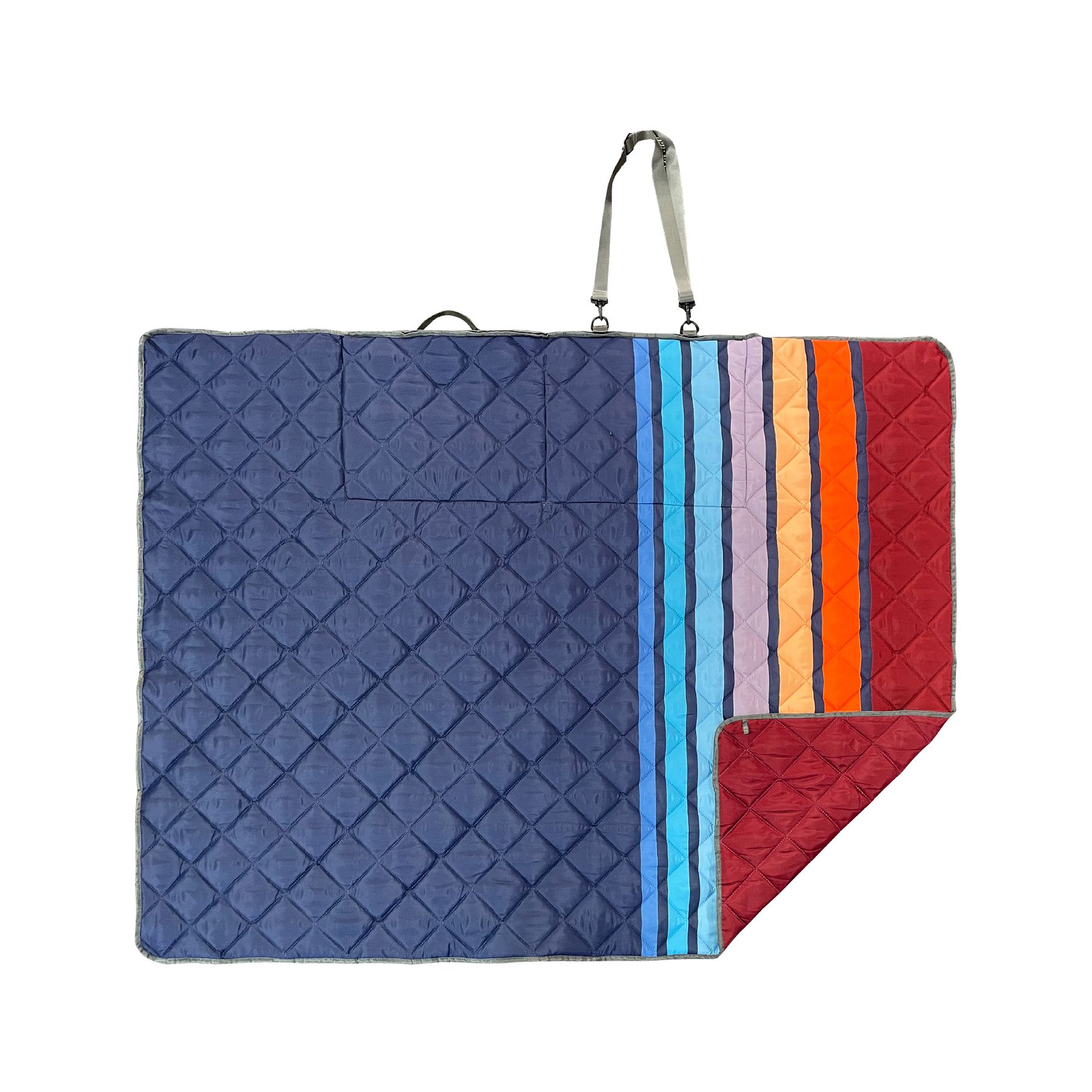 This outdoor packable blanket features a self-packing design with an adjustable and removable carrying strap, plus deep front and back storage pockets. Folds down to a compact size. There are corner stake loops sewn into the blanket for securing the blanket. Water-resistant material to keep you comfortable and dry.