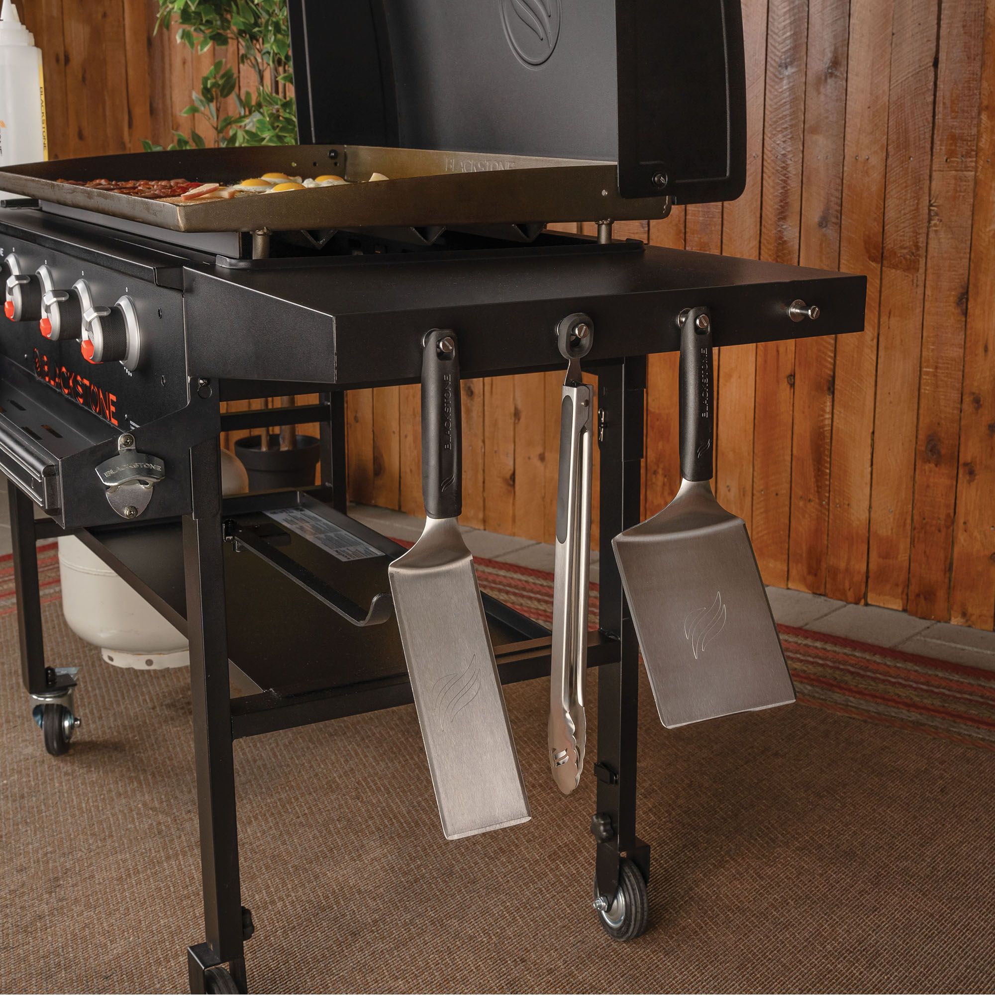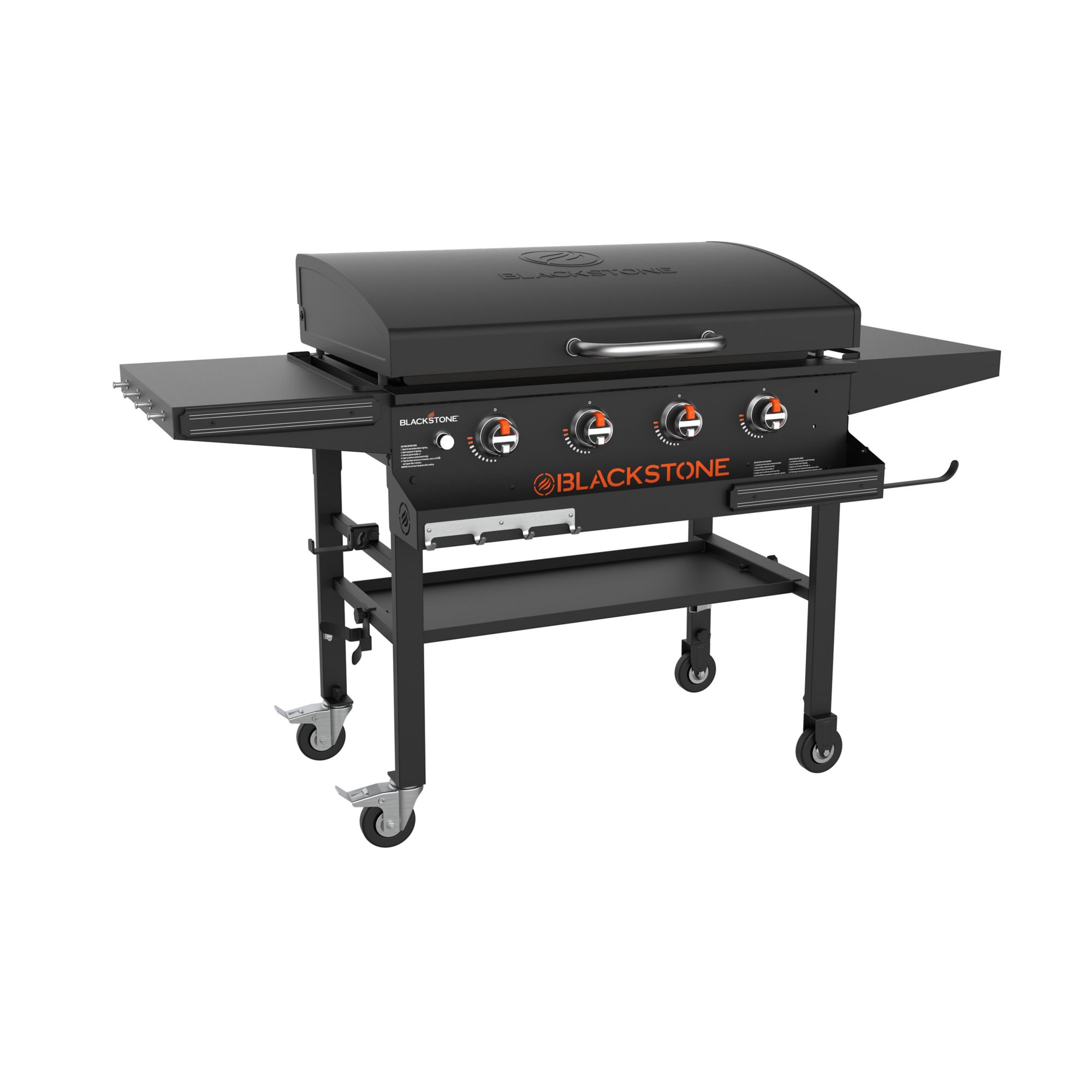 There's nothing like cooking with friends and family around a large 36" Blackstone Griddle. This BJ's exclusive model provides 769 sq. inches of cooking space so that you'll have more than enough room to make all your favorite meals - breakfast, lunch or dinner! Simple and sleek, this all-black griddle features everything that a kitchen on the deck might need. The integrated hood works as a cover to protect your griddle from the elements as well as a basting dome to help steam and evenly cook your food. Horizontally level shelves keep everything at your fingertips. Sturdy locking wheels offer easy moving and placement. This set also includes a paper towel holder with an added front shelf for bonus storage. The front shelf has tool hooks and a magnetic strip for cutlery (cutlery not included). Finally, a weather resistant cover keeps everything safe, neat and tidy. The griddle capacity gives plenty of space.