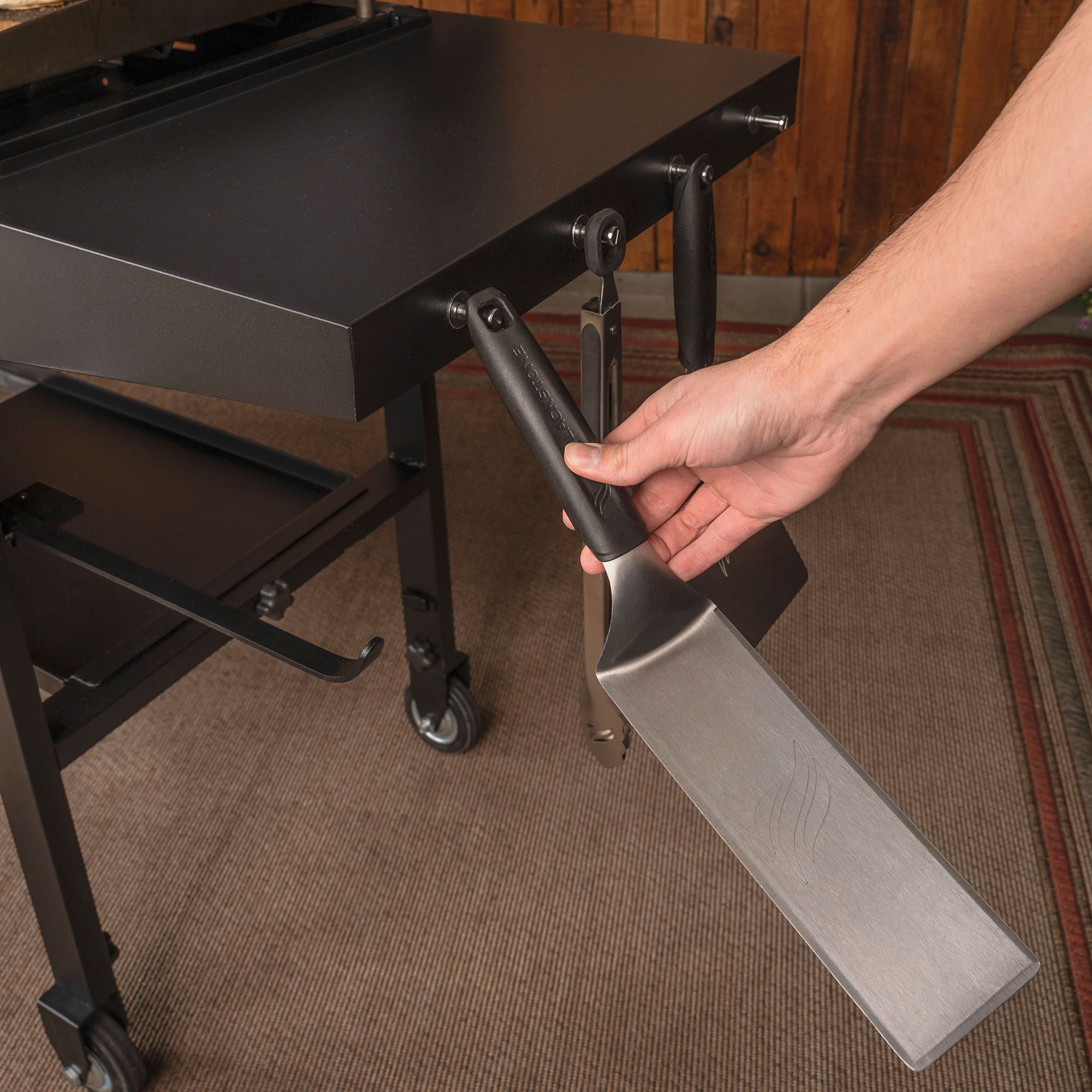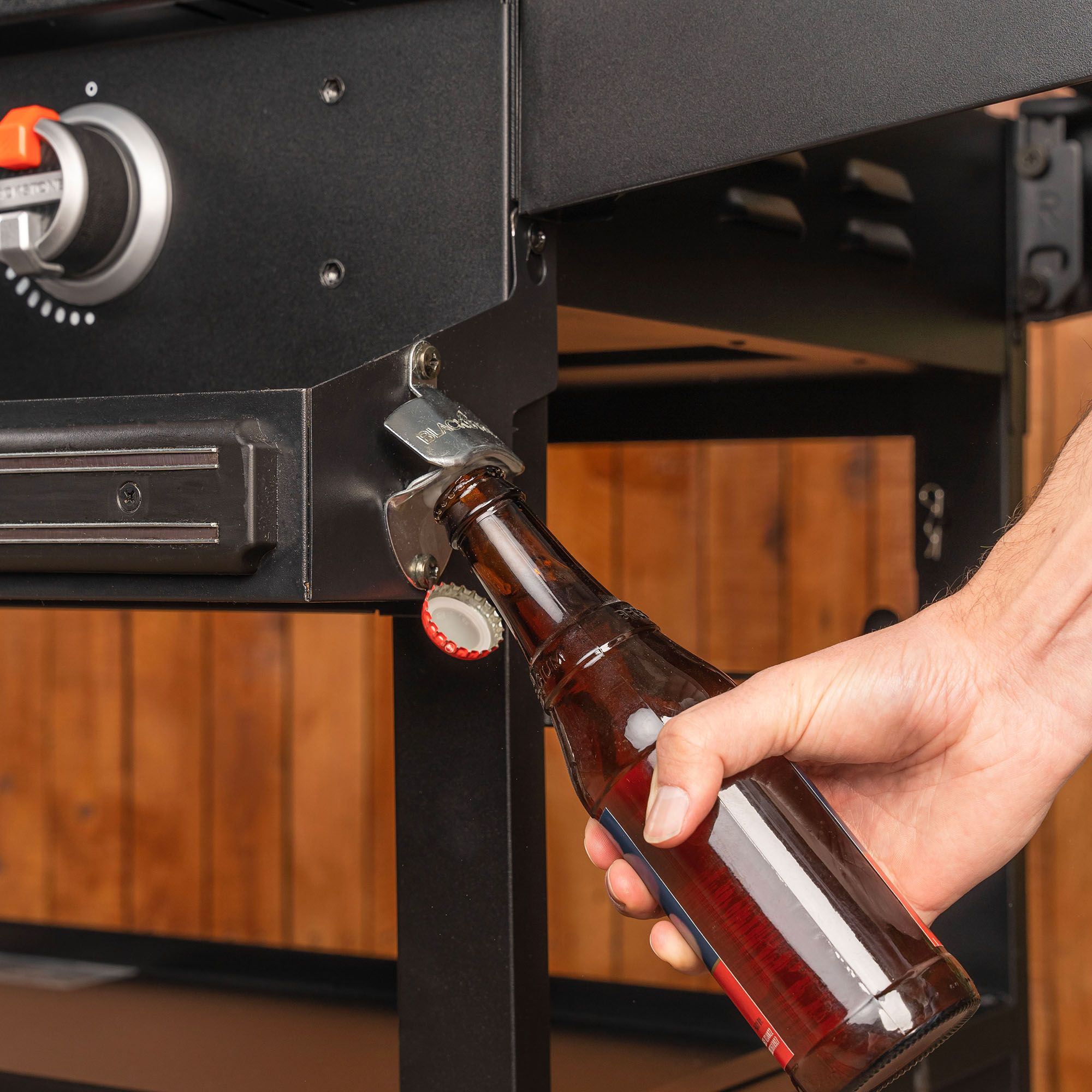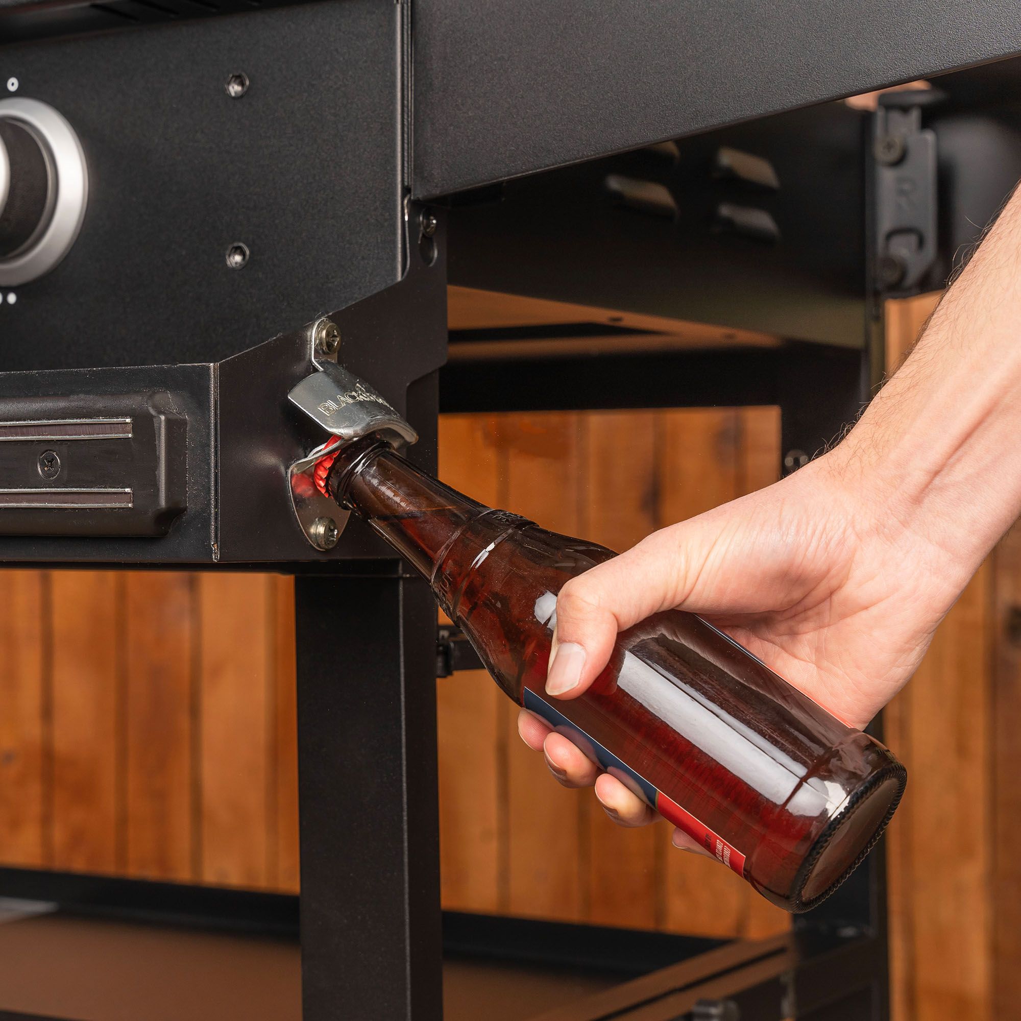 - Magnetic utensil retention strips for added tool storage plus four tool hook holders and a bottle opener