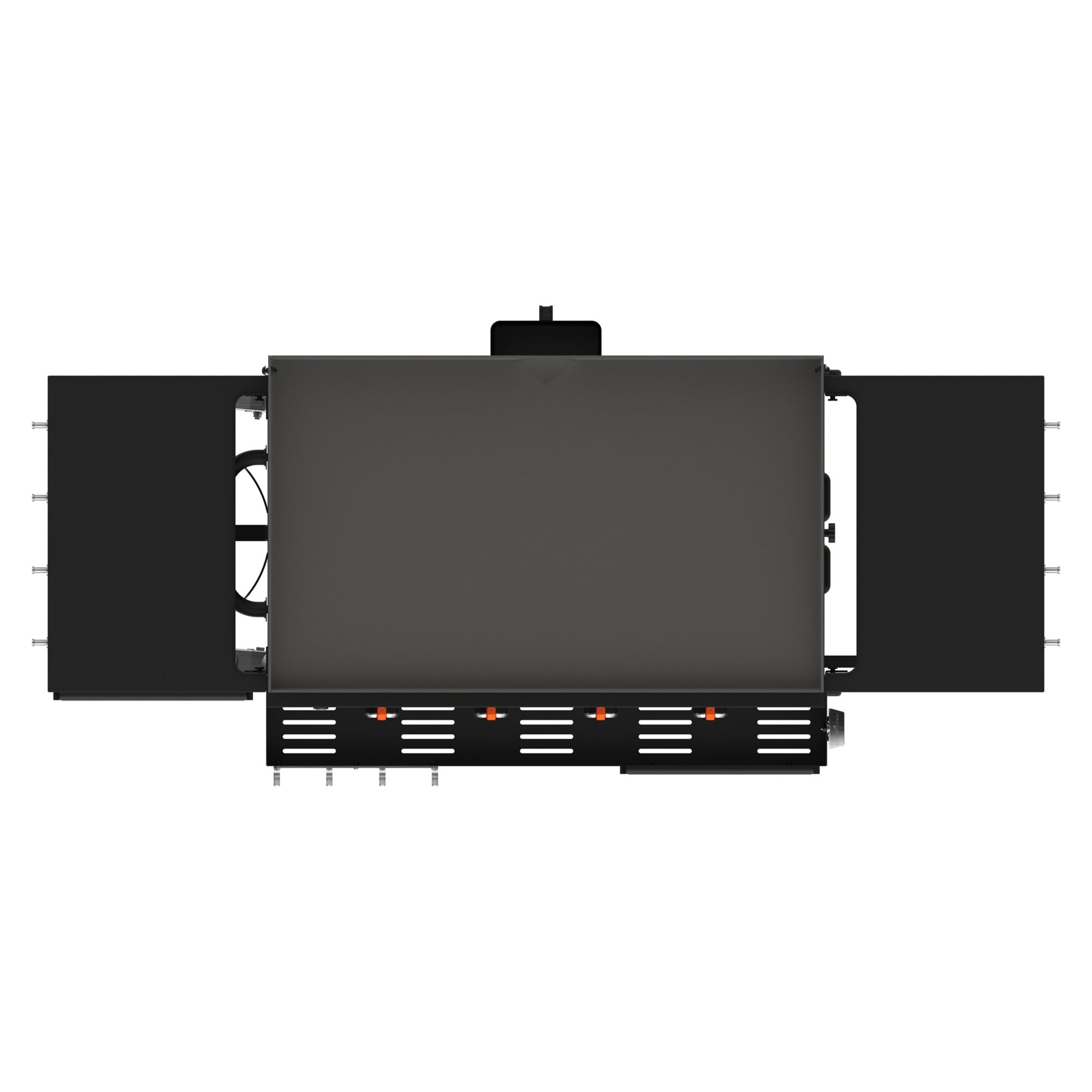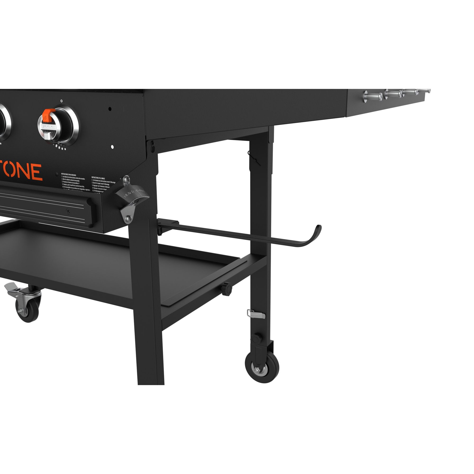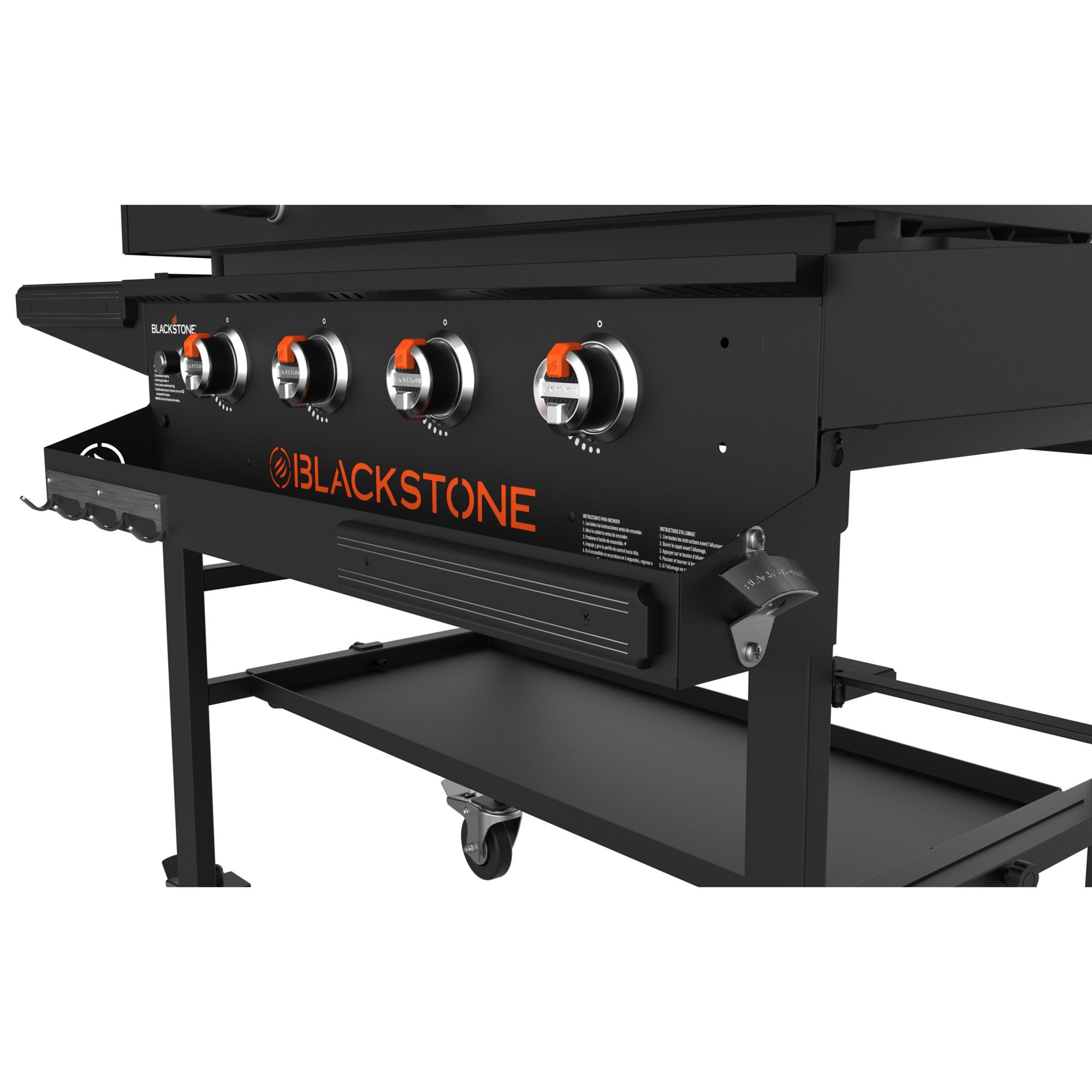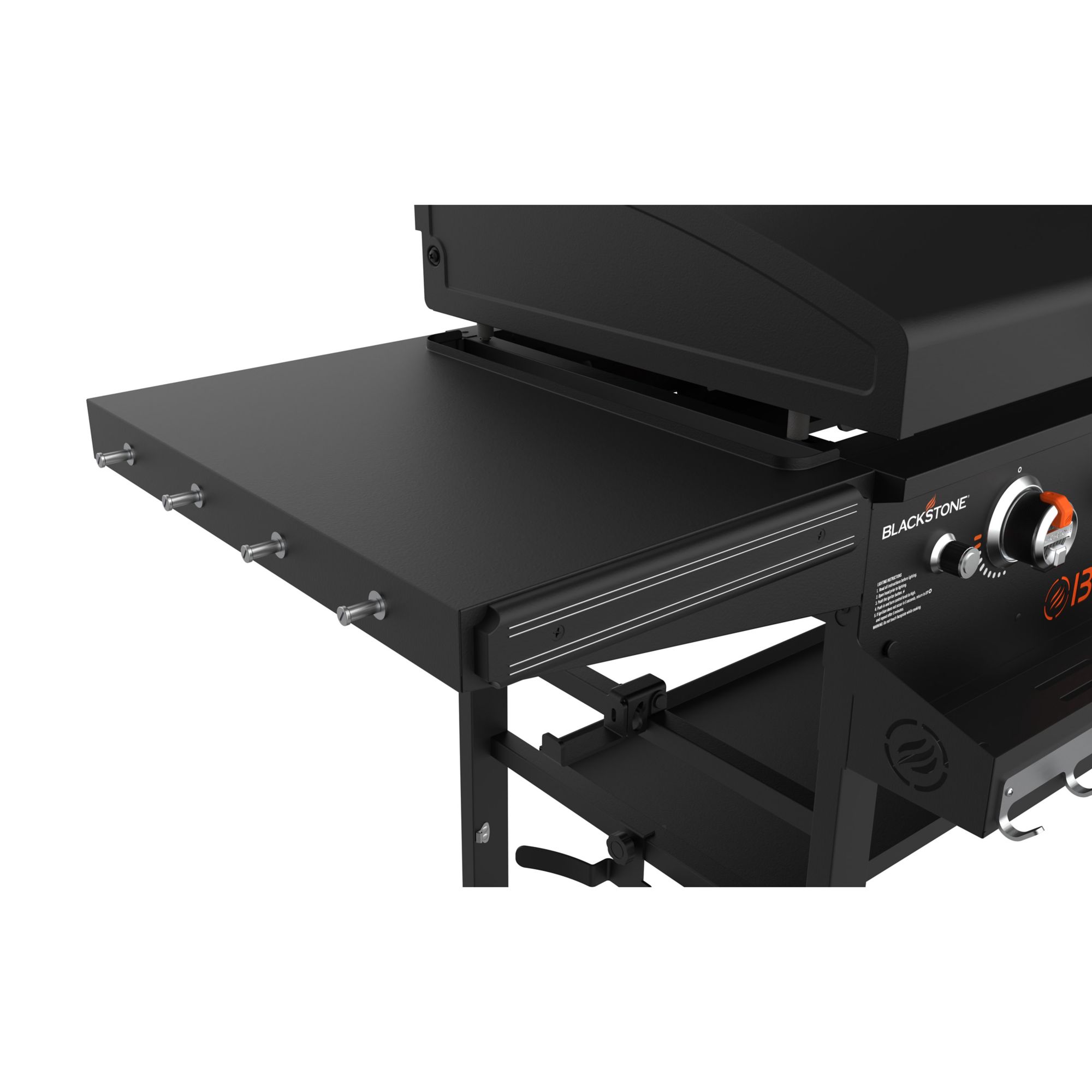 - 36" griddle with integrated hood, front shelf, dual horizontal folding shelves, underneath shelf and custom fit griddle cover