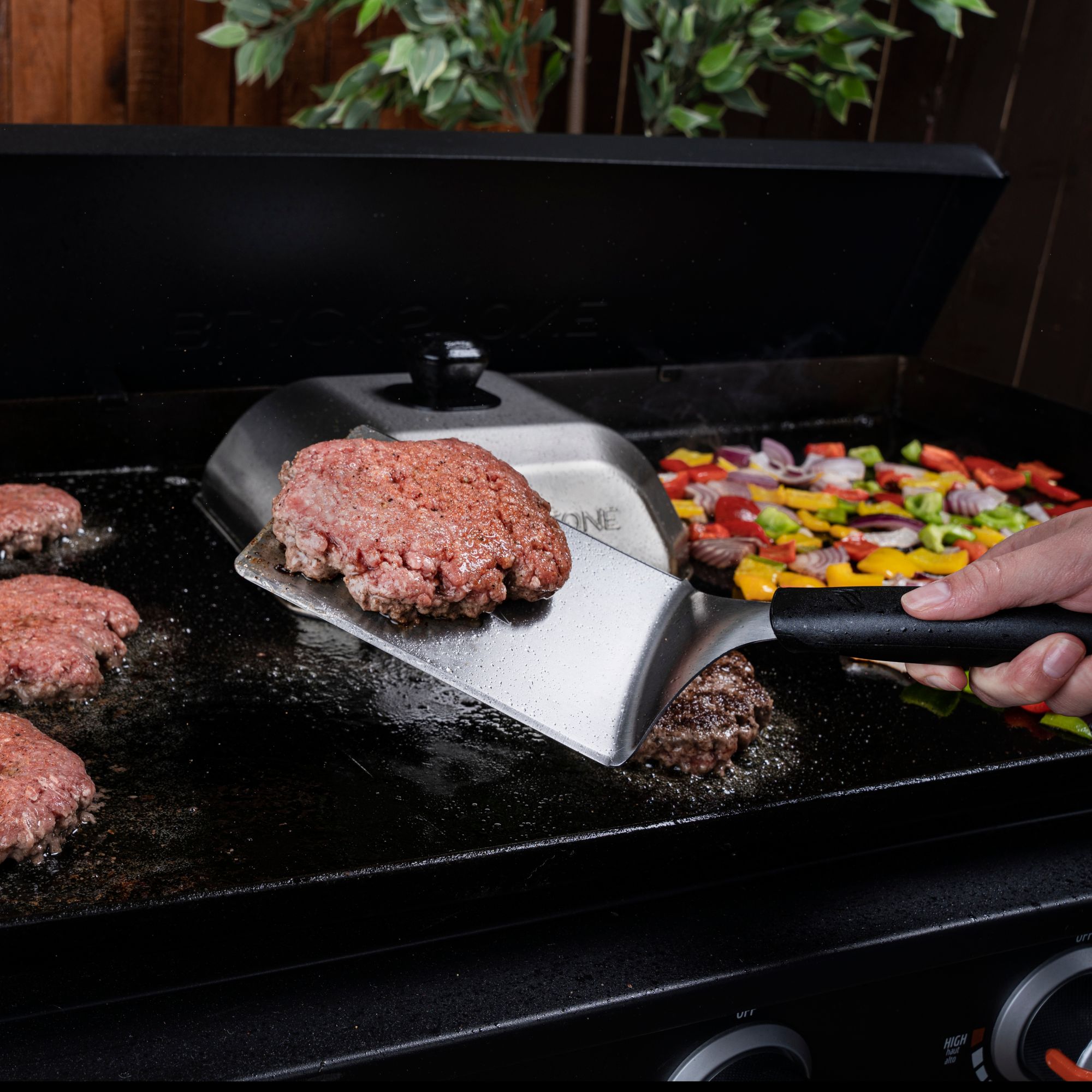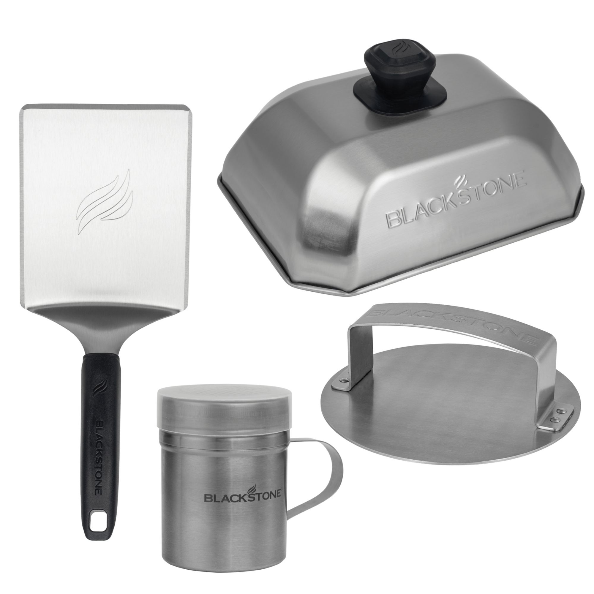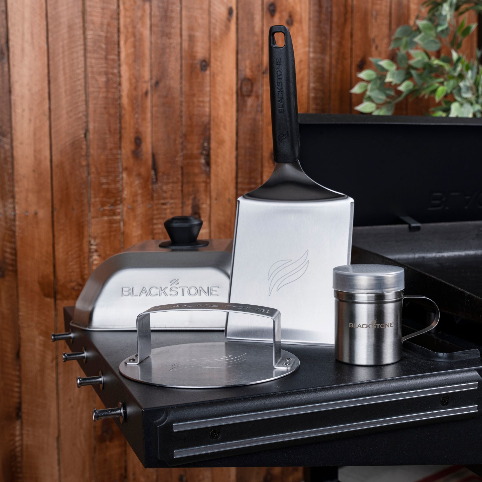 The Blackstone Ultimate Burger Kit is made to smash, flip, steam and season your burgers to perfection! Your burgers will be the envy of the neighborhood with this kit. The kit features a large hamburger spatula, burger press, spice dredge and basting dome. These specifically selected tools are designed to help you build the perfect smash burger with the burger press. Make luscious cheeseburgers under the basting dome. Season your burger just right with the spice dredge. Flip your burger over without it falling to pieces with the heavy duty, extra wide burger spatula. All pieces are dishwasher safe for easy clean-up.