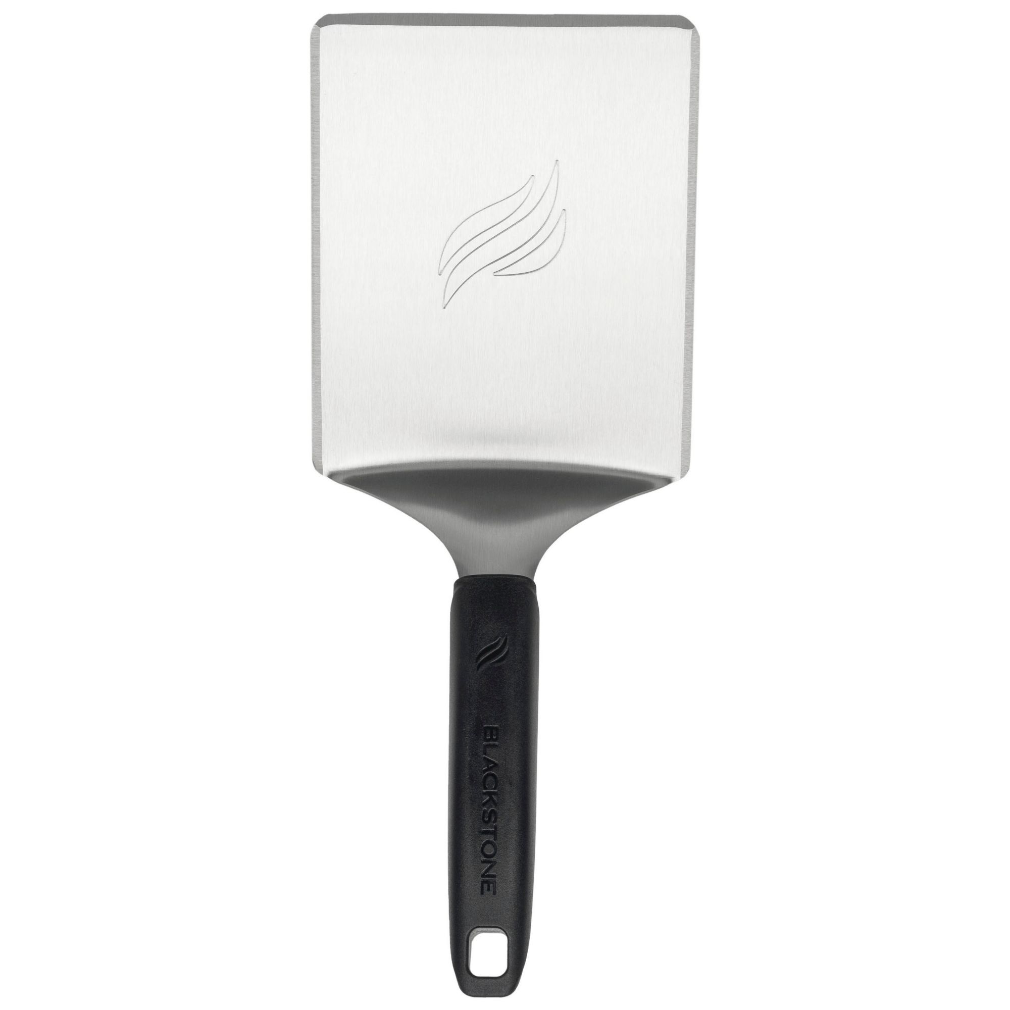 Hamburger spatula is made of stainless steel and features a heat resistant handle, is heavy duty and extra wide
