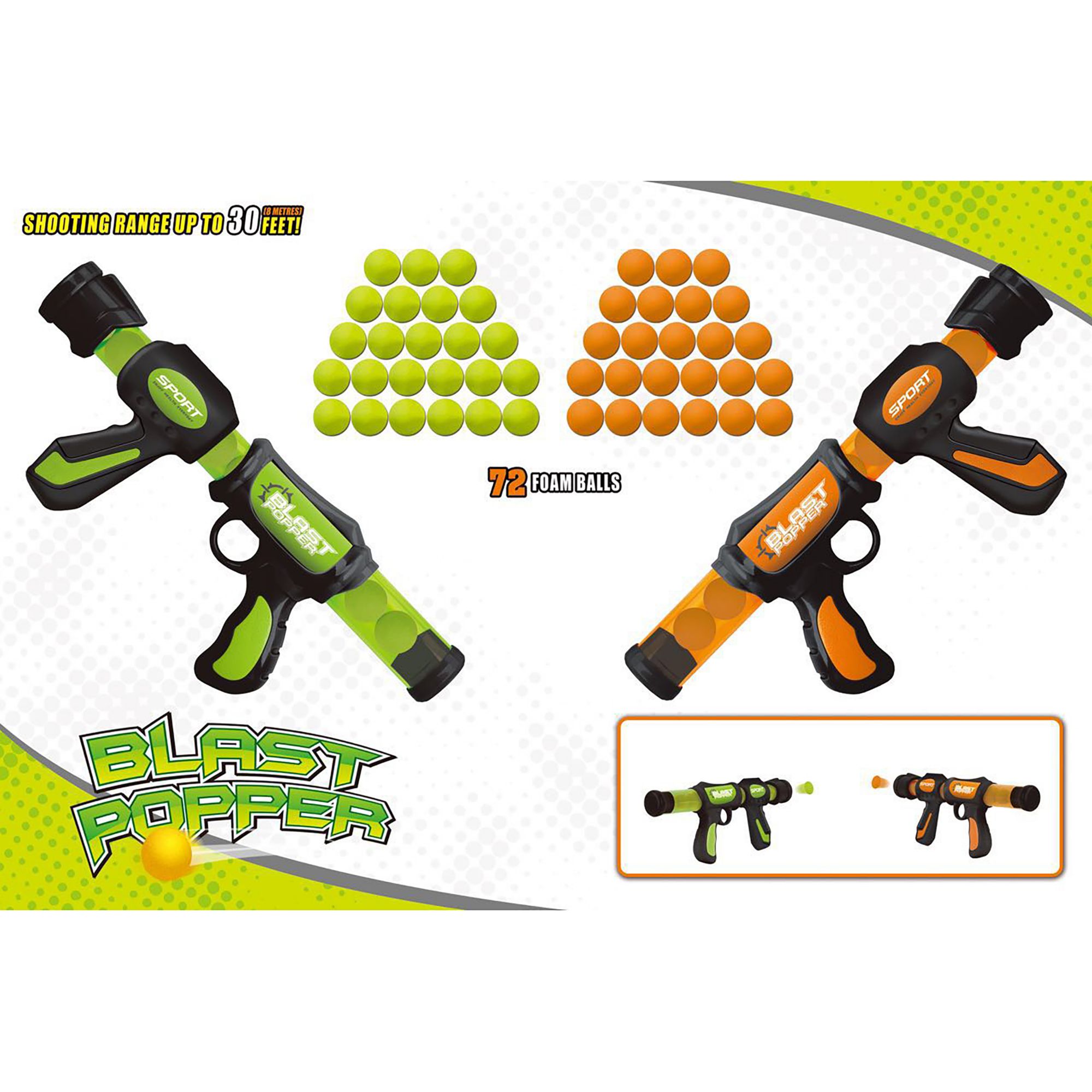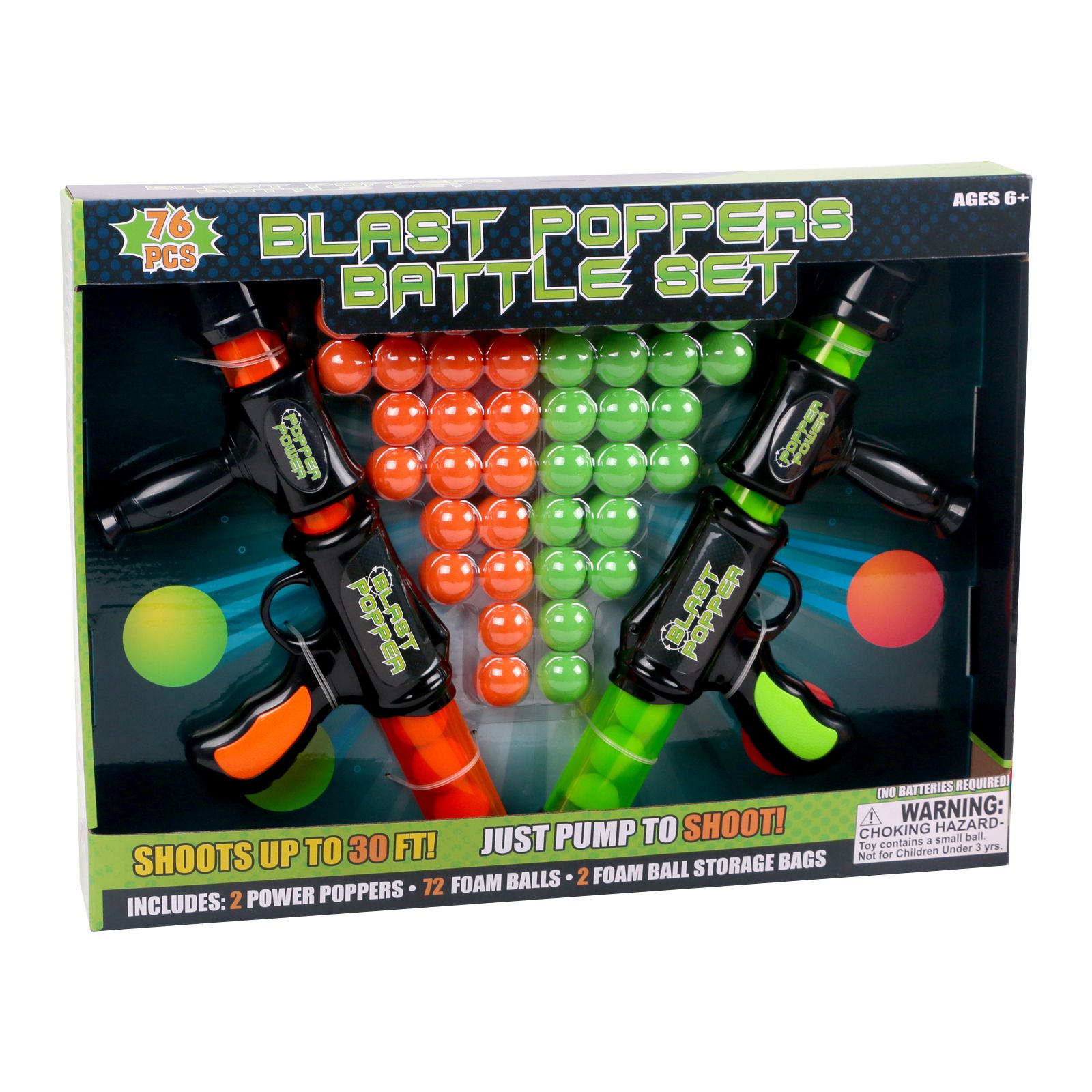 Blast Popper set Indoor and outdoor set Family fun Foam balls are safe and won't hurt Includes two double handle Blast Poppers and 72 foam balls