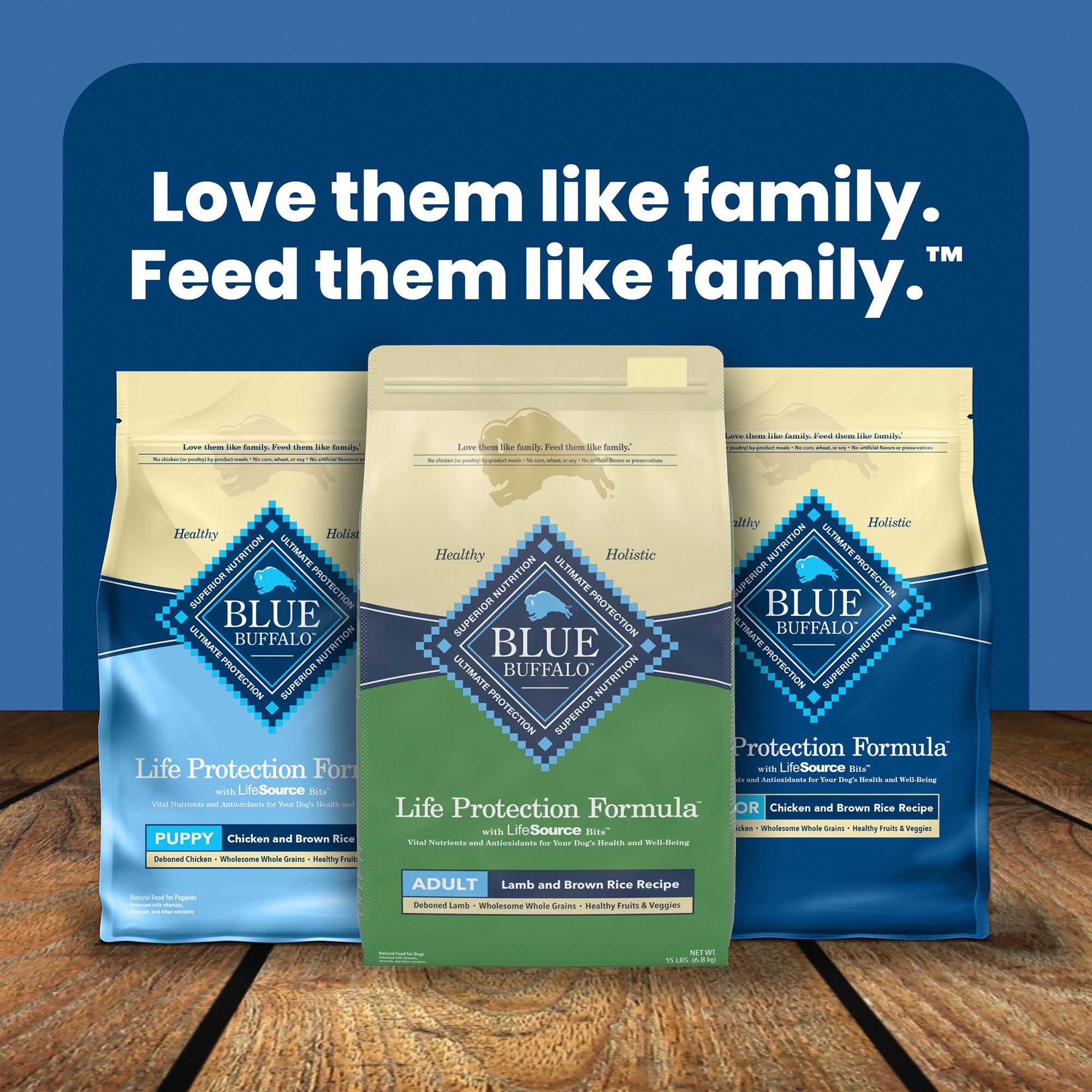 Blue Buffalo foods always feature real meat as the first ingredient; High-quality protein from real lamb helps your dog build and maintain healthy muscles; Plus they contain wholesome whole grains, garden veggies and fruit Blue dry dog food is made with the finest natural ingredients enhanced with vitamins and minerals; Blue contains no chicken (or poultry) by-product meals, corn, wheat, soy, artificial flavors or preservatives Blue Life Protection Formula adult dog food contains essential proteins and carbohydrates to help meet the energy needs of adult dogs, and features omega 3 and 6 fatty acids to promote a shiny coat and healthy skin A precise blend of antioxidants, vitamins and minerals carefully selected by holistic veterinarians and animal nutritionists to support immune system health, life stage needs and a healthy oxidative balance Enhanced Imagery: Digital product packaging has been enhanced to highlight products’ ingredients and essential benefits; while the physical packaging will differ slightly, all information is accurate Includes one 36-lb. bag of Blue Life Protection Formula Natural Lamb and Brown Rice Flavor