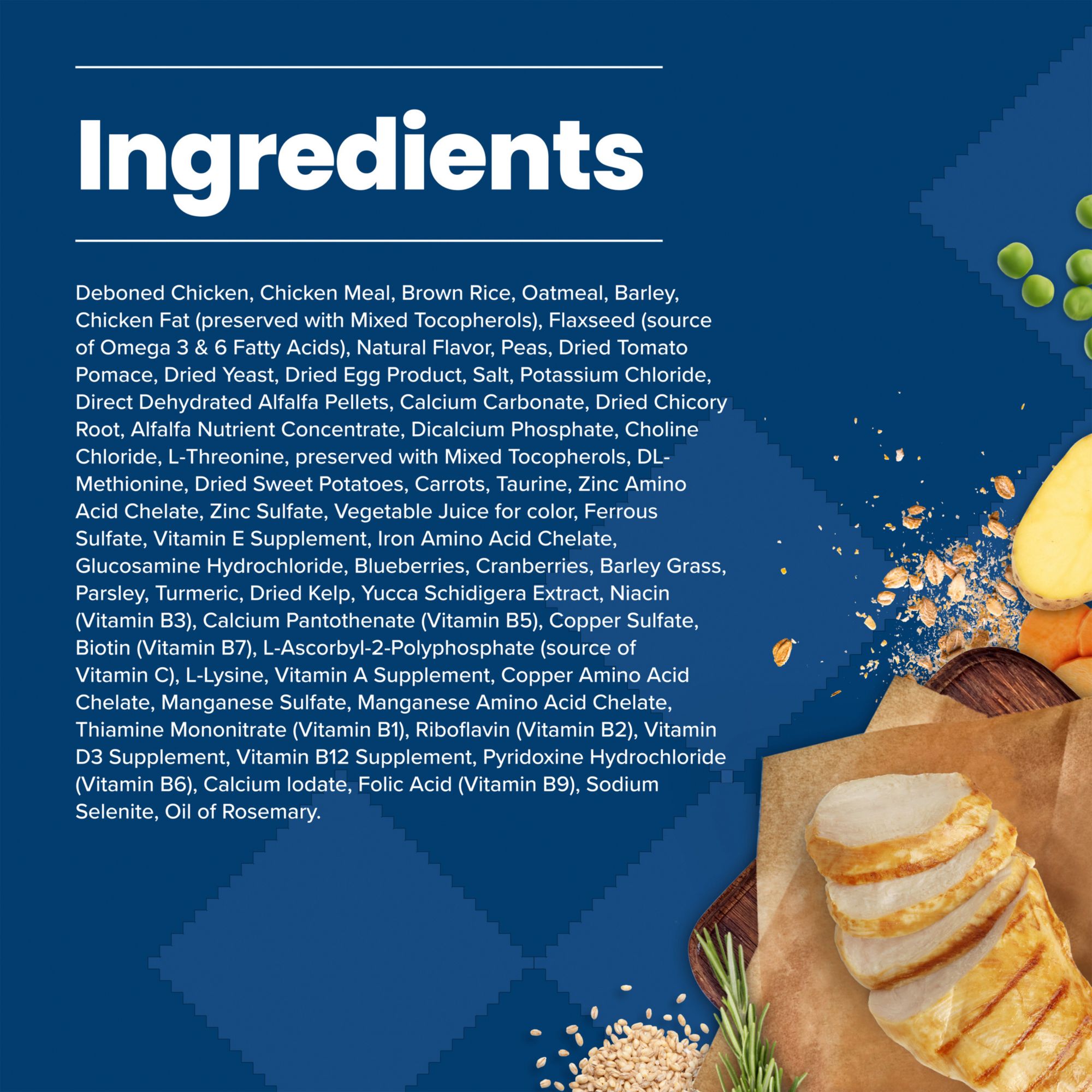 Deboned Chicken, Chicken Meal, Brown Rice, Oatmeal, Barley, Chicken Fat (preserved with Mixed Tocopherols), Flaxseed (source of Omega 3 & 6 Fatty Acids), Natural Flavor, Peas, Dried Tomato Pomace, Dried Yeast, Dried Egg Product, Salt, Potassium Chloride, Direct Dehydrated Alfalfa Pellets, Calcium Carbonate, Dried Chicory Root, Alfalfa Nutrient Concentrate, Dicalcium Phosphate, Choline Chloride, L-Threonine, preserved with Mixed Tocopherols, DL-Methionine, Dried Sweet Potatoes, Carrots, Taurine, Zinc Amino Acid Chelate, Zinc Sulfate, Vegetable Juice for color, Ferrous Sulfate, Vitamin E Supplement, Iron Amino Acid Chelate, Glucosamine Hydrochloride, Blueberries, Cranberries, Barley Grass, Parsley, Turmeric, Dried Kelp, Yucca Schidigera Extract, Niacin (Vitamin B3), Calcium Pantothenate (Vitamin B5), Copper Sulfate, Biotin (Vitamin B7), L-Ascorbyl-2-Polyphosphate (source of Vitamin C), L-Lysine, Vitamin A Supplement, Copper Amino Acid Chelate, Manganese Sulfate, Manganese Amino Acid Chelate, Thiamine Mononitrate (Vitamin B1), Riboflavin (Vitamin B2), Vitamin D3 Supplement, Vitamin B12 Supplement, Pyridoxine Hydrochloride (Vitamin B6), Calcium Iodate, Folic Acid (Vitamin B9), Sodium Selenite, Oil of Rosemary.