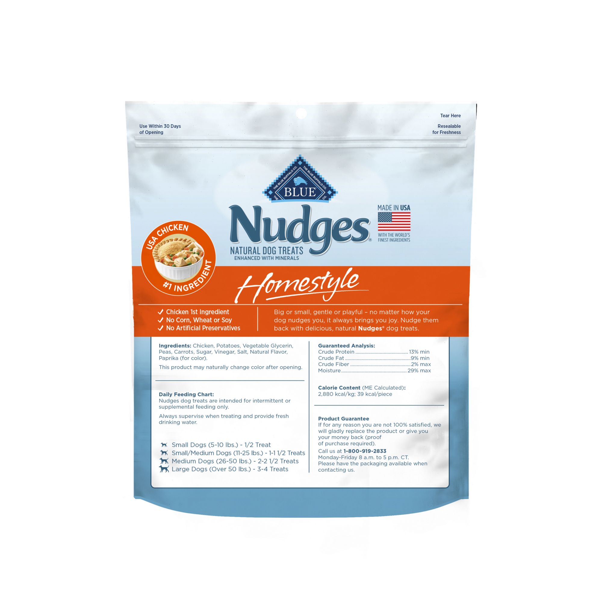 Nudges are now part of the Blue Buffalo family; Same great taste and healthy ingredients, now backed by the True Blue Promise Blue Nudges Homestyle treats are made with tasty real chicken as the first ingredient for a flavor your dog will savor Generous cuts and chewy, natural goodness make these homestyle dog treats a great reward or snack Blue foods and treats are formulated with the finest natural ingredients, with no chicken by-product meals, no corn, wheat or soy, and no artificial flavors or preservatives Enhanced Imagery: Digital product packaging has been enhanced to highlight products’ ingredients and essential benefits. While the physical packaging will differ slightly, all information is accurate Includes one 40 oz. bag of dog treats