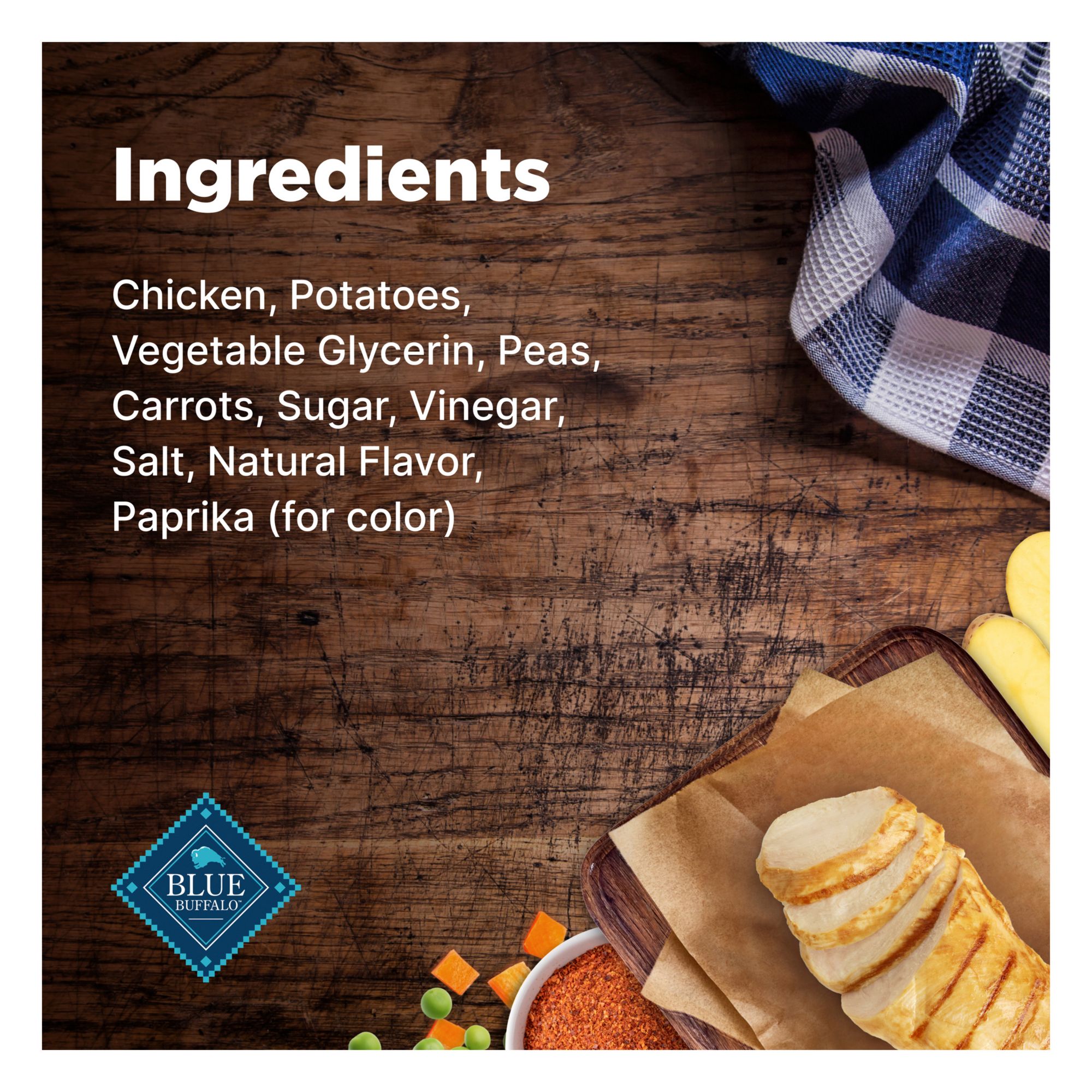 Chicken, Potatoes, Vegetable Glycerin, Peas, Carrots, Sugar, Vinegar, Salt, Natural Flavor, Paprika (for color).