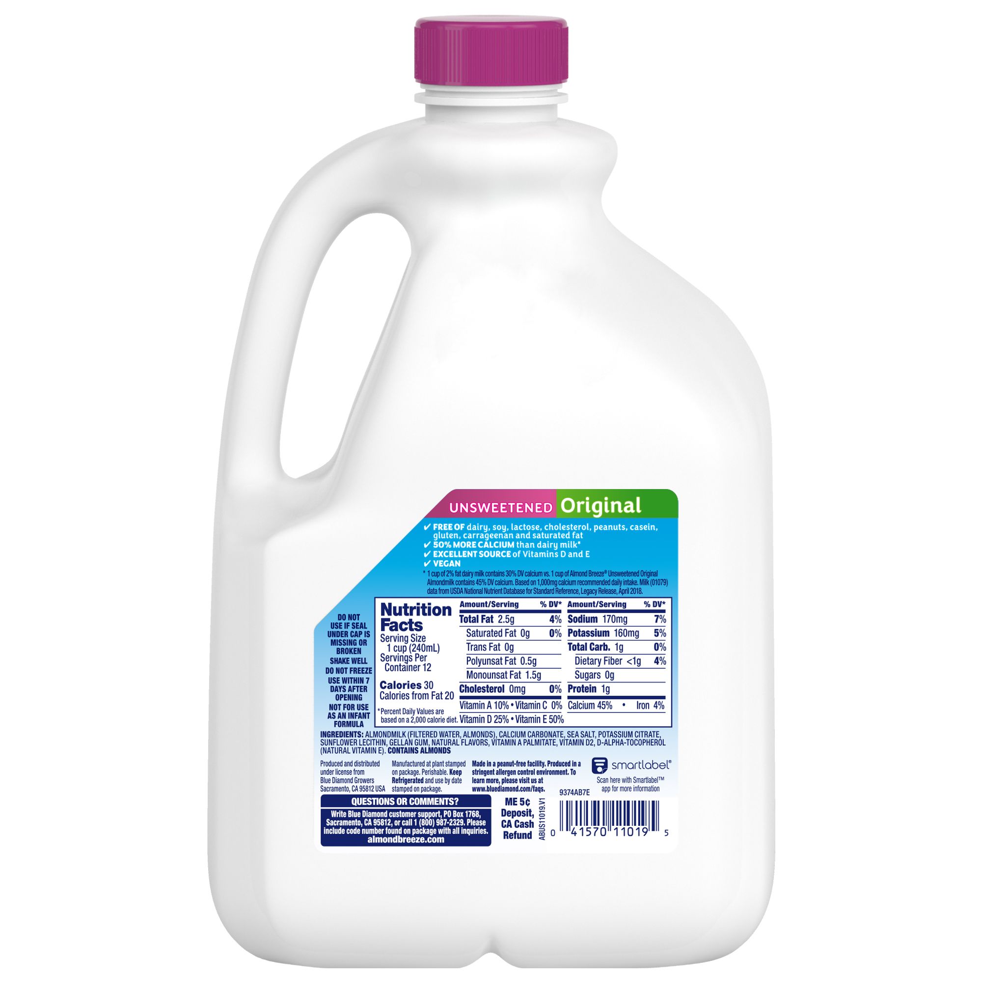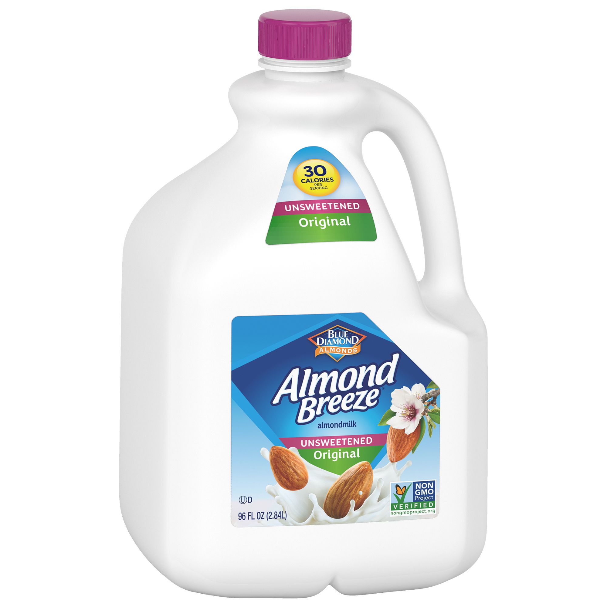 The unsweetened version of Almond Breeze Original provides a touch of the almond's natural sweetness, but eliminates the added sugar. Each serving is an excellent source of Vitamin D and E with no added sugar. Blue Diamond Almond Milk comes with 30 calories per serving.
