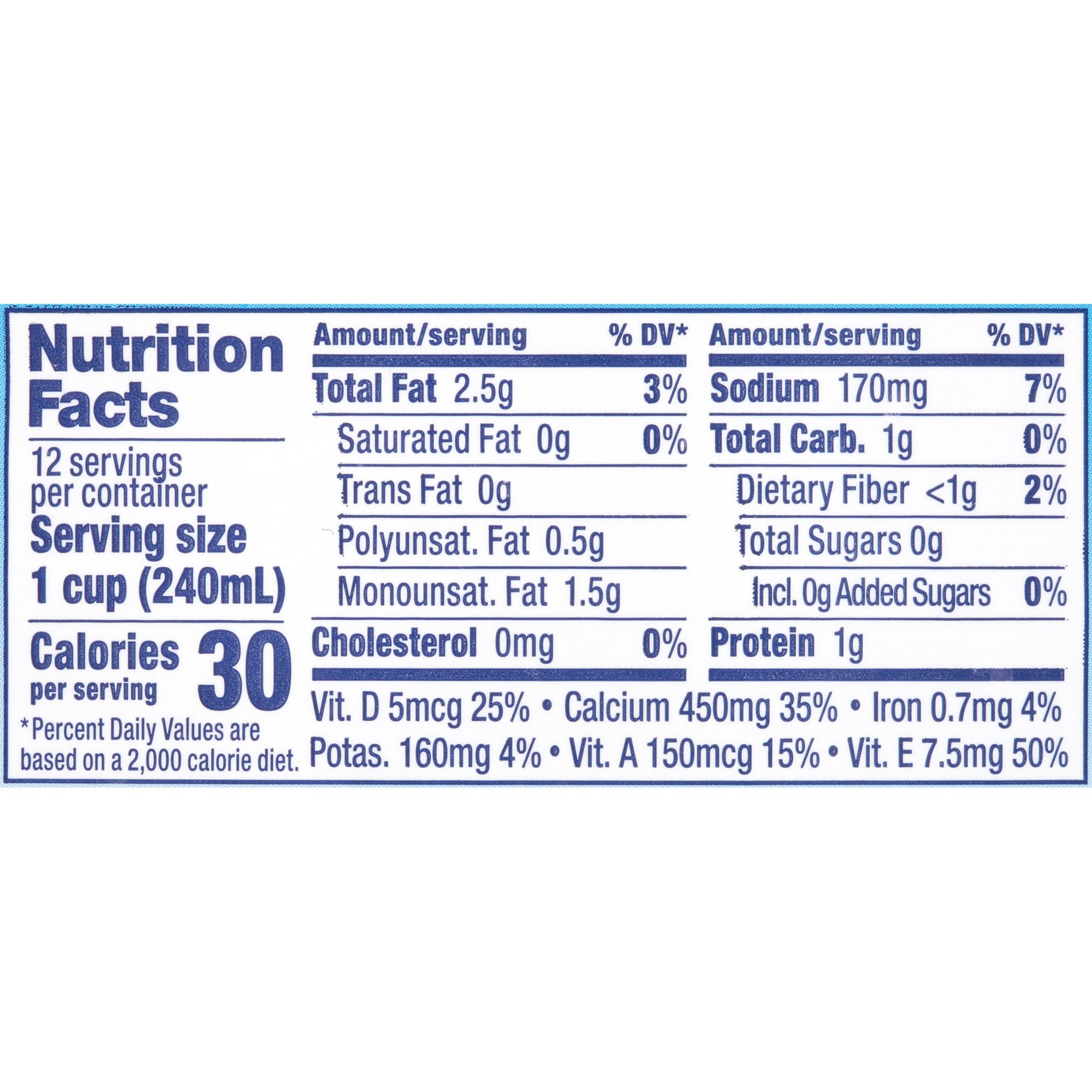 50% more calcium than dairy milk Excellent source of Vitamin D and E No added sugar 30 calories per serving Lactose-free Dairy-free Soy-free