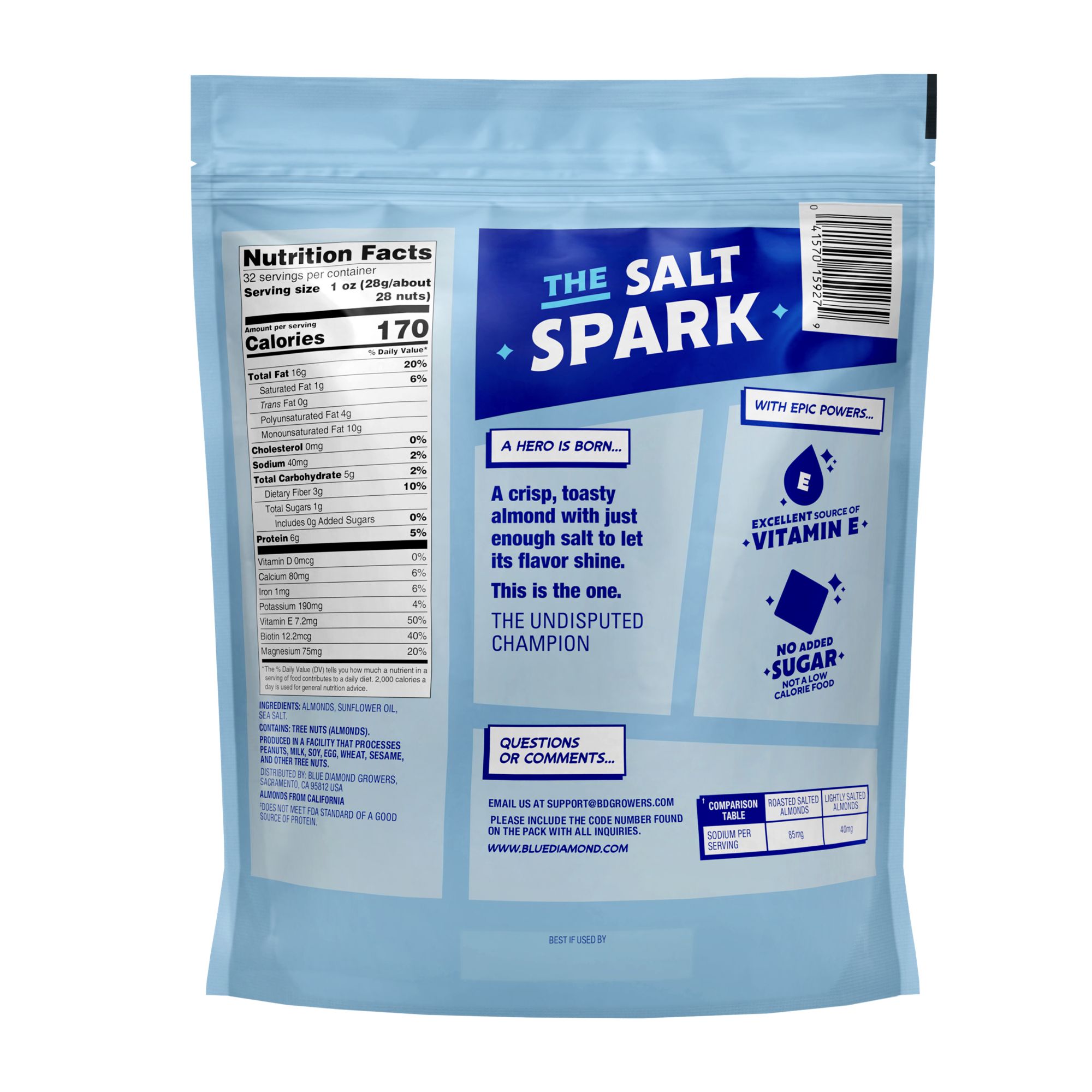 This is the one! A crisp, toasty almond with just enough salt to let its flavor shine. Being good to your body doesn't mean you have to sacrifice flavor. A healthy handful of 28 Lightly Salted premium almonds contains just 40mg of sodium, provides 6g of protein, is an excellent source of Vitamin E, and a good source of fiber. They are also gluten free, Certified Non-GMO, and Kosher. Blue Diamond Lightly Salted Almonds are Certified as meeting criteria for a Heart-Healthy Food by the American Heart Association. Since 1910 Blue Diamond Growers has been producing the finest quality almonds from orchards in the rich, fertile valleys of California.