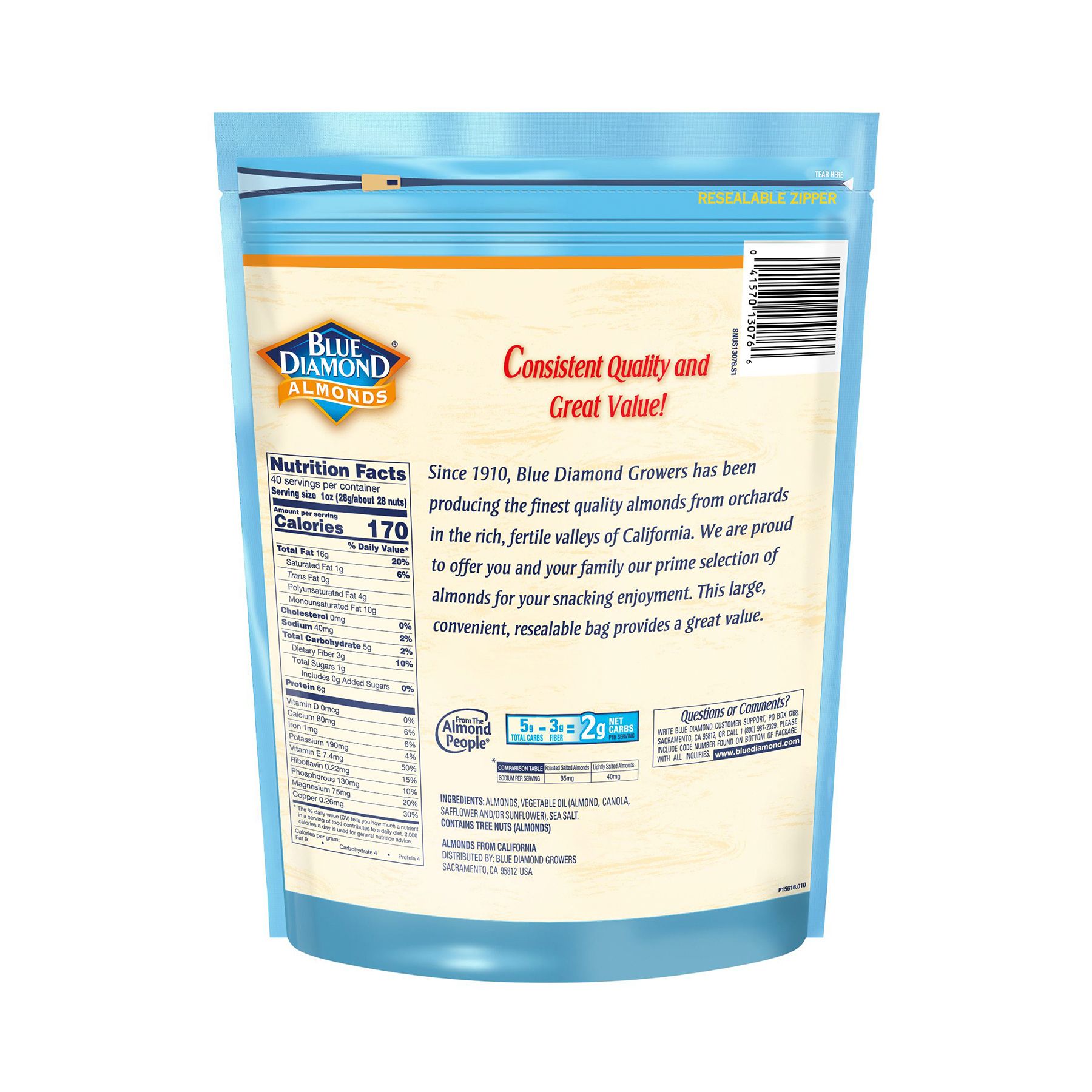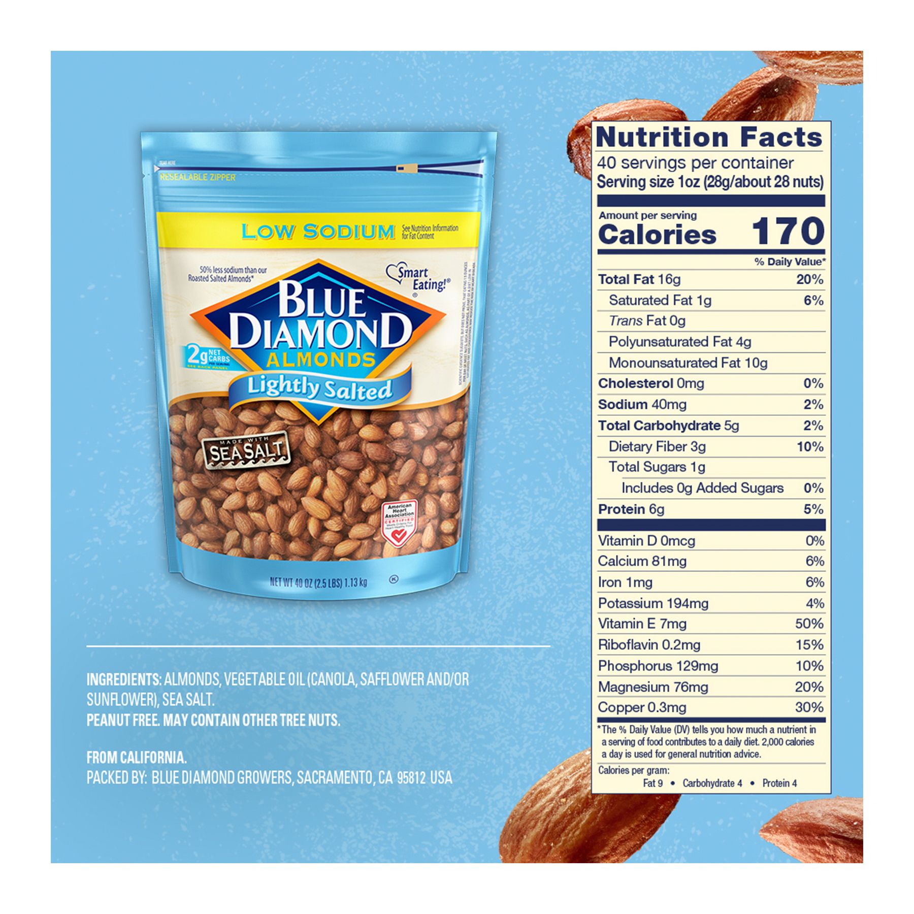 Being good to your body doesn't mean you have to sacrifice flavor. A healthy handful of 28 Lightly Salted premium almonds contains just 40mg of sodium - the right amount to bring out the almond taste without breaking your resolve to cut down on salt. They are also gluten-free, Certified Non-GMO, and Kosher. Since 1910 Blue Diamond Growers has been producing the finest quality almonds from orchards in the rich, fertile valleys of California.