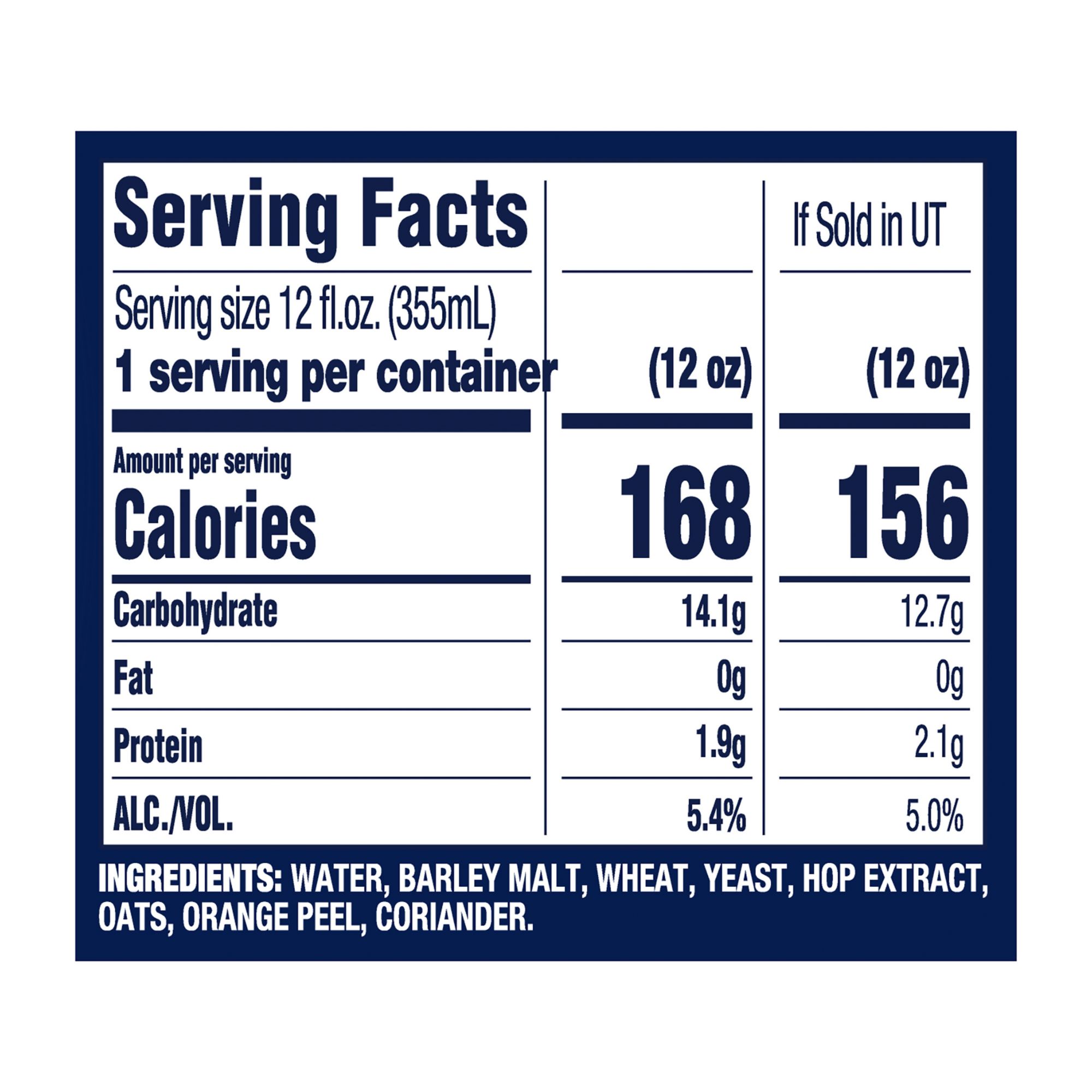 Ingredients: Water, Barley Malt, Wheat, Yeast, Hop Extract, Oats, Orange Peel, Coriander.