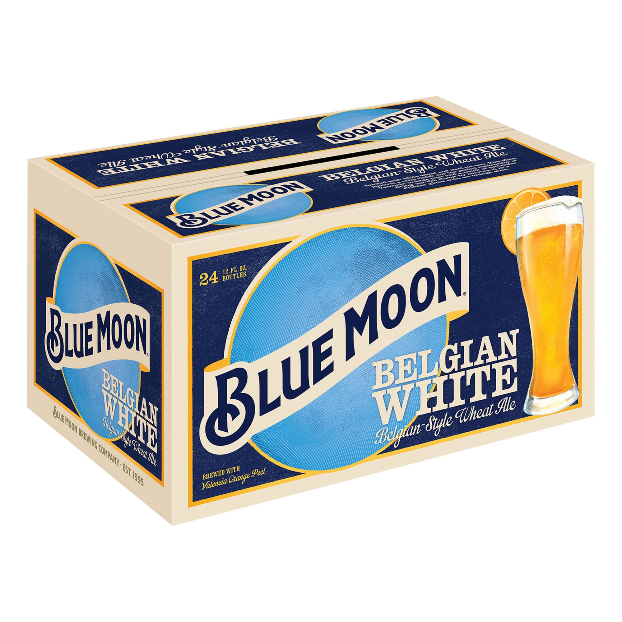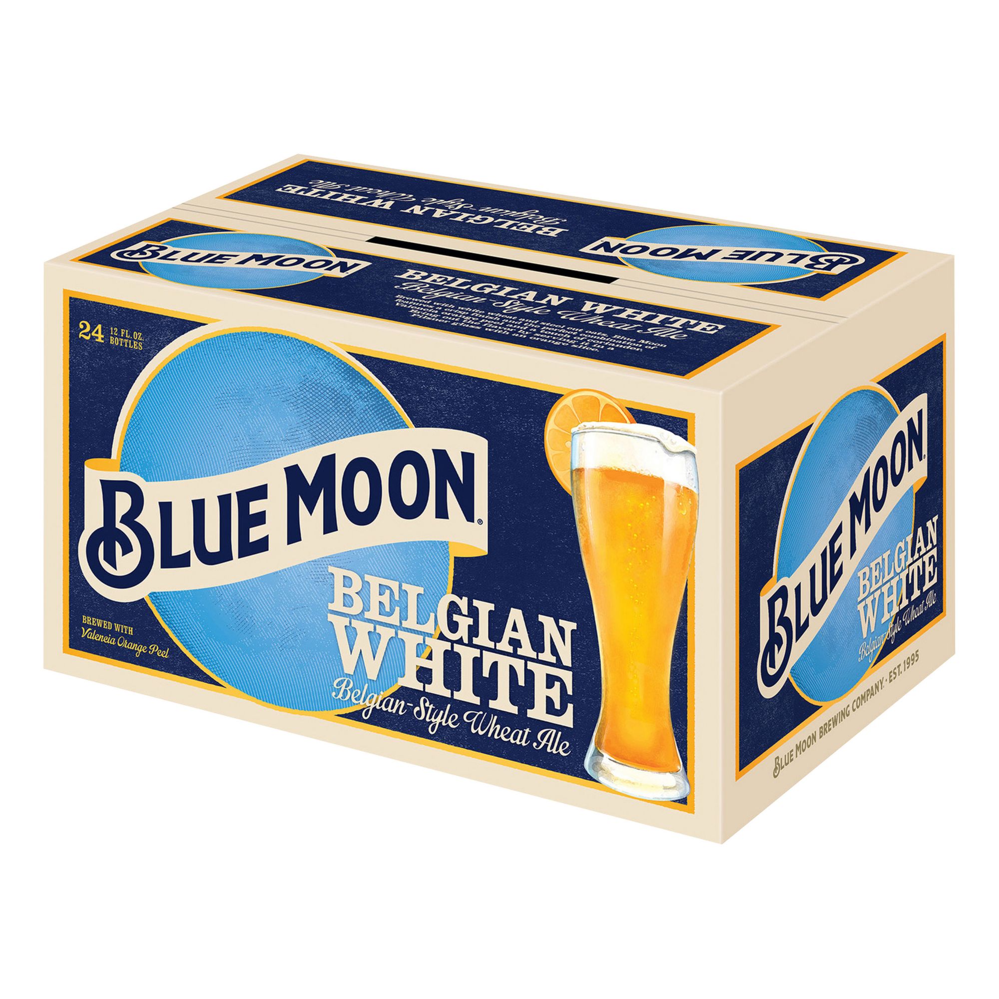 Belgian-style wheat ale. Brightly brewed with Valencia orange peel. Enjoy and serve an orange garnish. At Blue Moon Brewing Company, everything they do has a refreshing twist. From their first pour back in 1995 and up through today, they're dedicated to making every brew a little brighter. Established 1995.