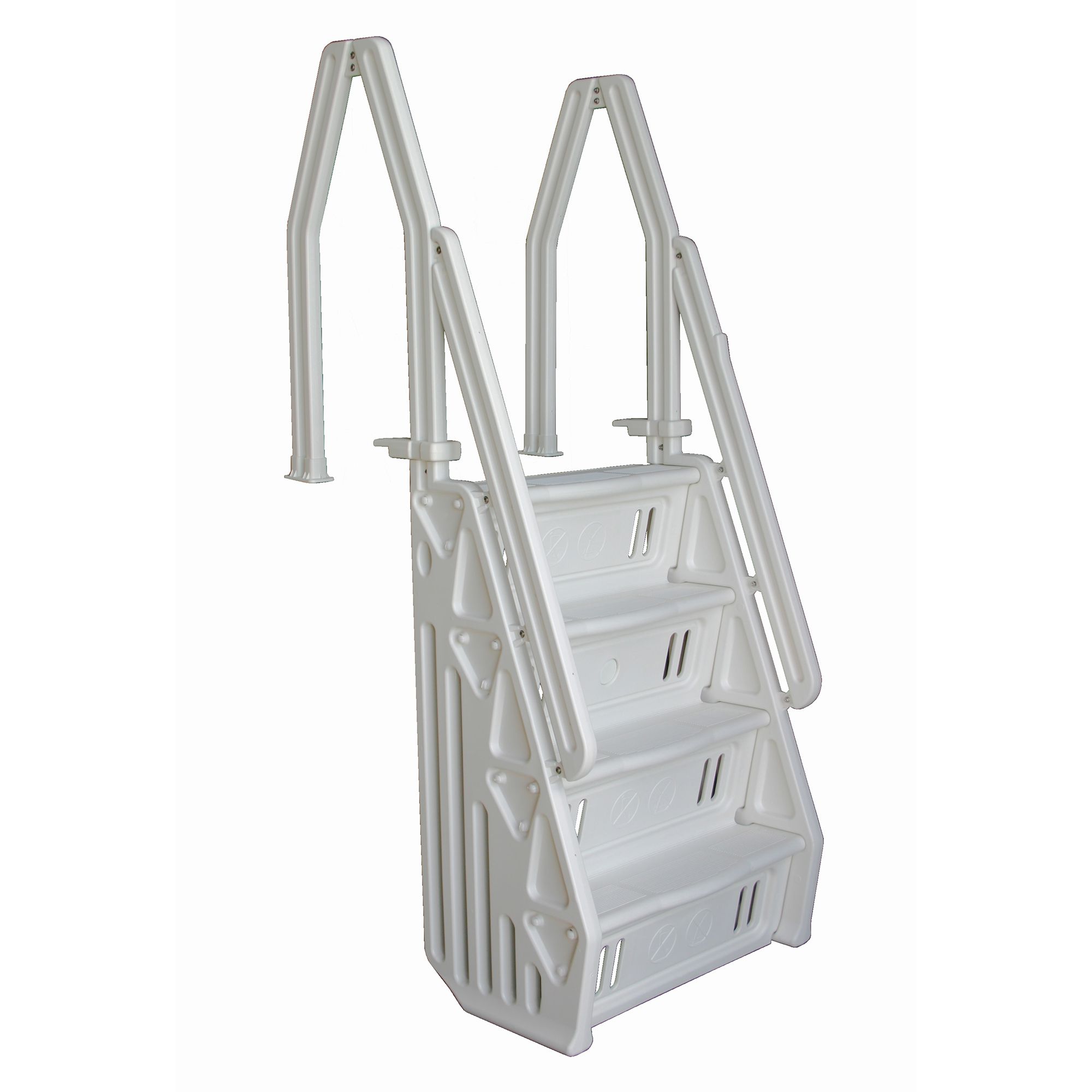 Fits aboveground swimming pools with deck heights from 46" to 60" Crafted from maintenance-free poly-resin components UV-resistant construction Dual-vent, flow-through design Extends only 22" into the swimming pool 32"-wide steps Dual extended handrails and anti-skid step treads Supports up to 300 lbs. Includes steps, stainless steel hardware, adjustable deck flanges and dual extended handrails Warranty: 5 years limited