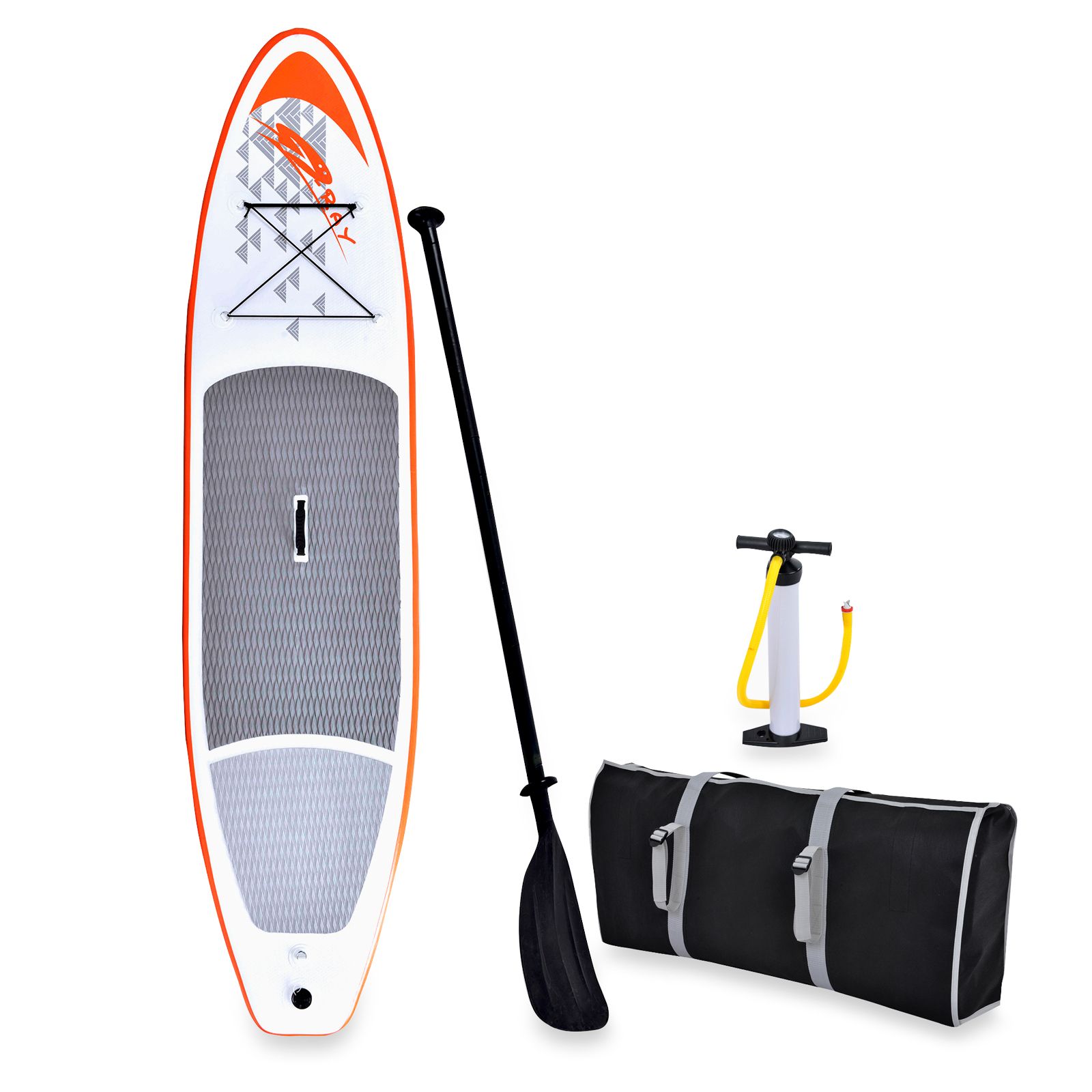 Great for cruising Multilayer, drop-stitched, high-pressure core construction with a double-layer outer skin Anti-slip EVA deck pad affords excellent control 3-piece paddle adjusts from 65" to 84.5" Center carry handle with built-in stainless steel D-rings and bungee cord High-pressure screw valve and wrench with included dual-action pump For riders up to 242 lbs. Includes a SUP board, a high-pressure air pump and valve, a 3-piece paddle, a removable center tracking fin, bungee tie-down rings, a repair kit and a polyethylene bag Warranty: 1 year limited