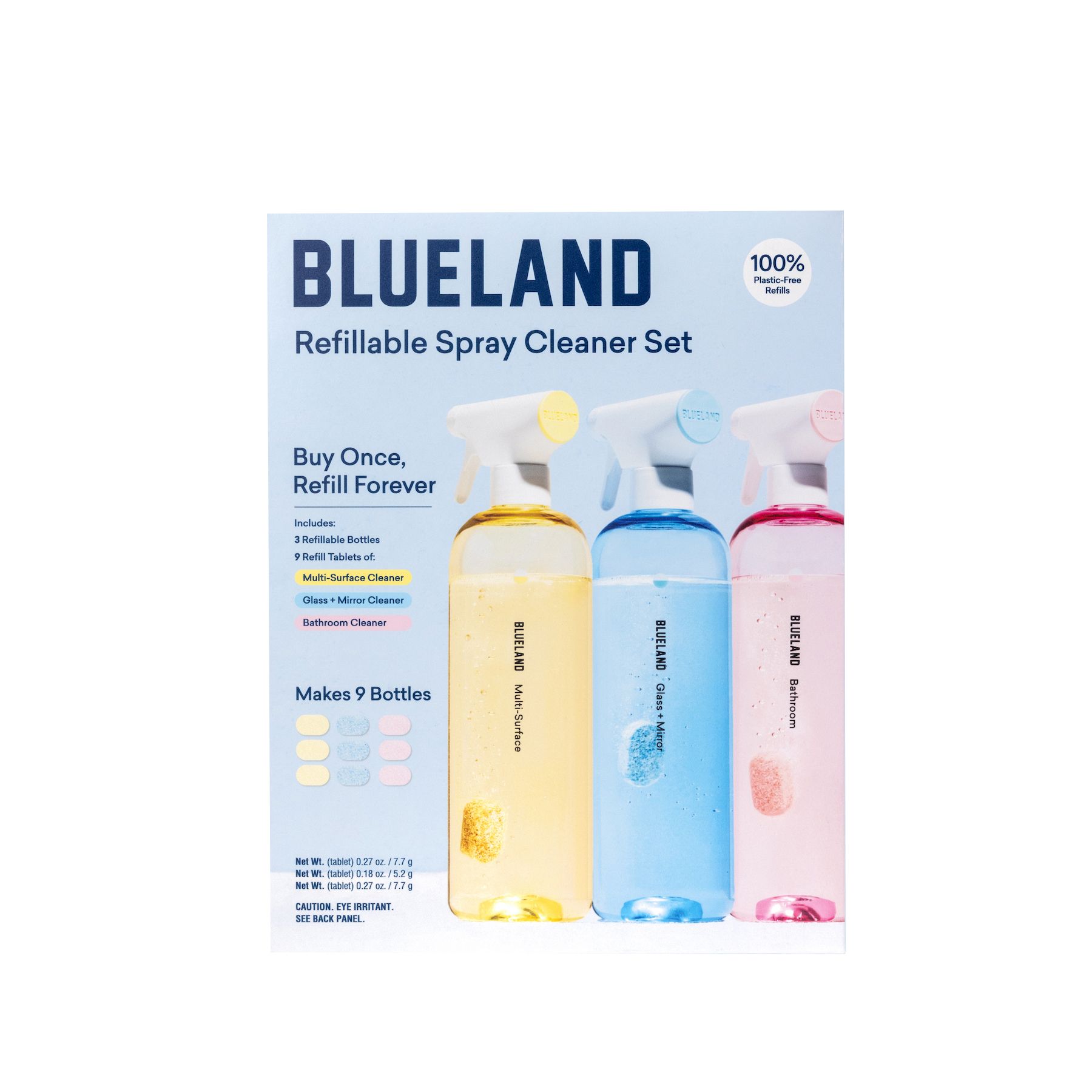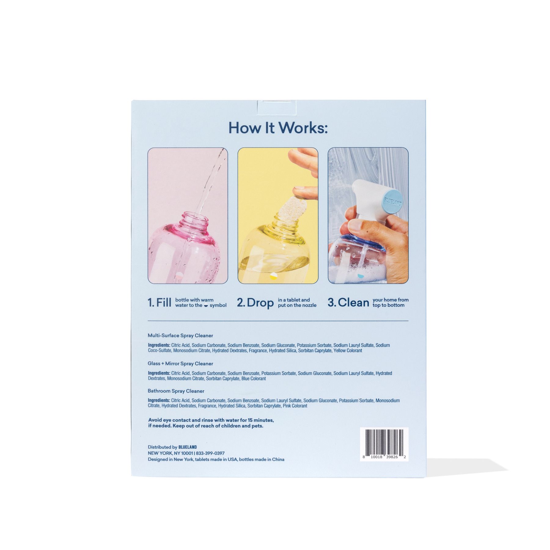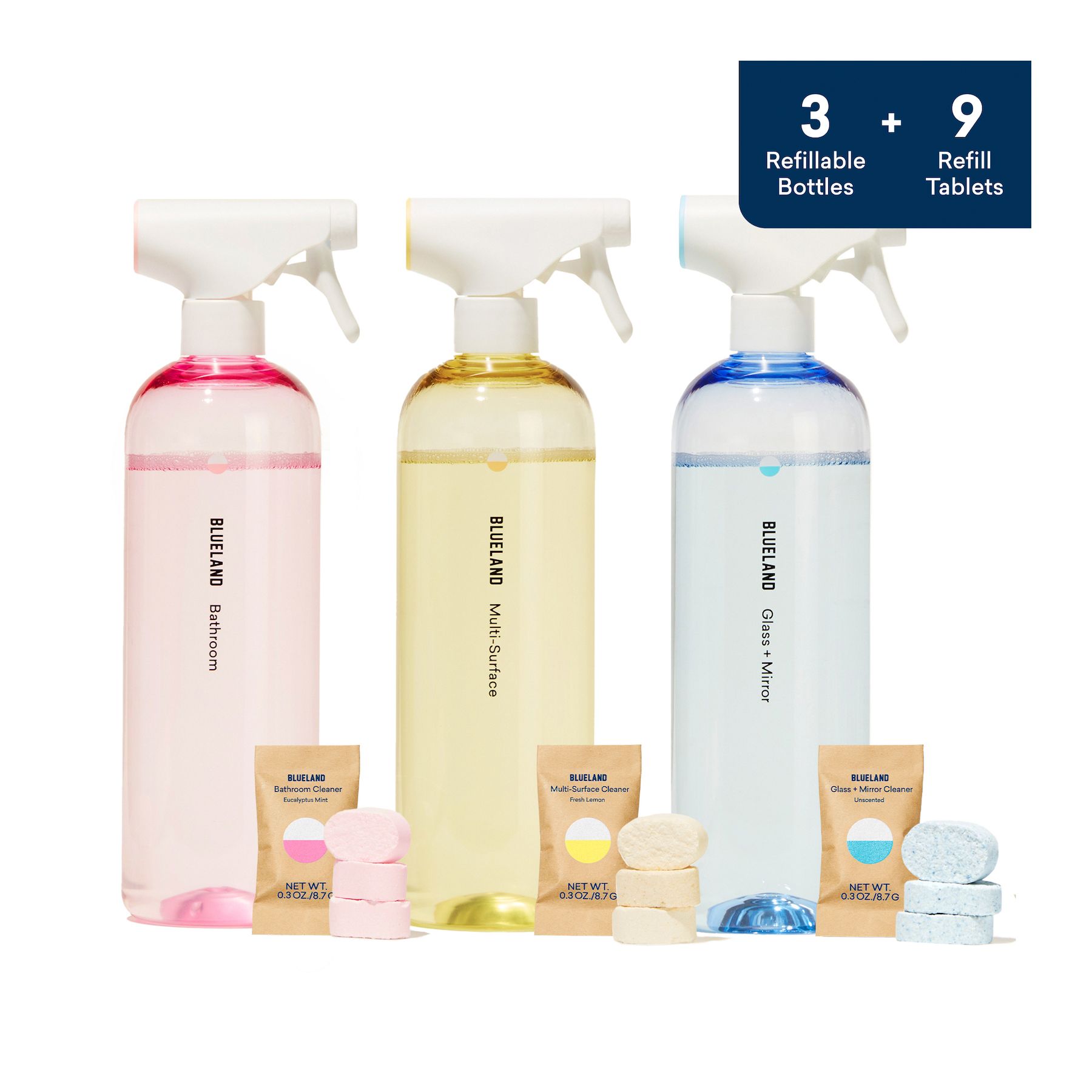 Powerful cleaners don't have to come in wasteful packaging. With this set of Blueland favorites, you can discover a fresh, sustainable approach that utilizes reusable bottles and formula tablets. Simply add water for efficient filling and refilling. Three household cleaners tackle dirt on a range of surfaces.