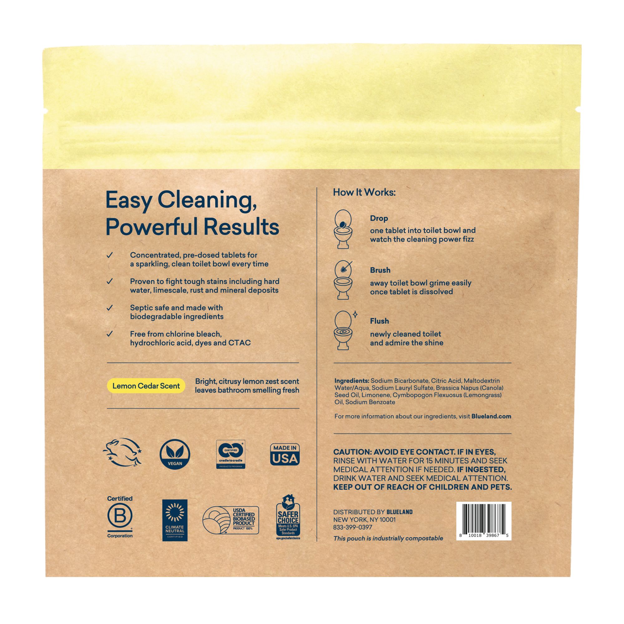 Concentrated, pre-dosed tablets for a sparkling, clean toilet bowl every time Septic safe and made with biodegradable ingredients Easy, no mess cleaning Powers away tough stains, hard water, rust, limescale & mineral deposits Free from chlorine bleach, hydrochloric acid, dyes and CTAC 100% natural fragrances Industrially compostable paper packaging Safer for you, your family, pets and the environment Includes Blueland toilet bowl cleaner tablets, 24 ct.