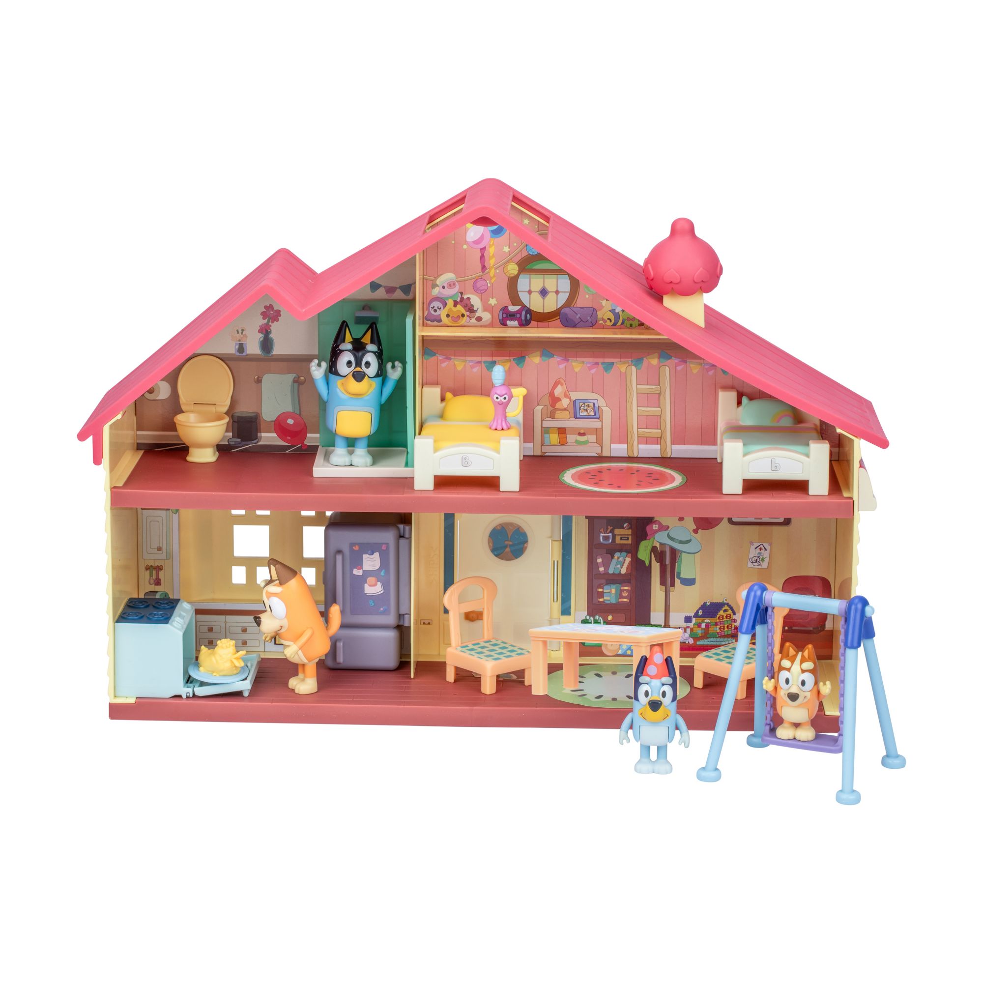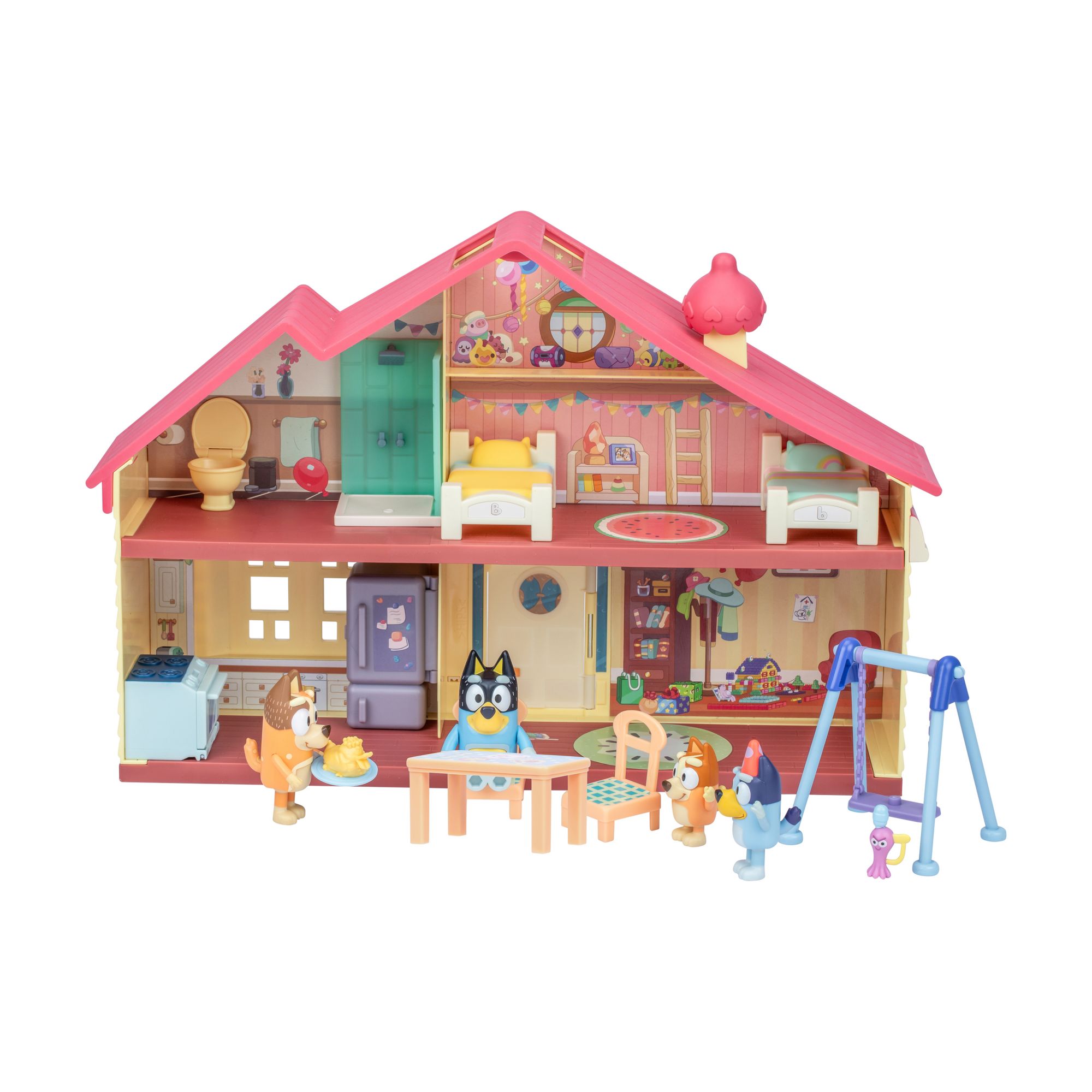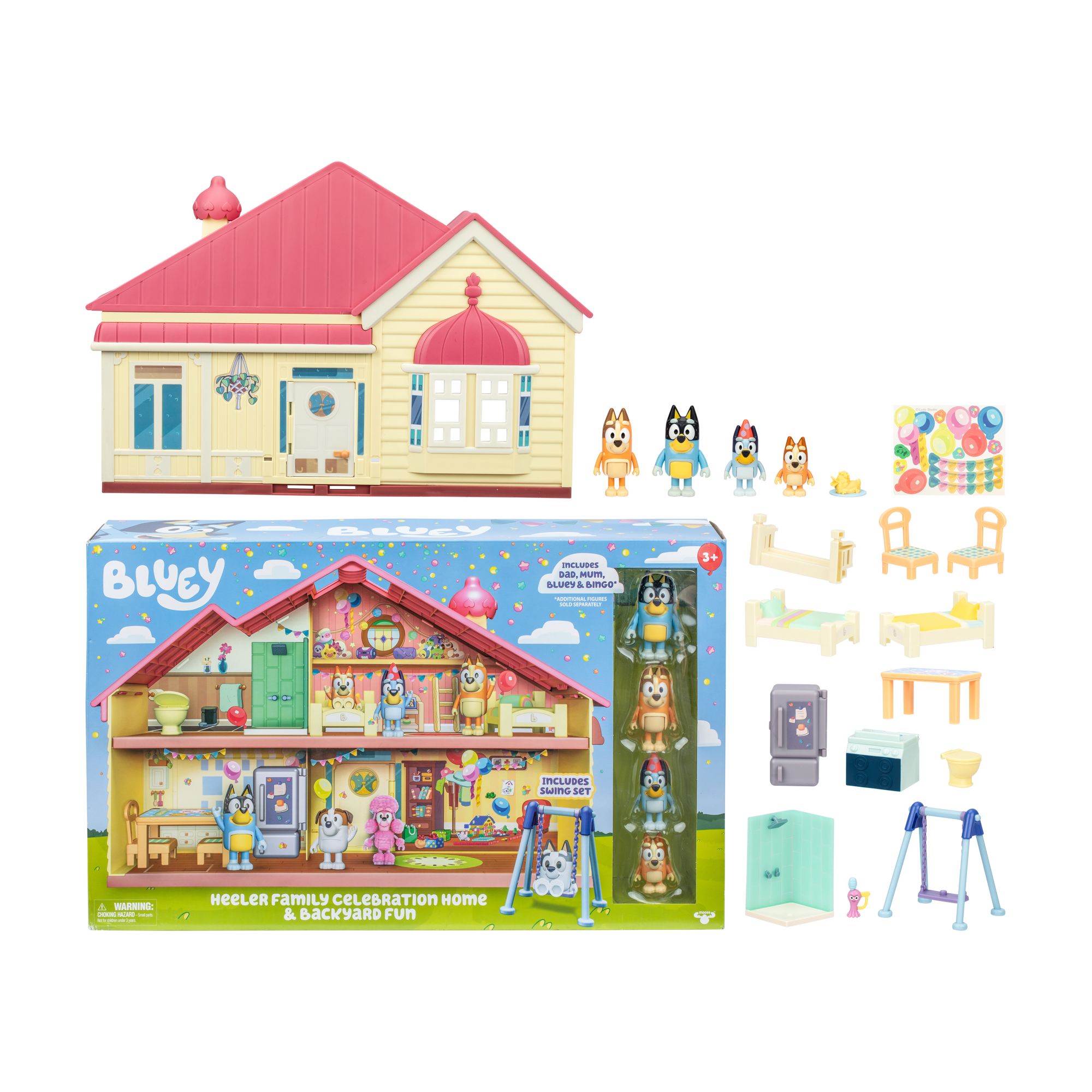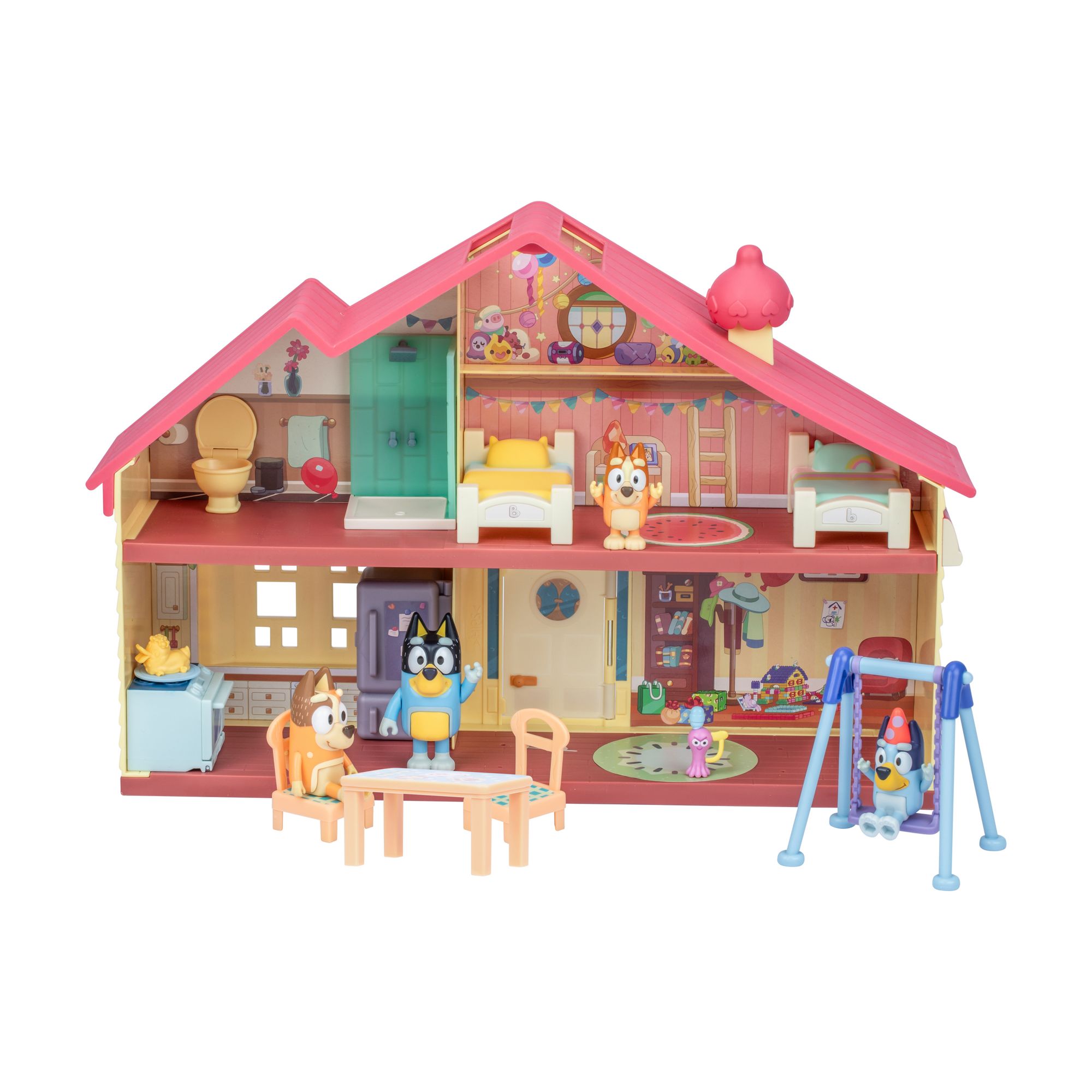 The Heeler family celebration home and backyard fun playset includes 2.5" - 3" figures of Bluey, Bingo, Bandit and Chili
