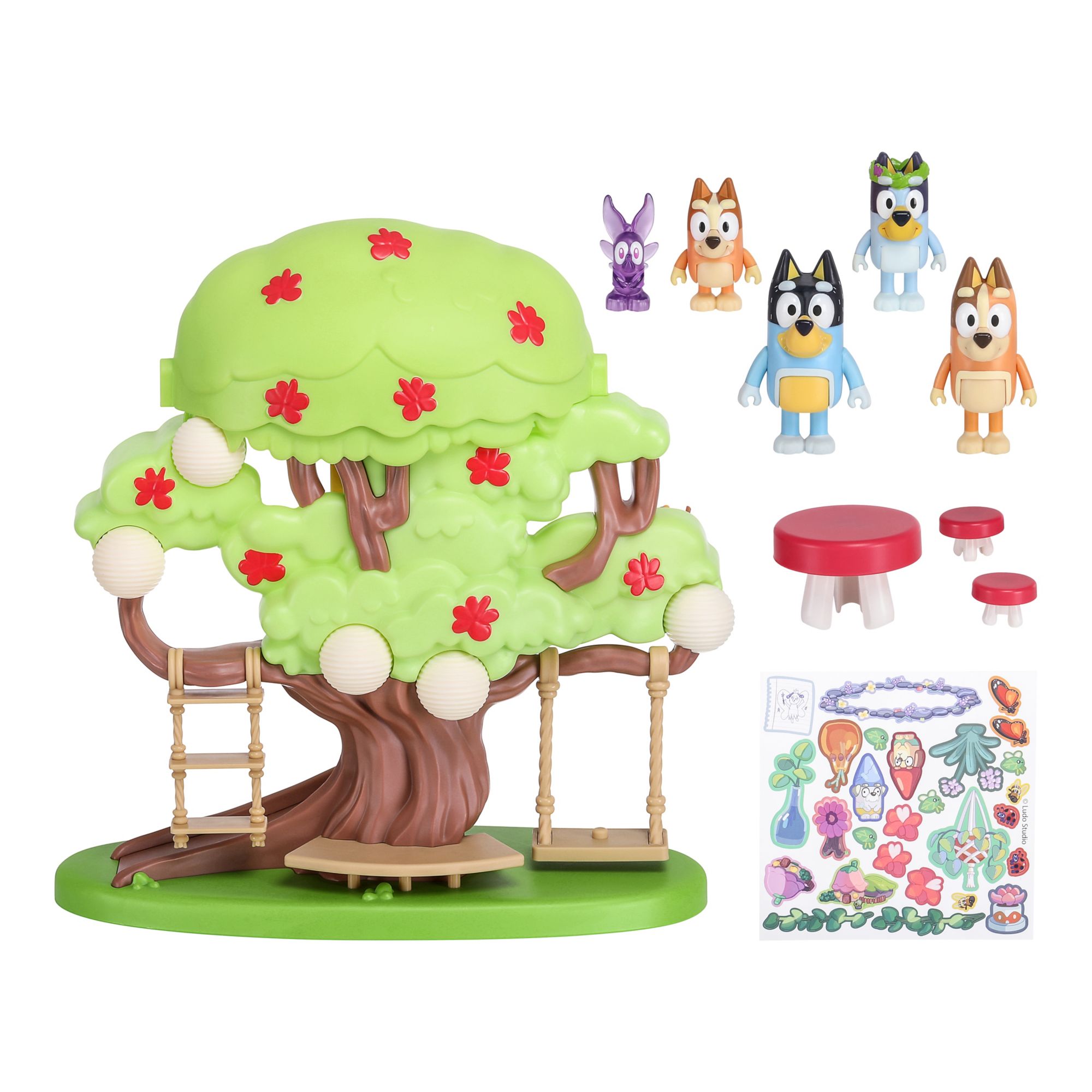 Five Figures: Flower Crown Bluey, Bingo, Bandit (Dad), Chilli (Mum) and Fairy plus accessories and Stickers to decorate the tree