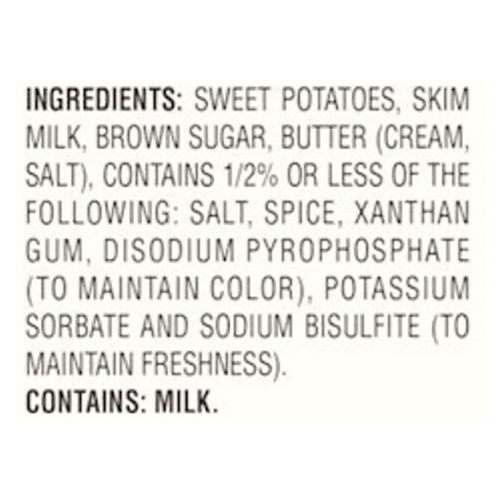 Ingredients: Sweet Potatoes, Skim Milk, Brown Sugar, Butter (Cream, Salt), Contains 1/2% or Less of the Following: Salt, Spice, Xanthan Gum, Disodium Pyrophosphate (to Maintain Color), Potassium Sorbate and Sodium Bisulfite (to Maintain Freshness).