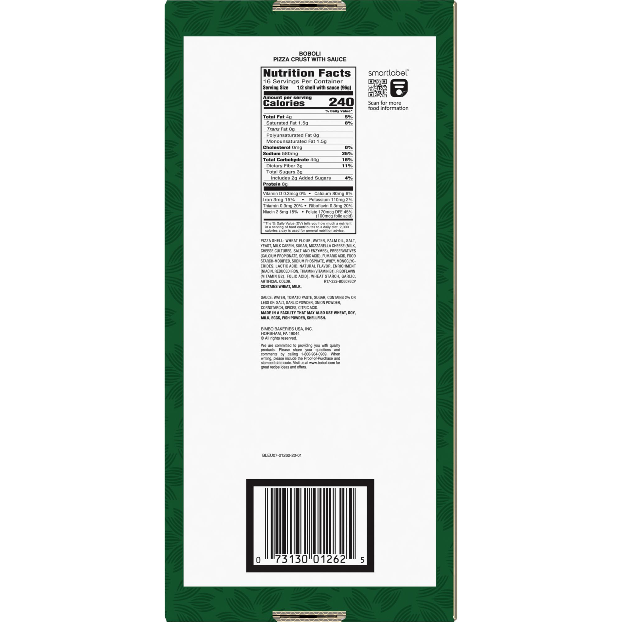 Ingredients: Pizza Shell: Wheat Flour, Water, Palm Oil, Salt, Yeast, Milk Casein, Sugar, Mozzarella Cheese (Milk, Cheese Cultures, Salt And Enzymes), Preservatives (Calcium Propionate, Sorbic Acid), Fumaric Acid, Food Starch-modified, Sodium Phosphate, Whey, Monoglycerides, Lactic Acid, Natural Flavor, Enrichment [Niacin, Reduced Iron, Thiamin (Vitamin B1), Riboflavin (Vitamin B2), Folic Acid], Wheat Starch, Garlic, Artificial Color; Sauce: Water, Tomato Paste, Sugar, Contains 2% Or Less Of: Salt, Garlic Powder, Onion Powder, Cornstarch, Spices, Citric Acid.