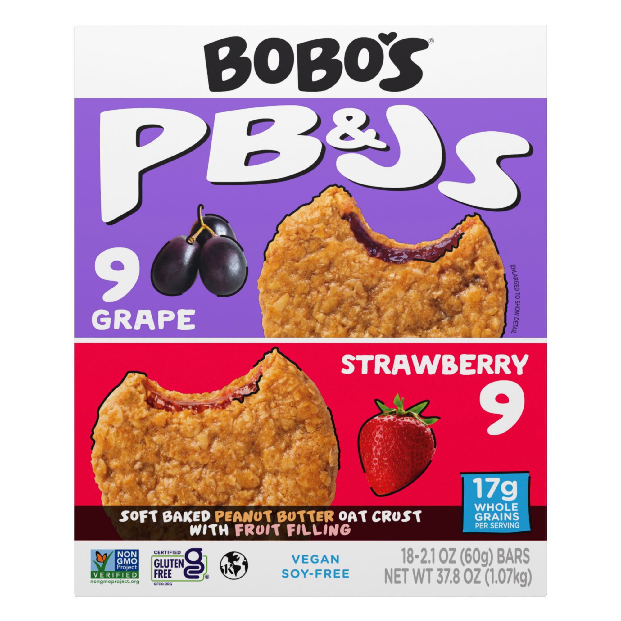 Each Bobo's PB&J starts with delicious whole grain oats mixed with a perfect fruit filling. Each one is gluten-free, Certified Non-GMO, vegan and dairy free! All without boring the daylights out of your taste buds. Every snack is packed full of whole grain oats and tons of flavor to keep your body going and your taste buds begging for more.