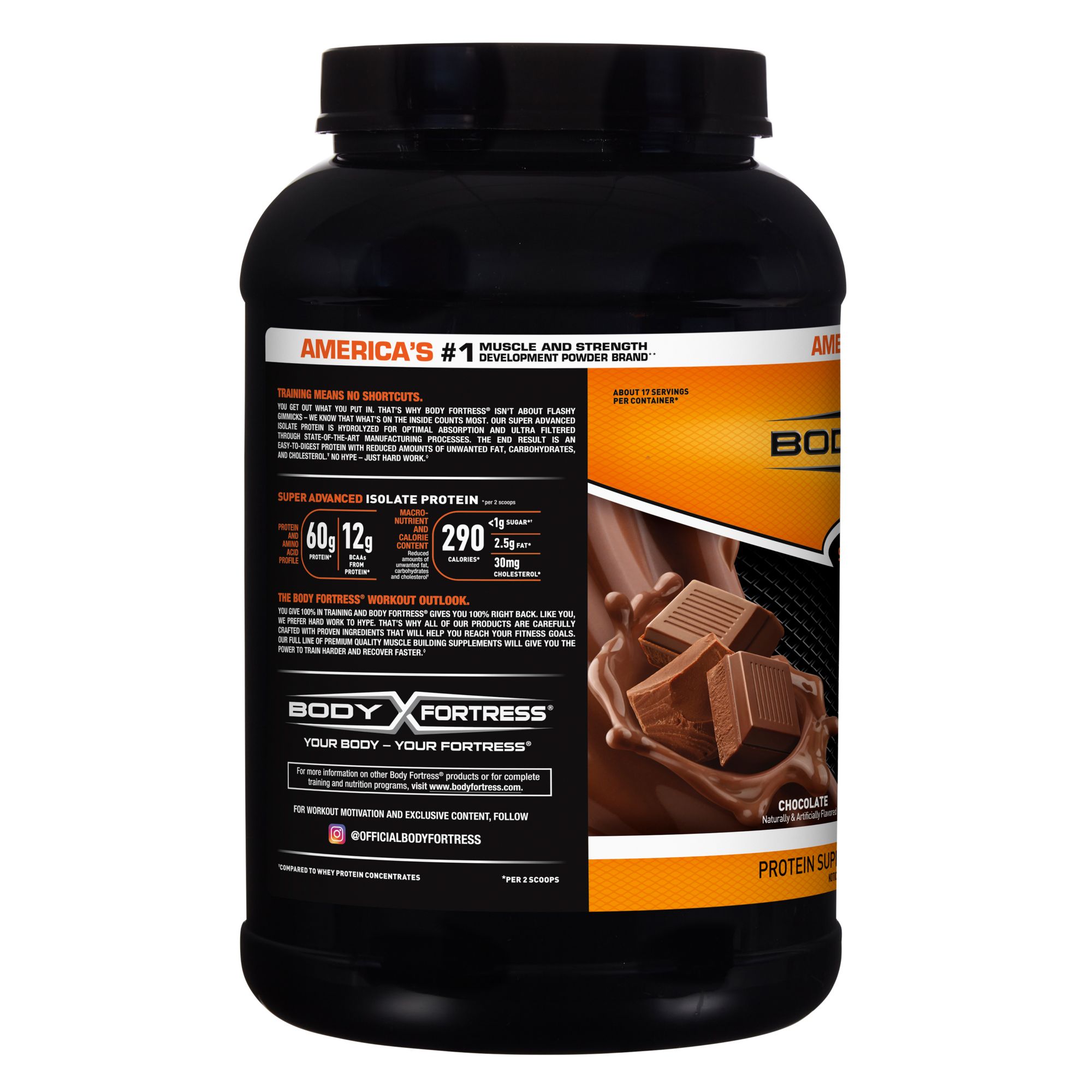 Training isn’t about shortcuts. You get out, what you put in. Body Fortress knows that it isn’t about flashy gimmicks - it’s what’s on the inside that really counts. That’s why their Super Advanced Isolate Protein undergoes state-of-the-art manufacturing processes. To ensure they’re delivering a protein you can count on to be highly purified and contain reduced amounts of unwanted fat, carbohydrates, and cholesterol. No hype - just hard work.