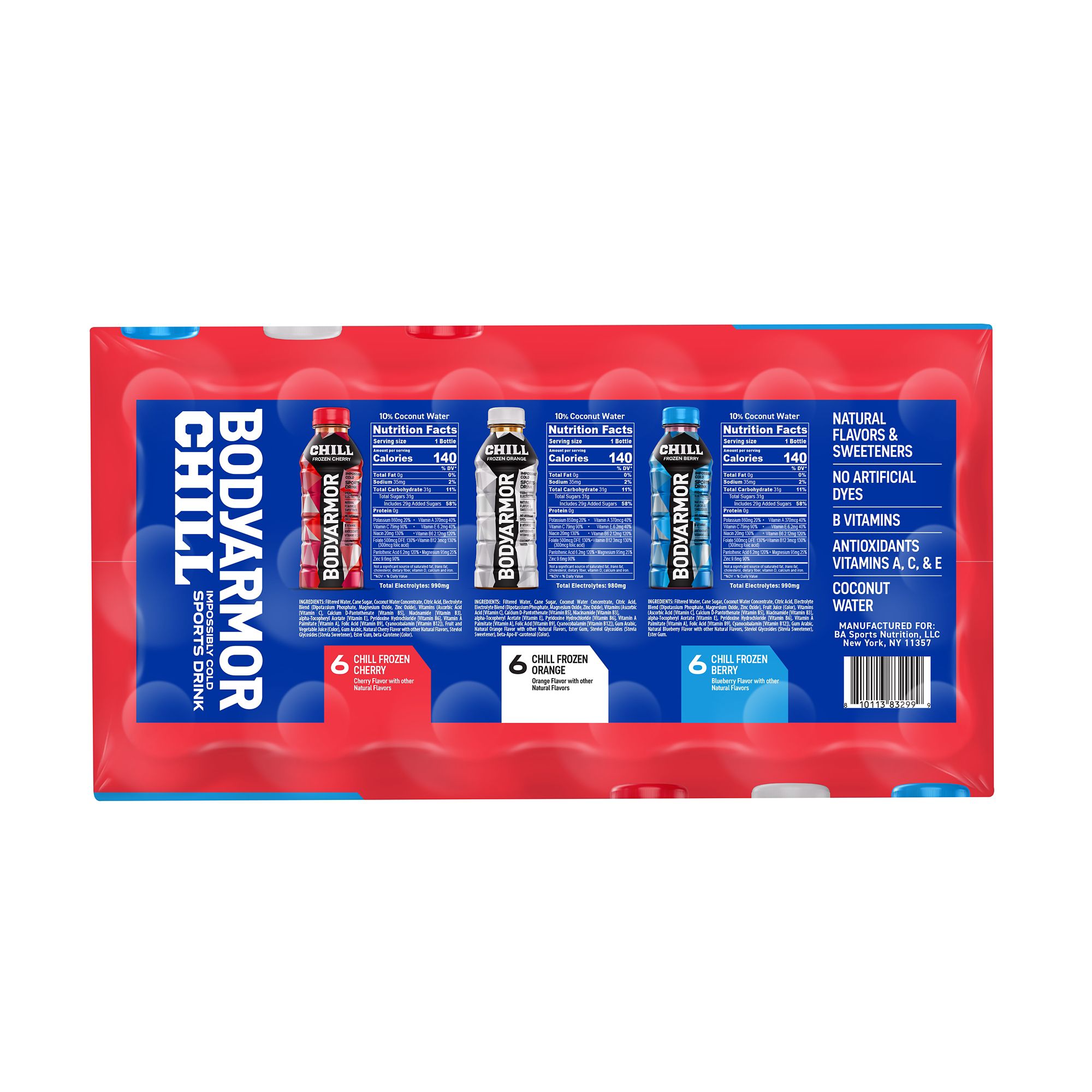 Ingredients: Chill Frozen Cherry: Filtered Water, Cane Sugar, Coconut Water Concentrate, Citric Acid, Electrolyte Blend (Dipotassium Phosphate, Magnesium Oxide, Zinc Oxide), Vitamins (Ascorbic Acid [Vitamin C], Calcium D-pantothenate [Vitamin B5], Niacinamide [Vitamin B3], Alpha-tocopheryl Acetate [Vitamin E], Pyridoxine Hydrochloride [Vitamin B6], Vitamin A Palmitate [Vitamin A], Folic Acid [Vitamin B9], Cyanocobalamin [Vitamin B12]), Fruit And Vegetable Juice (Color), Gum Arabic, Natural Cherry Flavor With Other Natural Flavors, Steviol Glycosides (Stevia Sweetener), Ester Gum, Beta-carotene (Color). Chill Frozen Berry: Filtered Water, Cane Sugar, Coconut Water Concentrate, Citric Acid, Electrolyte Blend (Dipotassium Phosphate, Magnesium Oxide, Zinc Oxide), Fruit Juice (Color), Vitamins (Ascorbic Acid [Vitamin C], Calcium D-pantothenate [Vitamin B5], Niacinamide [Vitamin B3], Alpha-tocopheryl Acetate [Vitamin E], Pyridoxine Hydrochloride [Vitamin B6], Vitamin A Palmitate [Vitamin A], Folic Acid [Vitamin B9], Cyanocobalamin [Vitamin B12]), Gum Arabic, Natural Blueberry Flavor With Other Natural Flavors, Steviol Glycosides (Stevia Sweetener), Ester Gum. Chill Frozen Orange: Filtered Water, Cane Sugar, Coconut Water Concentrate, Citric Acid, Electrolyte Blend (Dipotassium Phosphate, Magnesium Oxide, Zinc Oxide), Vitamins (Ascorbic Acid [Vitamin C], Calcium D-pantothenate [Vitamin B5], Niacinamide [Vitamin B3], Alpha-tocopheryl Acetate [Vitamin E], Pyridoxine Hydrochloride [Vitamin B6], Vitamin A Palmitate [Vitamin A], Folic Acid [Vitamin B9], Cyanocobalamin [Vitamin B12]), Gum Arabic, Natural Orange Flavor With Other Natural Flavors, Ester Gum, Steviol Glycosides (Stevia Sweetener), Beta-apo-8'-carotenal (Color).