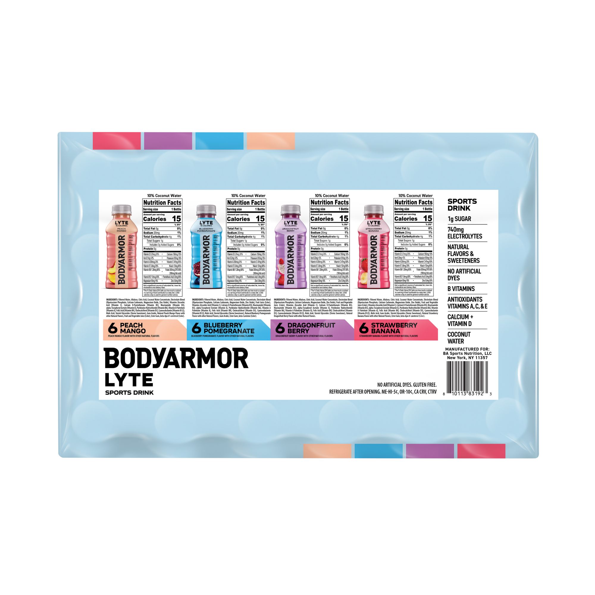 Unlike traditional sports drinks where sodium is the main electrolyte, BODYARMOR has potassium-packed electrolytes thanks to the coconut water base. BODYARMOR Sports Drink is made with natural flavors and sweeteners and no colors from artificial sources, for a premium, natural product offering.