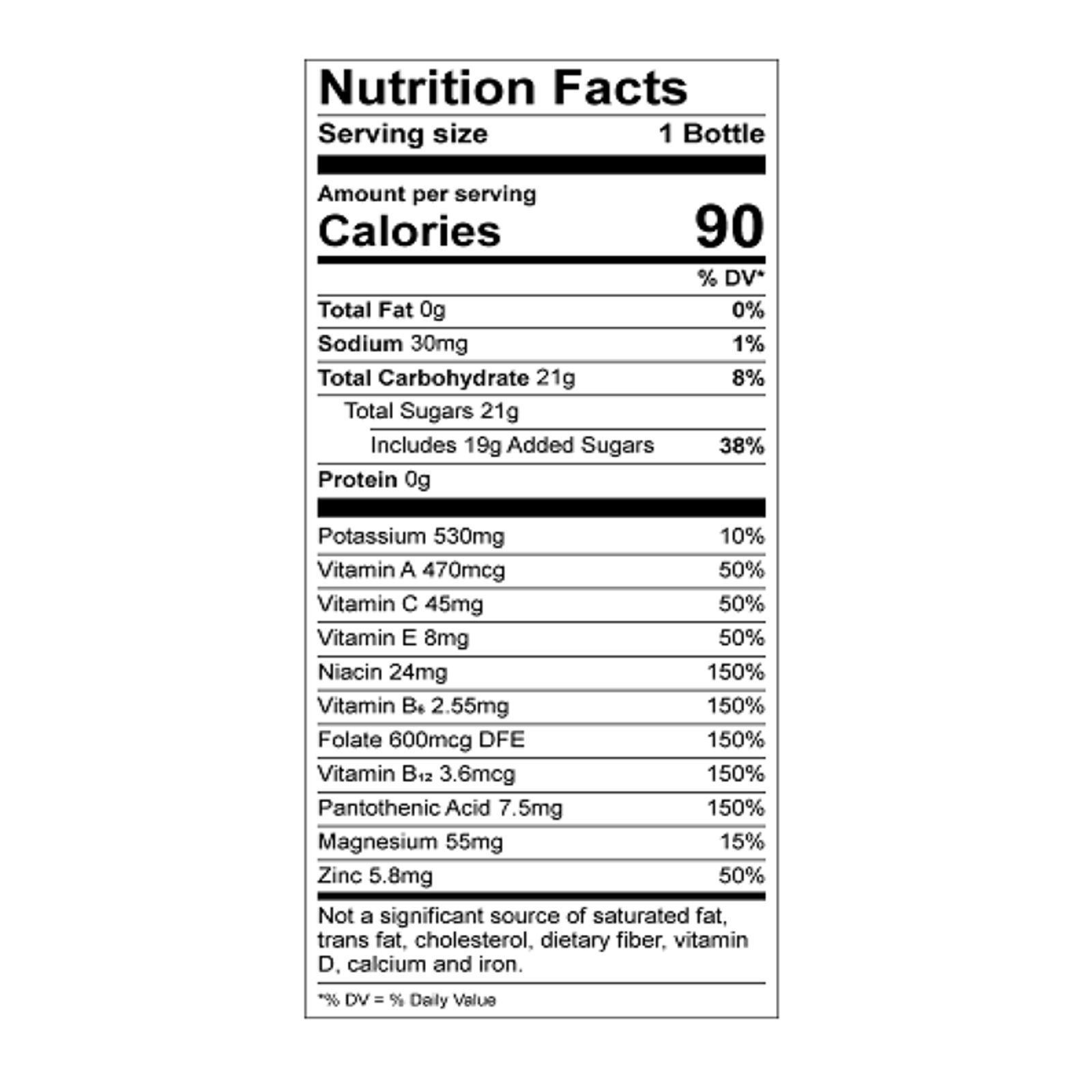 Potassium, vitamin C, vitamin A, Vitamin E, Niacin, vitamin B6, vitamin B12, Magnesium, zinc Potassium-packed electrolytes Antioxidants No artificial sweeteners, flavors or dyes Includes 28 packs of 12-oz. sports drink bottles