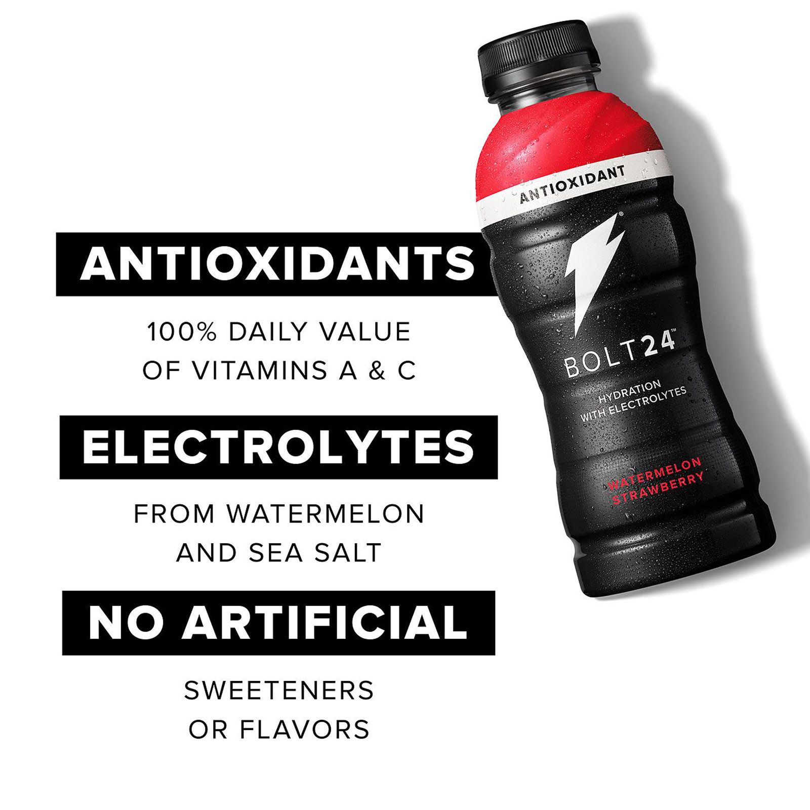 Ingredients: Bolt24 Mixed Berry: Water, Cane Sugar, Clarified Watermelon Concentrate, Citric Acid, Sea Salts, Natural Flavor, Ascorbic Acid (Vitamin C), Purified Stevia Leaf Extract, Lycopene (Color), Niacinamide (Vitamin B3), Beta Carotene (Vitamin A), Calcium Pantothenate (Vitamin B5), Pyridoxine Hydrochloride (Vitamin B6). Bolt24 Tropical Mango: Water, Cane Sugar, Clarified Watermelon Concentrate, Citric Acid, Sea Salts, Natural Flavor, Ascorbic Acid (Vitamin C), Purified Stevia Leaf Extract, Lycopene (Color), Niacinamide (Vitamin B3), Beta Carotene (Vitamin A), Calcium Pantothenate (Vitamin B5), Pyridoxine Hydrochloride (Vitamin B6). Bolt24 Watermelon Strawberry: Water, Cane Sugar, Clarified Watermelon Concentrate, Citric Acid, Sea Salts, Natural Flavor, Ascorbic Acid (Vitamin C), Purified Stevia Leaf Extract, Lycopene (Color), Niacinamide (Vitamin B3), Beta Carotene (Vitamin A), Calcium Pantothenate (Vitamin B5), Pyridoxine Hydrochloride (Vitamin B6).