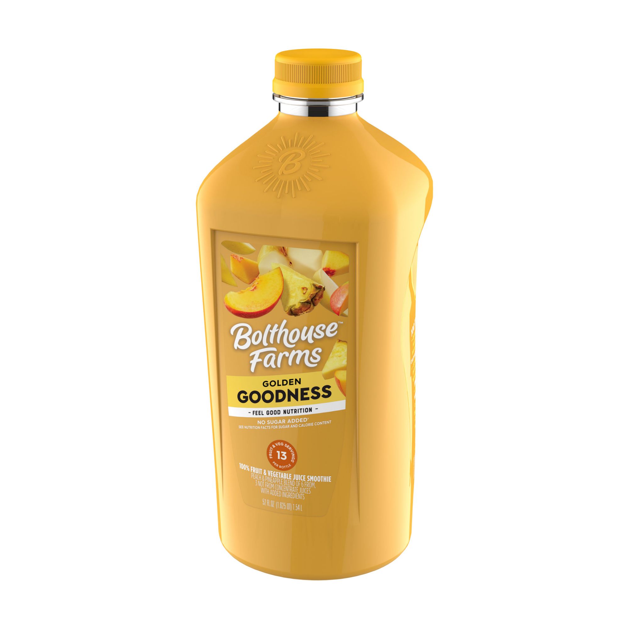 Bolthouse Farms Golden Goodness juice smoothie is made with 100% fruit juice. This fruit blend has no added sugar with 13 servings of fruit per bottle. The large, 52 oz. size bottle is great for stocking up on juice.