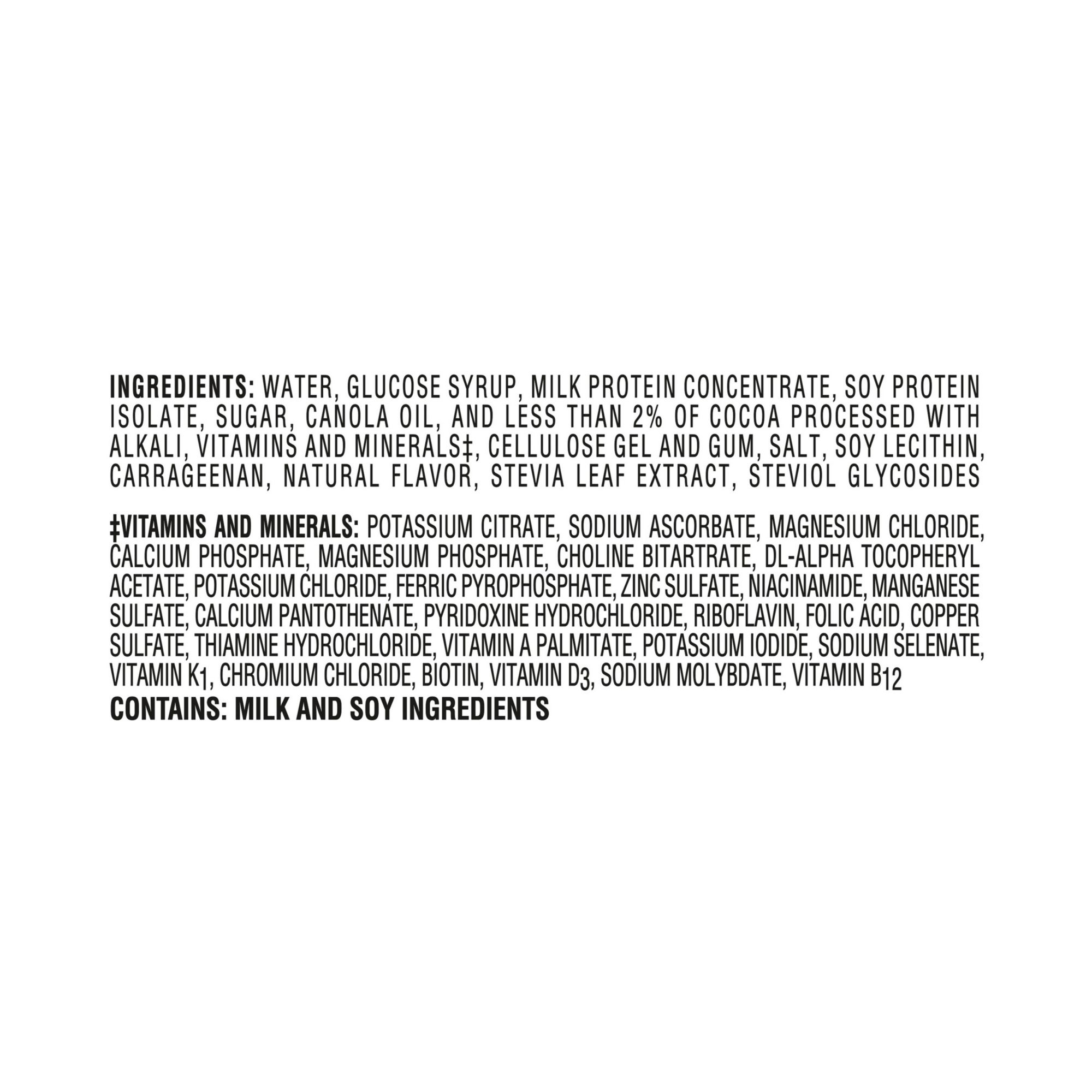 Ingredients: Water, Glucose Syrup, Milk Protein Concentrate, Sugar, Canola Oil, And Less Than 2% Of Soy Protein Isolate, Calcium Caseinate, Sodium Caseinate, Cocoa Processed With Alkali, Vitamins And Minerals*, Cellulose Gel And Gum, Salt, Natural Flavor, Carrageenan, Stevia Leaf Extract, Steviol Glycosides.