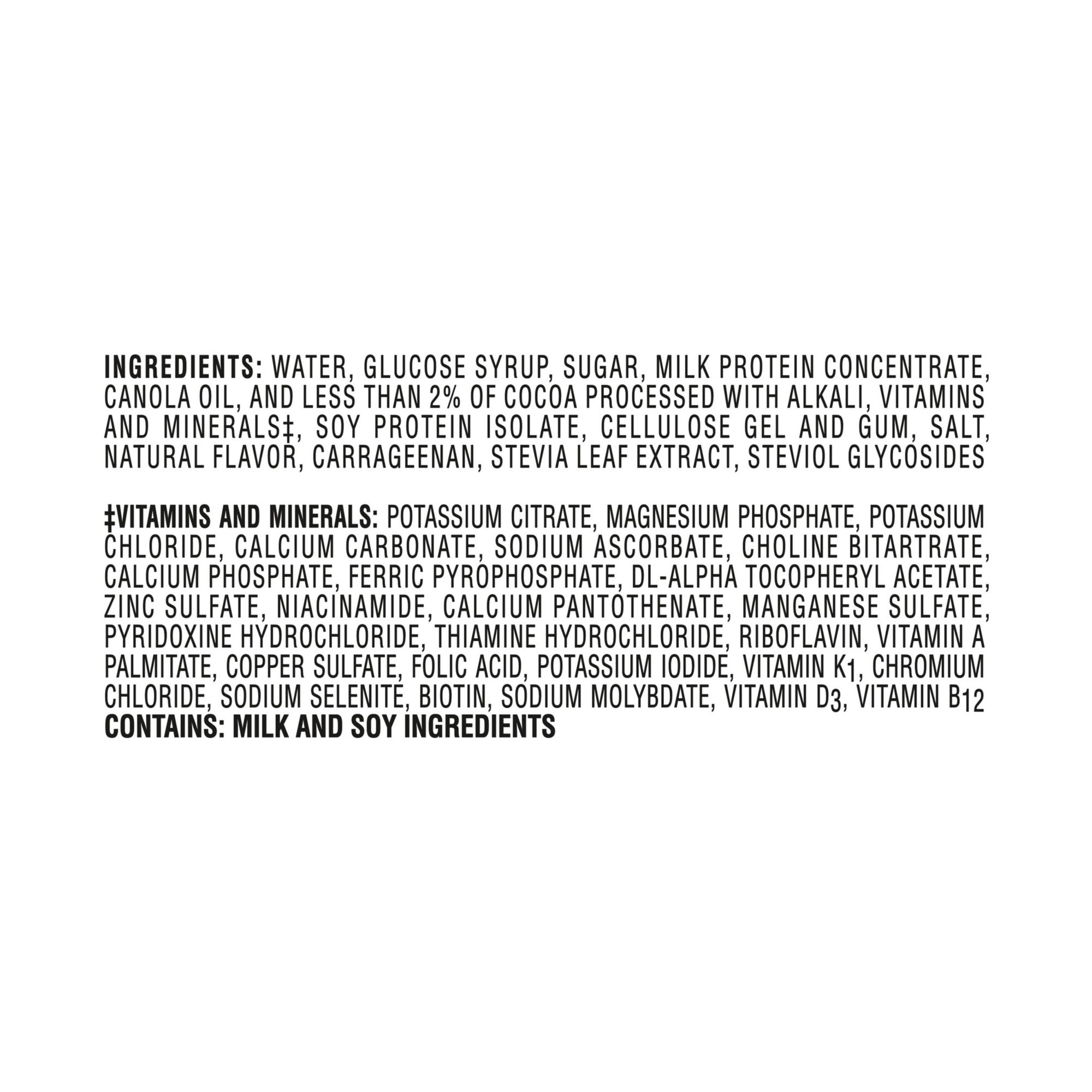 Ingredients: Water, Glucose Syrup, Sugar, Milk Protein Concentrate, And Less Than 2% Of Vegetable Oil (Canola, High Oleic Sunflower, Corn), Cocoa Processed With Alkali, Vitamins And Minerals‡, Soy Protein Isolate, Gum Acacia, Fructooligosaccharides, Inulin (From Chicory), Cellulose Gel And Gum, Salt, Soy Lecithin, Carrageenan, Stevia Leaf Extract, Natural And Artificial Flavor.