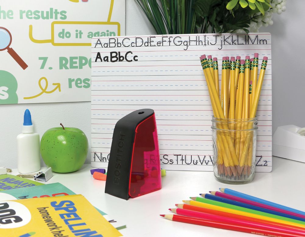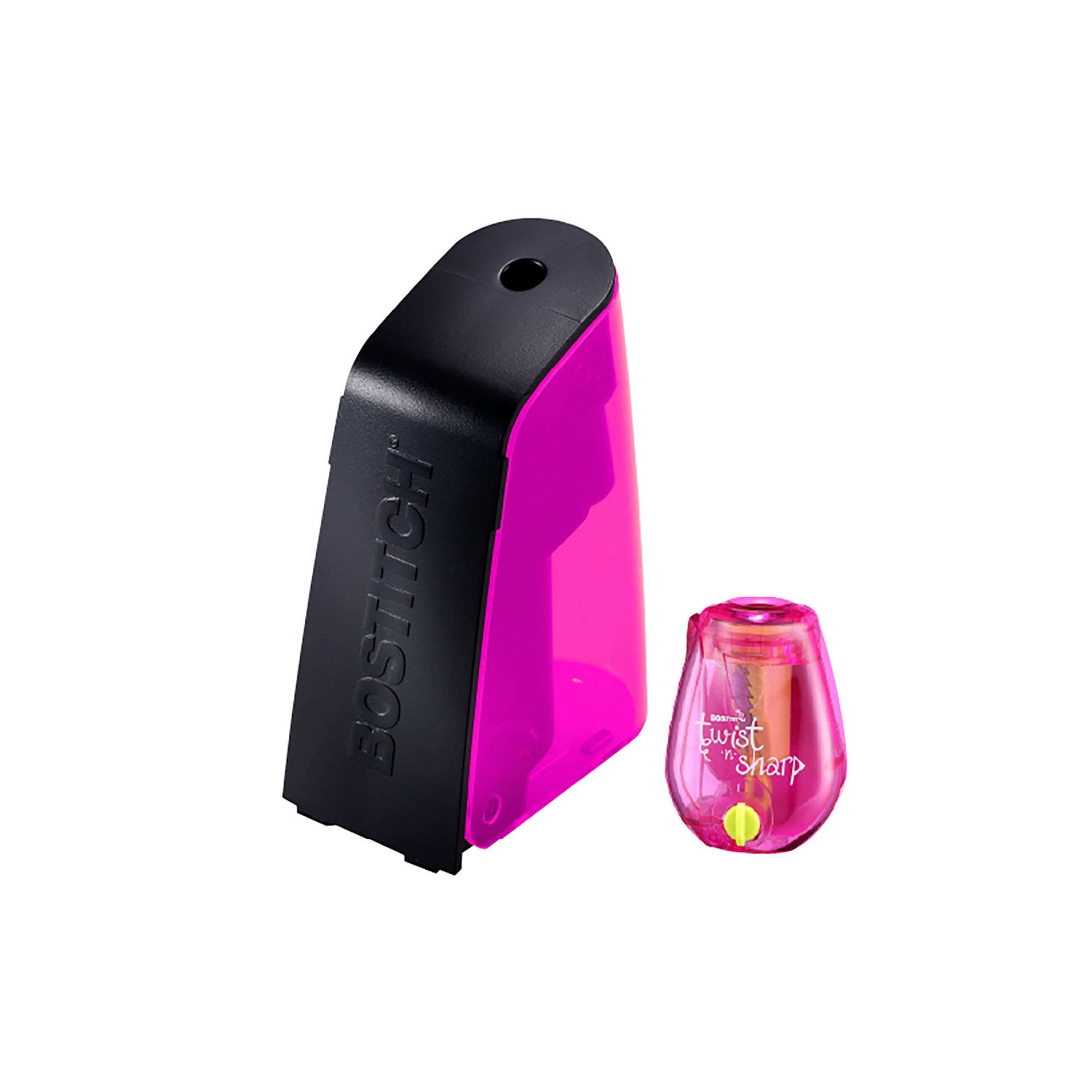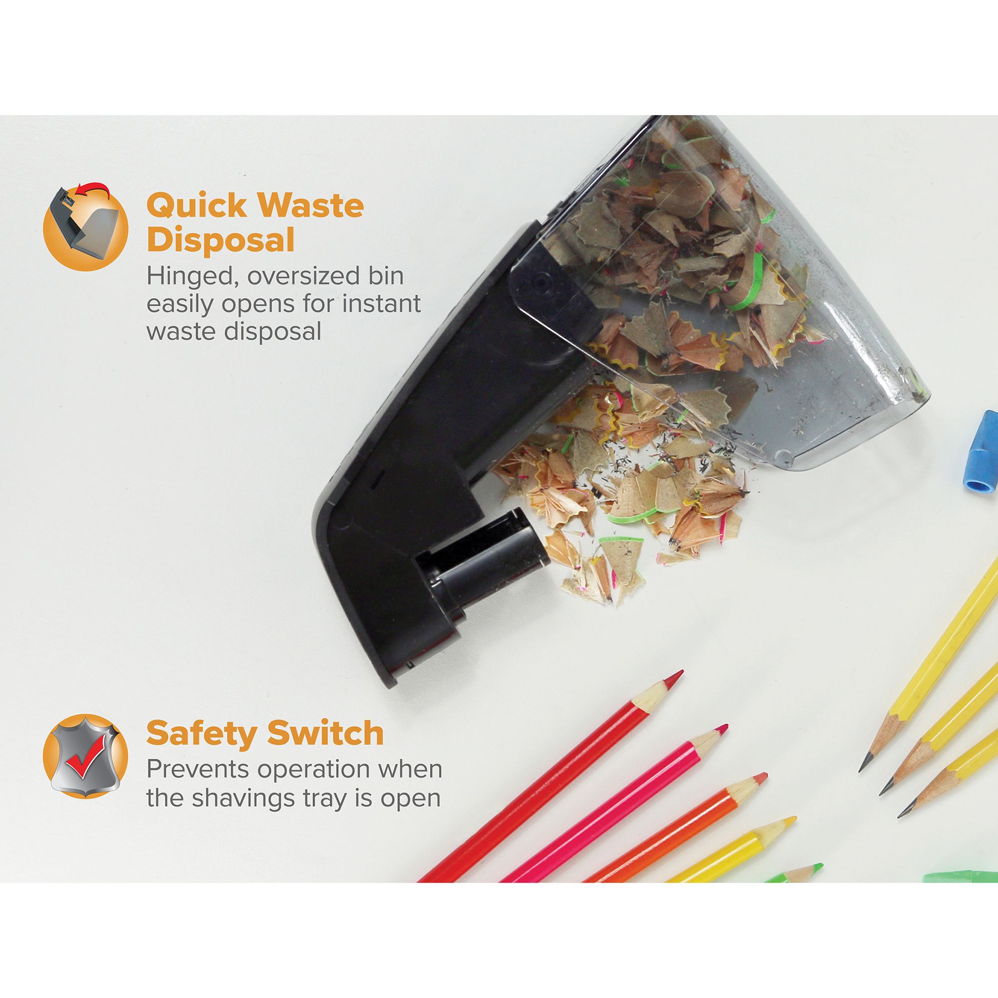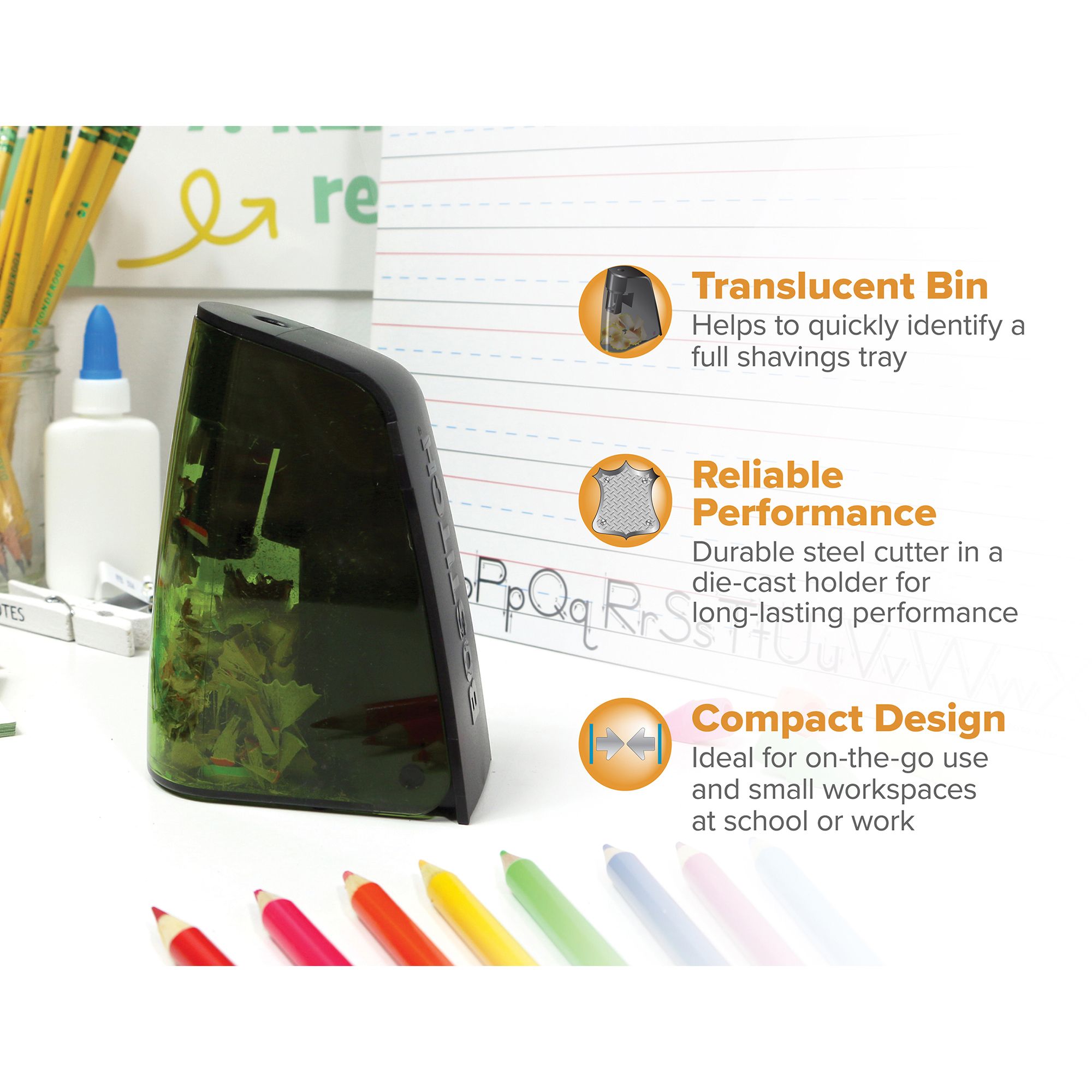 Perfect for home or school use, this stylish, space-saving battery Bostitch pencil sharpener provides reliable, lasting performance for both standard and colored pencils. Additionally, the manual sharpener is compact enough to fit into any school or travel bag. Designed for dependability in shared or personal workspaces, the battery sharpener boasts multiple features to increase convenience, including a tool-free replaceable cutter installation. The powerful motor operates stall-free under normal use. Great for on-the-go travel, the compact size takes up little space and is wire-free due to its battery operation. The powerful motor also operates stall-free under normal use when sharpening standard pencils or colored pencils. The translucent, hinged shavings bin ensures you can instantly identify a full bin, while its large size can store an impressive quantity and be easily flipped open for quick waste disposal. Requires 2 AA batteries for operation (not included).