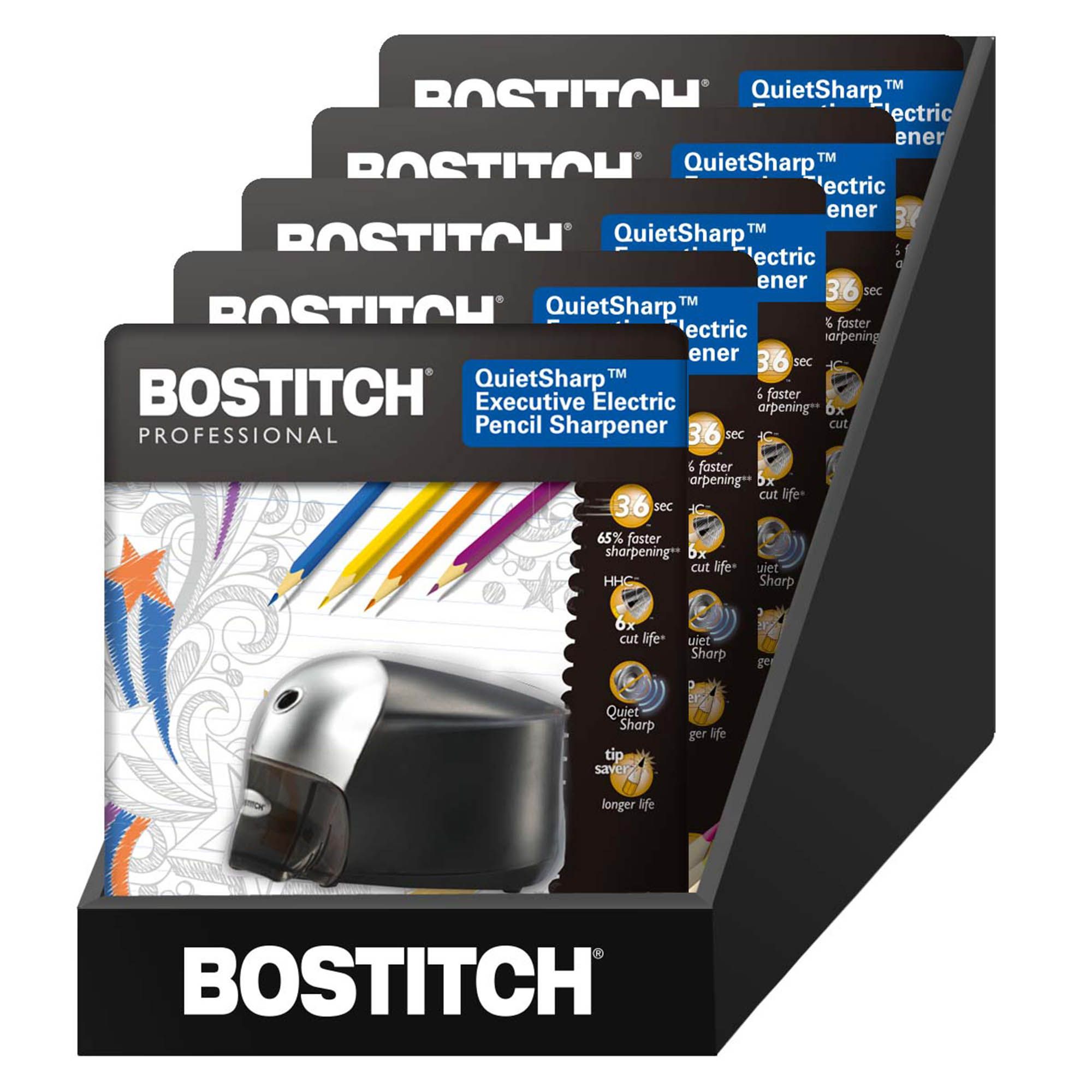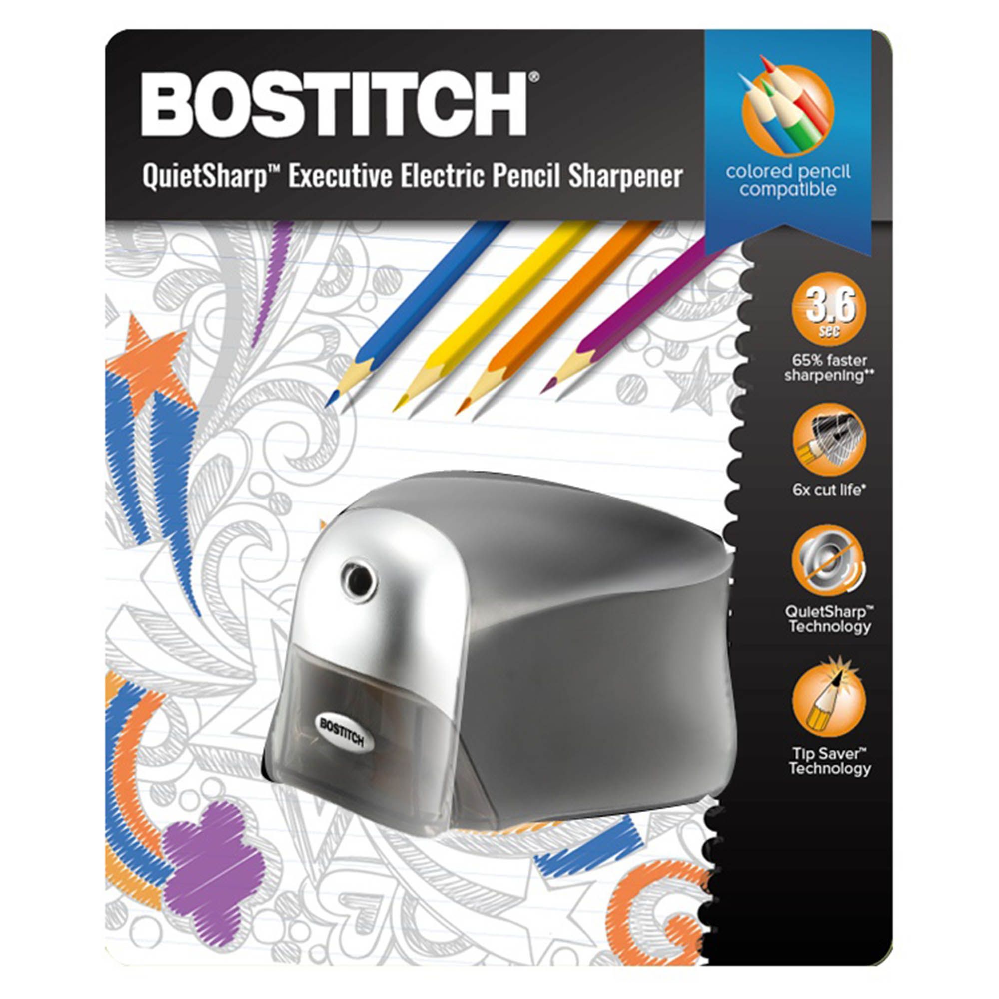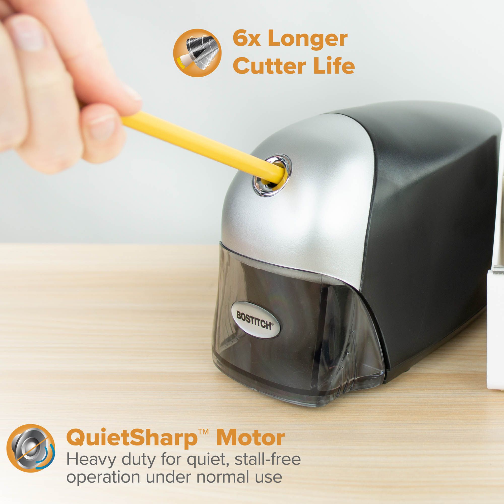 65% faster sharpening QuietSharp heavy duty motor for stall-free operation under normal use Thermal overload protection Tip Saver technology prevents over sharpening and extends pencil life Safety switch prevents operation with shavings bin is removed Translucent, easy-clean shavings bin Includes pencil sharpener Warranty: 7 years limited