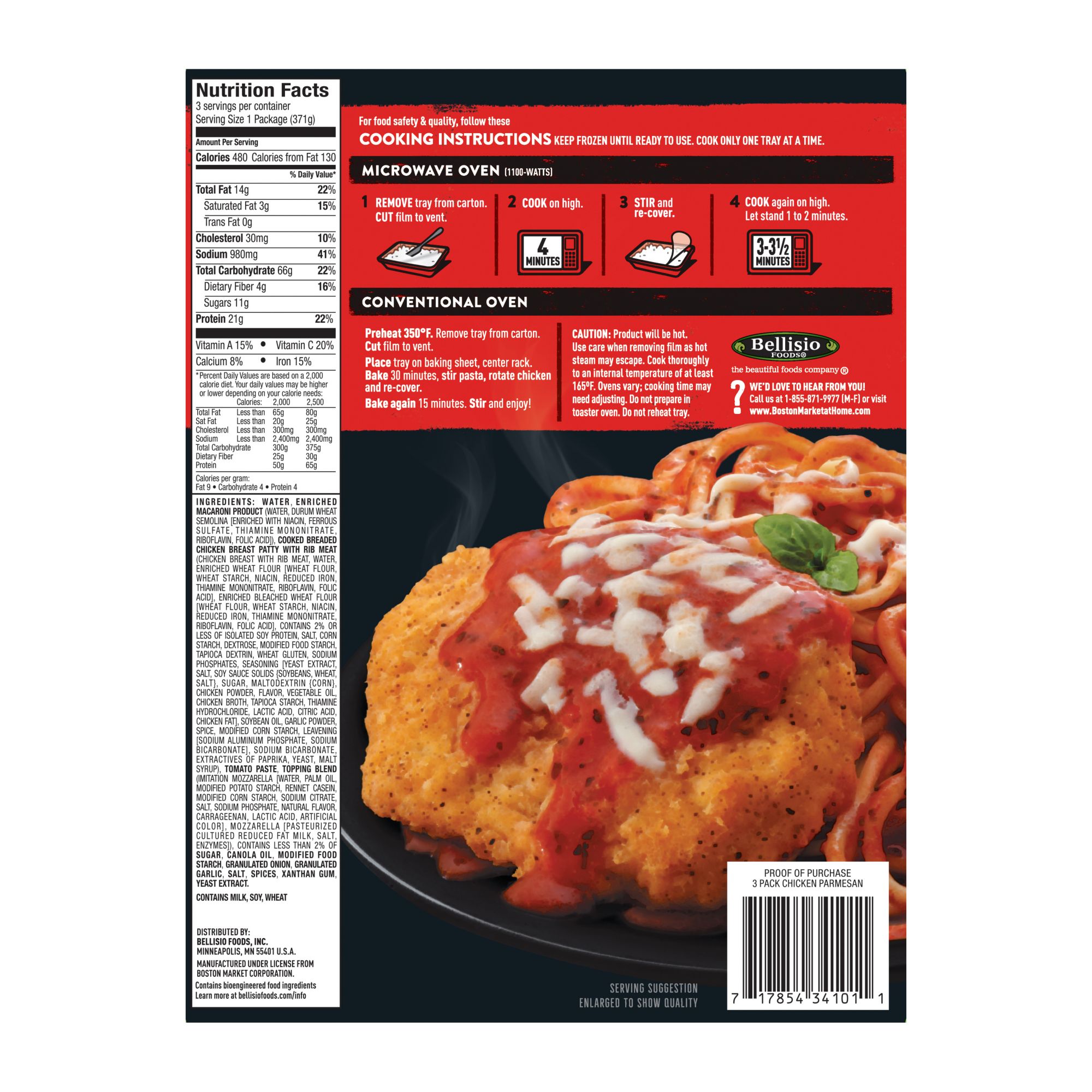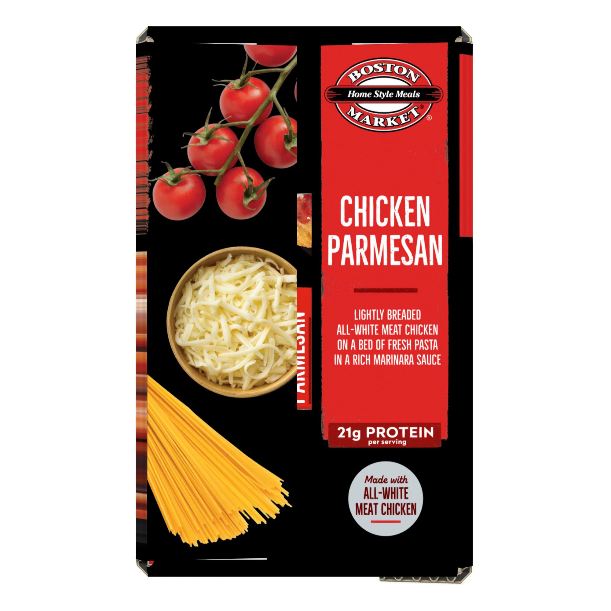 A multi pack of Boston Market's frozen Chicken Parmesan with Spaghetti and Marinara sauce. This convenient, easy to microwave meal is made of a lightly breaded all white meat chicken and is served on a bed of perfectly cooked spaghetti and smothered in a rich marinara sauce. Savory cheese completes this irresistible Italian-inspired favorite.