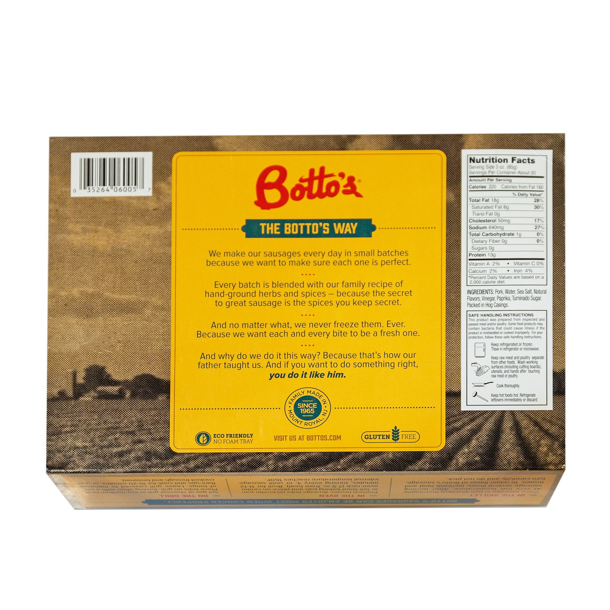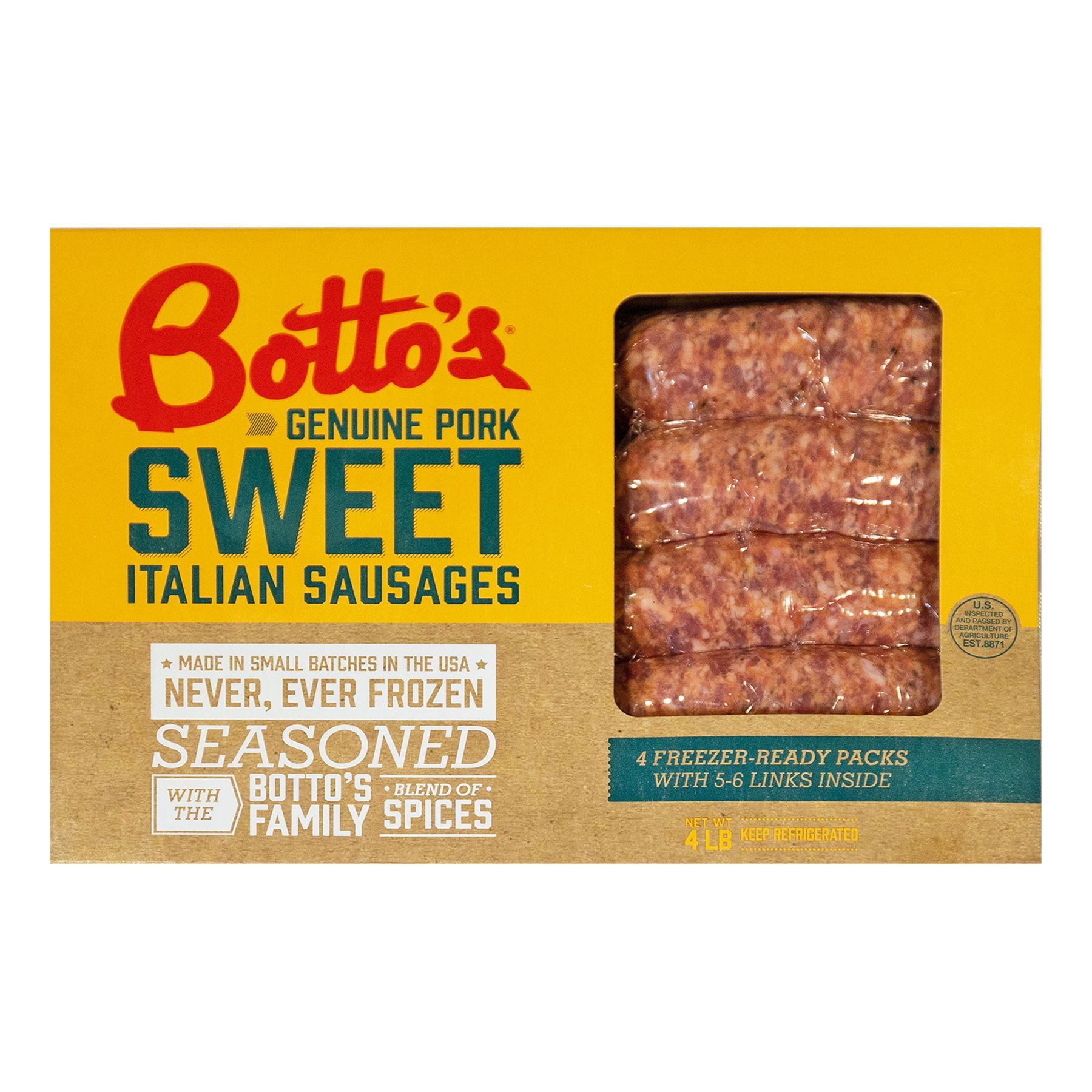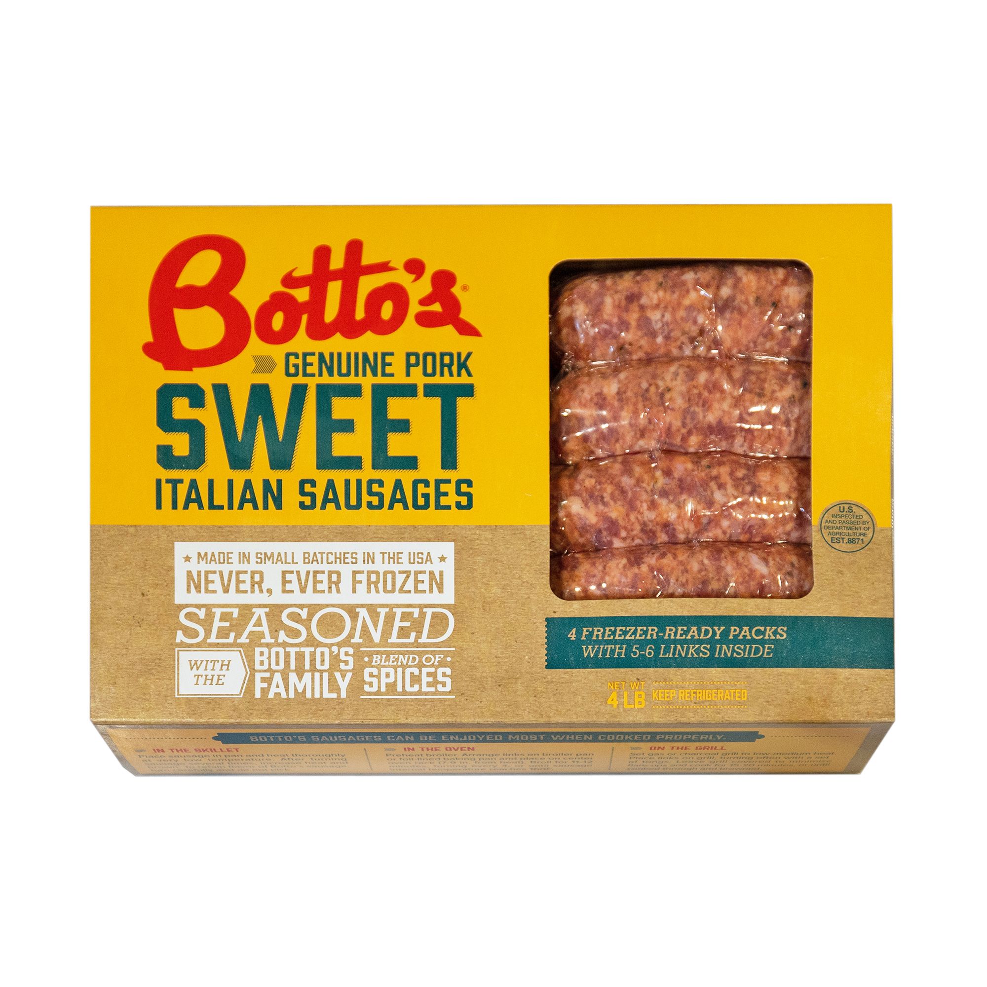 Botto's Sweet Italian Sausage has an authentic flavor profile. These Sweet Italian Sausage Links are made from freshly ground pork butts and seasoned to perfection with black pepper, salt, fennel, crushed red pepper, paprika and other natural seasonings. All Botto's sausage products are made from fresh, never frozen pork products.
