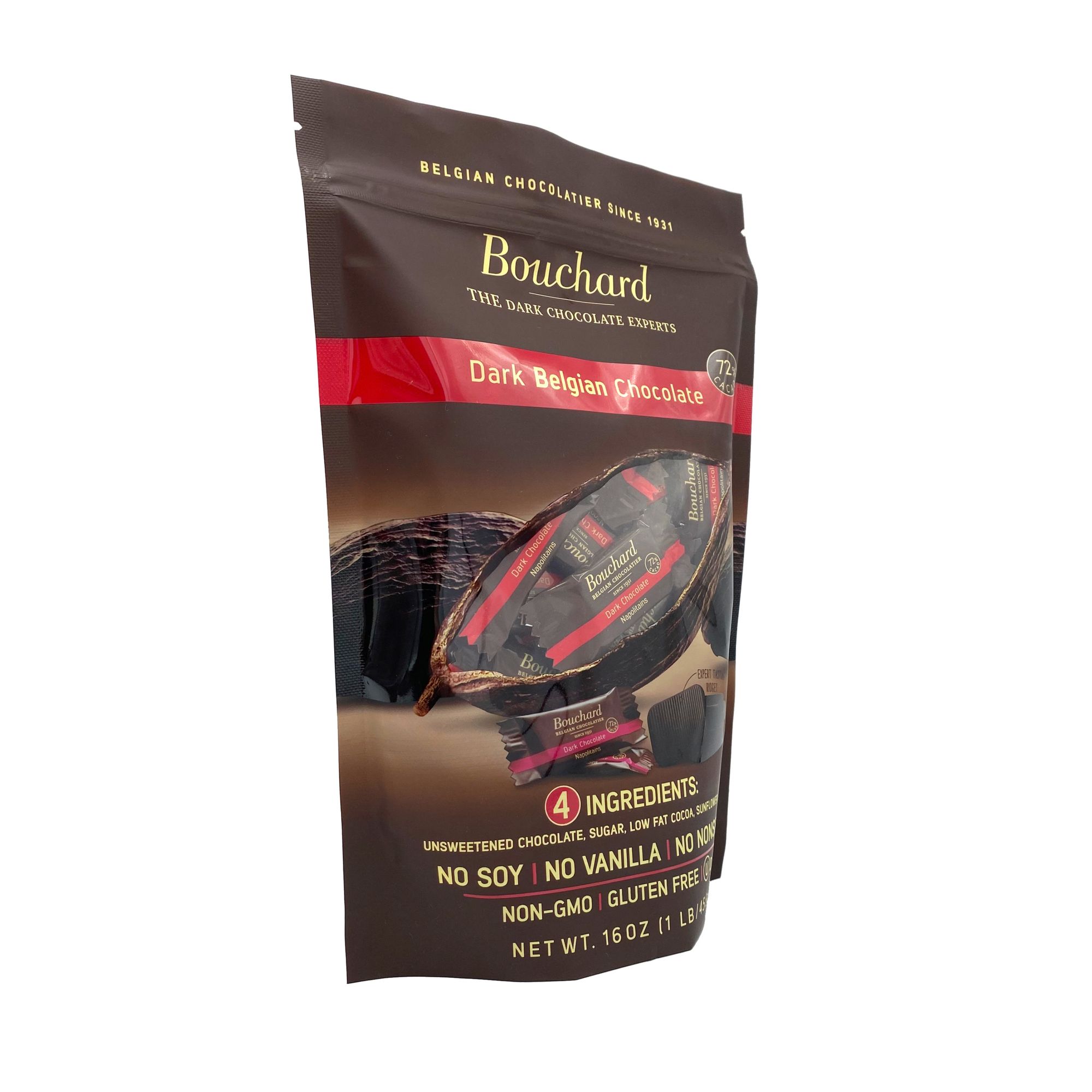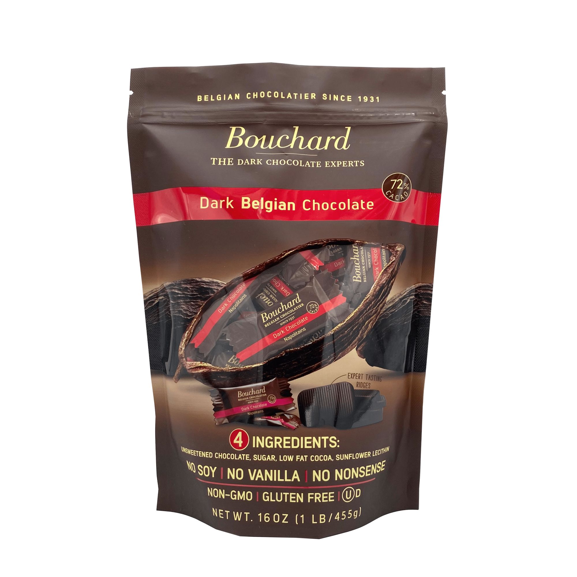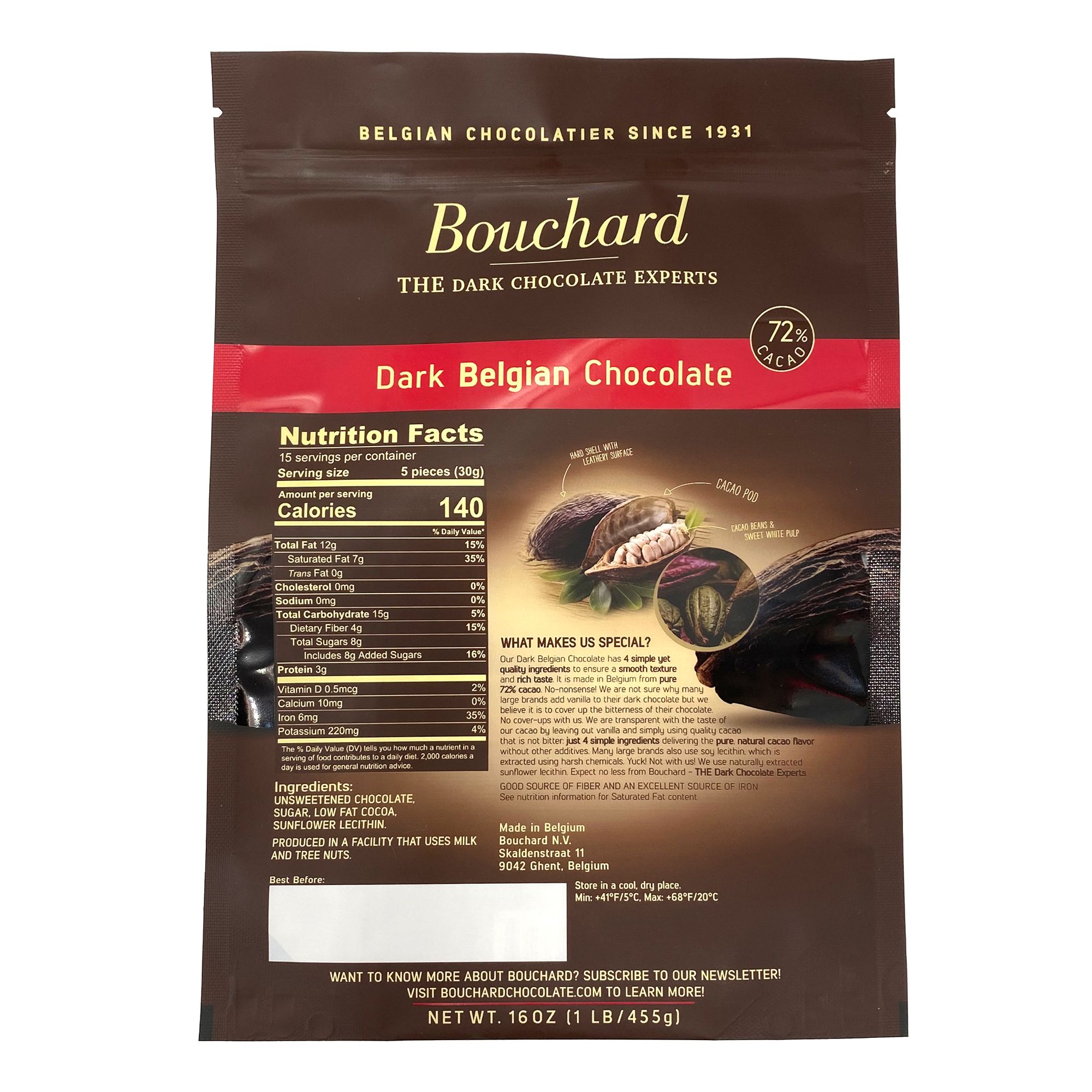 Bouchard Belgian Dark 72% Chocolate Bites have only four simple ingredients to ensure a smooth texture and rich taste. It is made in Belgium from pure 72% cacao. Many large brands add vanilla to their dark chocolate to cover up the bitterness. No cover-ups with Bouchard - just simple, quality ingredients. Chocolate bites are individually wrapped bites for portion control and freshness.