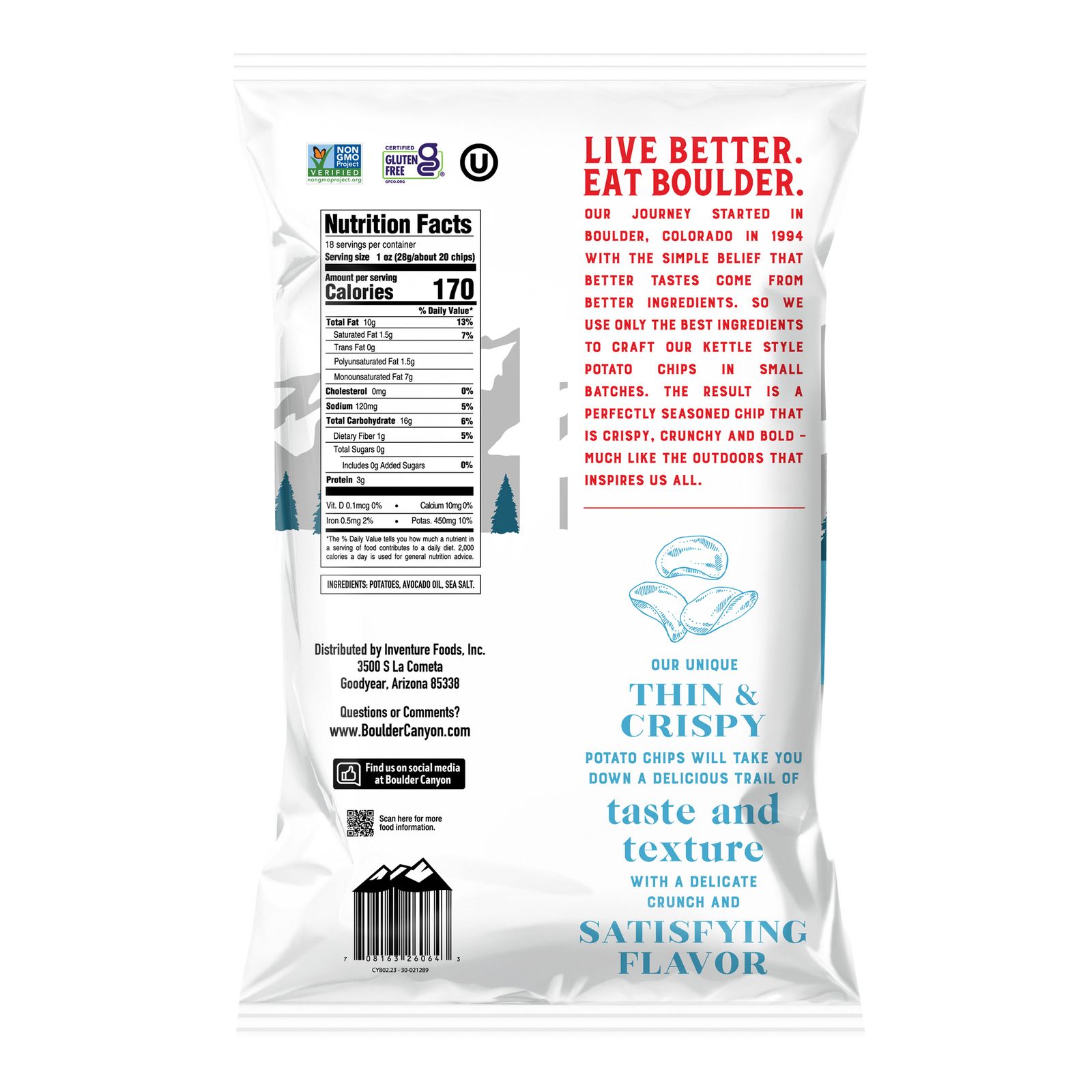 Live Better, Eat Boulder. Started in 1994 with the simple belief that better tastes come from better ingredients. Boulder Canyon uses only the best ingredients to craft their thin and crispy potato chips in small batches. The result is a perfectly seasoned chip that is crispy, crunchy and bold much like the outdoors that inspire us all. Boulder Canyon's unique thin and crispy potato chips will take you down a delicious trail of taste and texture with a delicate crunch and satisfying flavor. These chips are cooked in only better for you avocado oil. Simple ingredients elevated with better oils. Non-GMO, all natural flavors, natural colors.