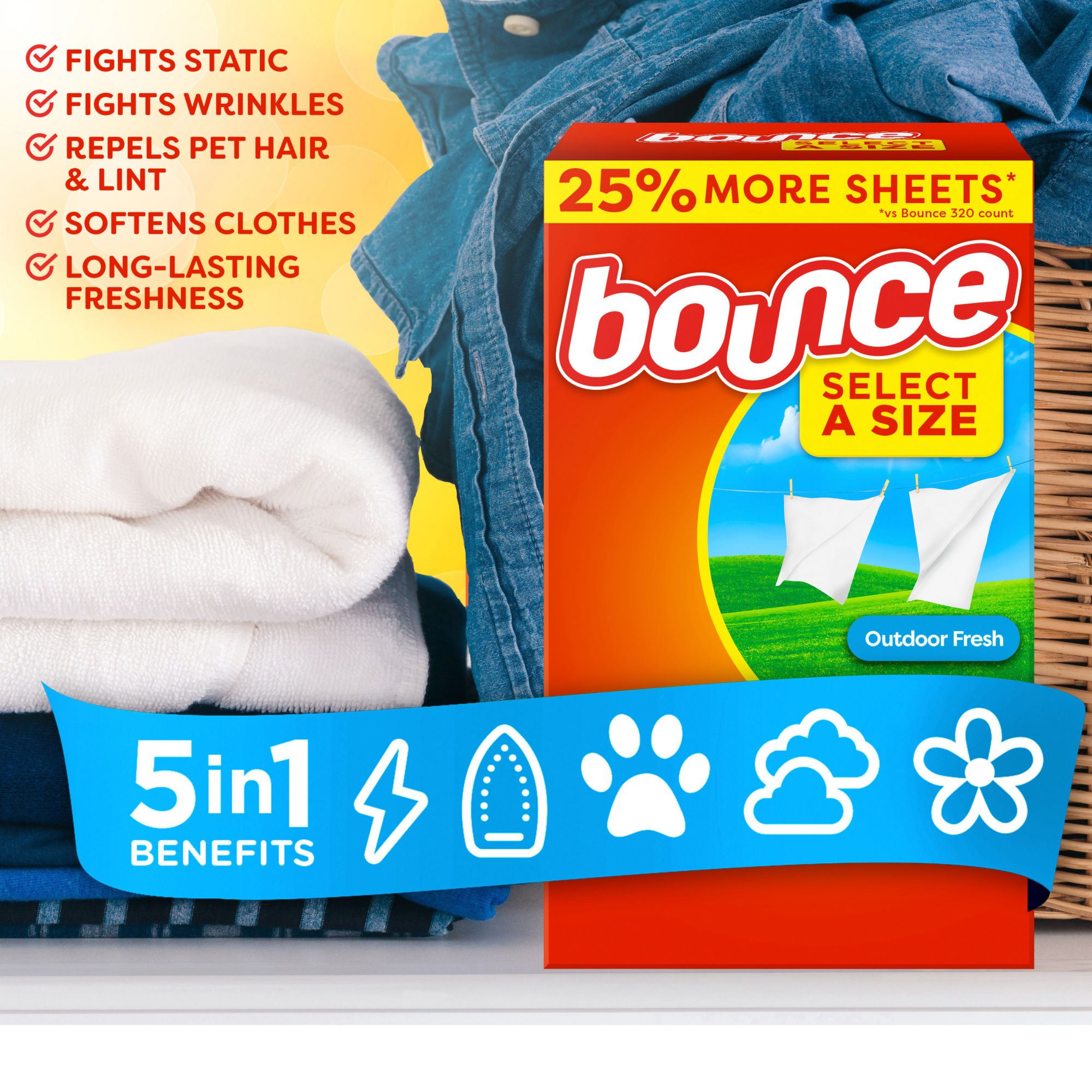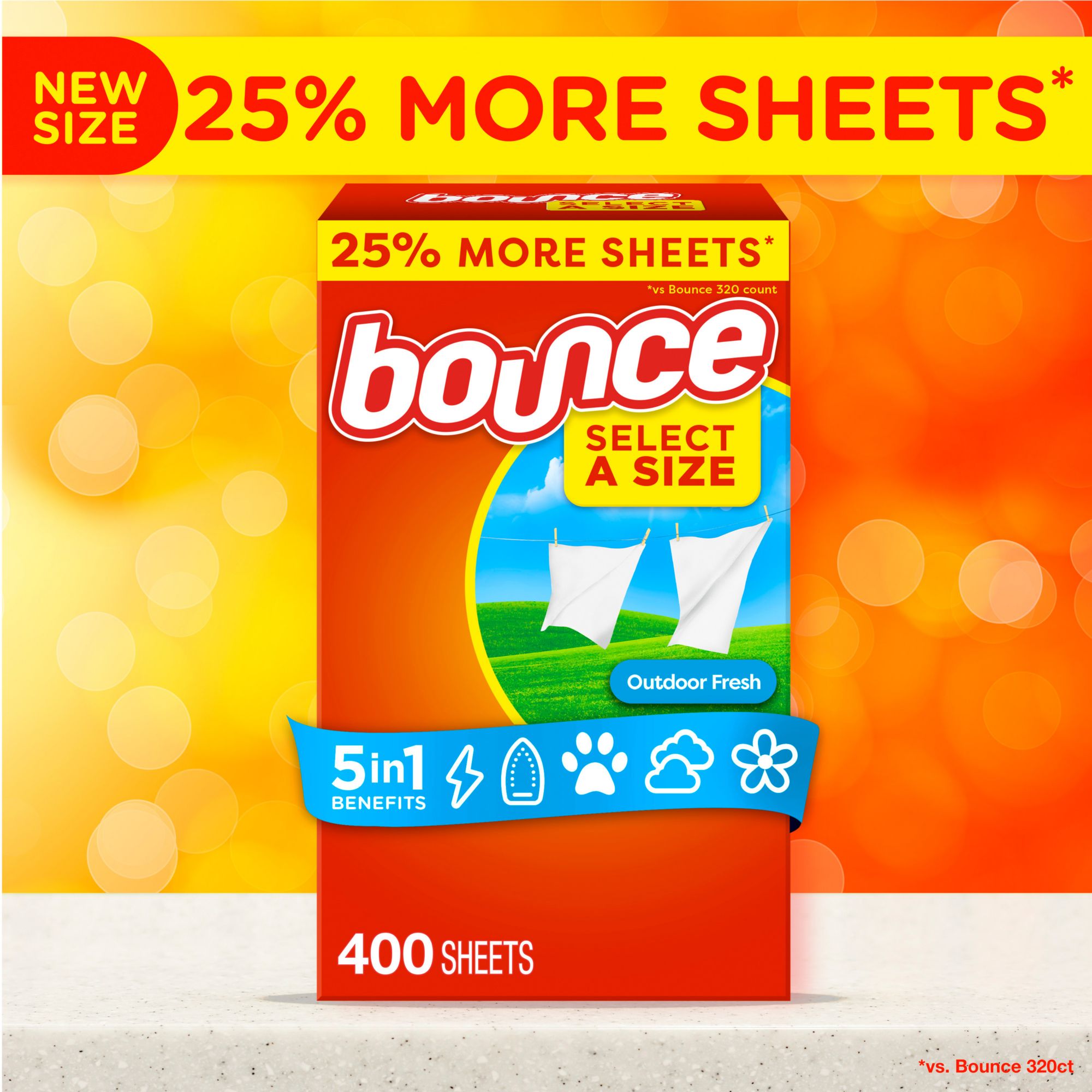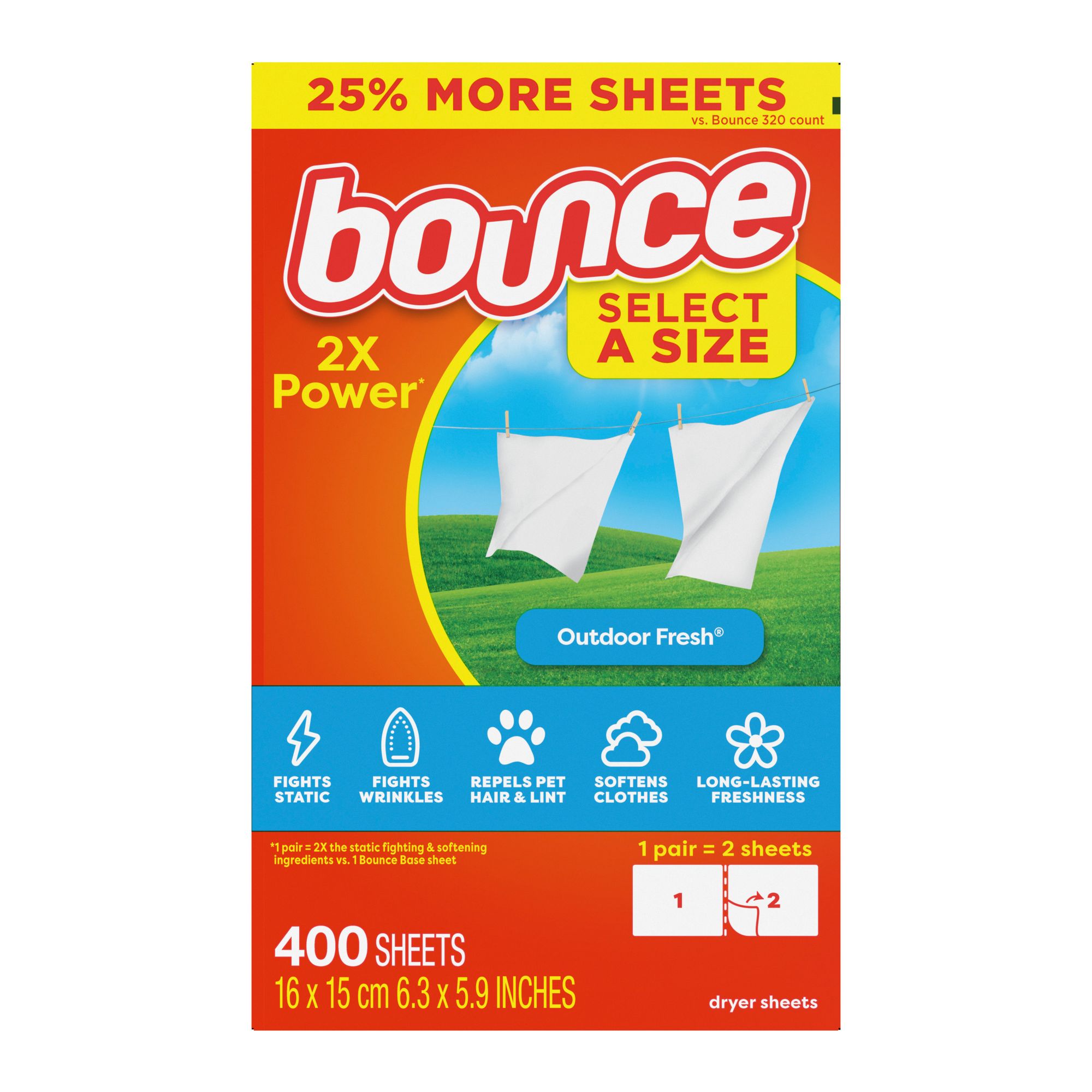 Bounce Select a Size: Try Bounce Outdoor Fresh Select a Size Dryer Sheets, now with 25% more sheets vs Bounce 320 ct. Now with 400 sheets, Bounce Select a Size dryer sheets helps you fight static and wrinkles, repel pet hair, soften clothes, and add long-lasting freshness to every load. Each perforated pair of Bounce Select a Size Dryer Sheets has 2X the power vs. 1 Bounce Base sheet. They're infused with the lasting scent of Outdoor Fresh, reminiscent of fresh springtime air.