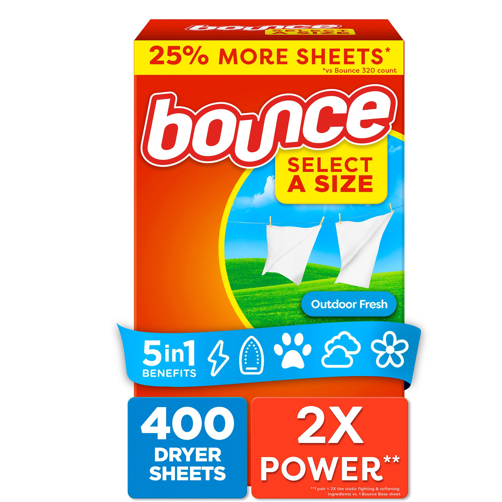 Each perforated pair of Bounce Select a Size Dryer Sheets has 2X the power vs. 1 Bounce Base sheet Bounce Select a Size Dryer Sheets fight static and wrinkles, repel pet hair, soften clothes, and add long-lasting freshness Bounce Outdoor Fresh Select a Size Dryer Sheets are infused with the lasting scent of Outdoor Fresh, reminiscent of fresh springtime air Bounce Select a Size Dryer Sheets work in all types of dryers Box Contains 400 dryer sheets - now with 25% more sheets vs Bounce 320 ct.