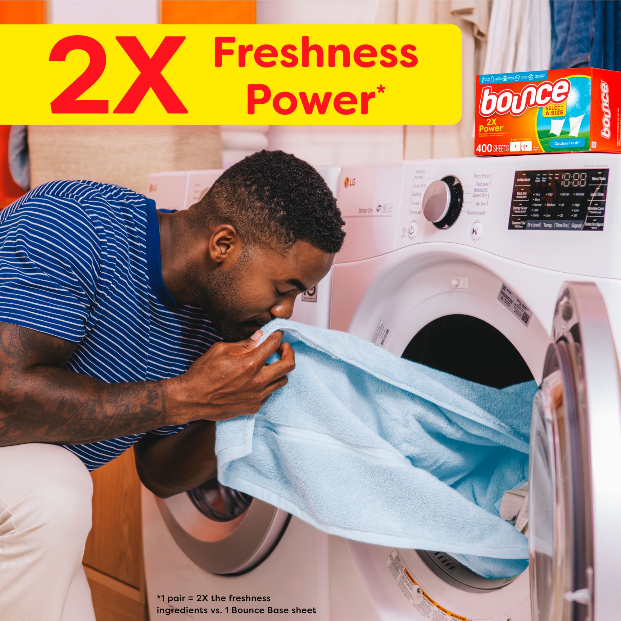 Easy to Use: America's #1 dryer sheet brand* makes getting way less static, fewer wrinkles, and softer fabrics easy. Try Bounce Outdoor Fresh Select a Size Dryer Sheets, which allow you to select your size of sheet for different-sized loads. Each pair of Bounce Outdoor Fresh Select a Size Dryer Sheets is perforated so you can customize to use just what you need, whether less for smaller loads or more for larger loads. Toss in two Bounce Outdoor Fresh Select a Size Dryer Sheets for your average loads to iron less, fight more static, and add more softness. One will do for small loads, and if you're catching up on laundry and have an extra large load, toss in three!