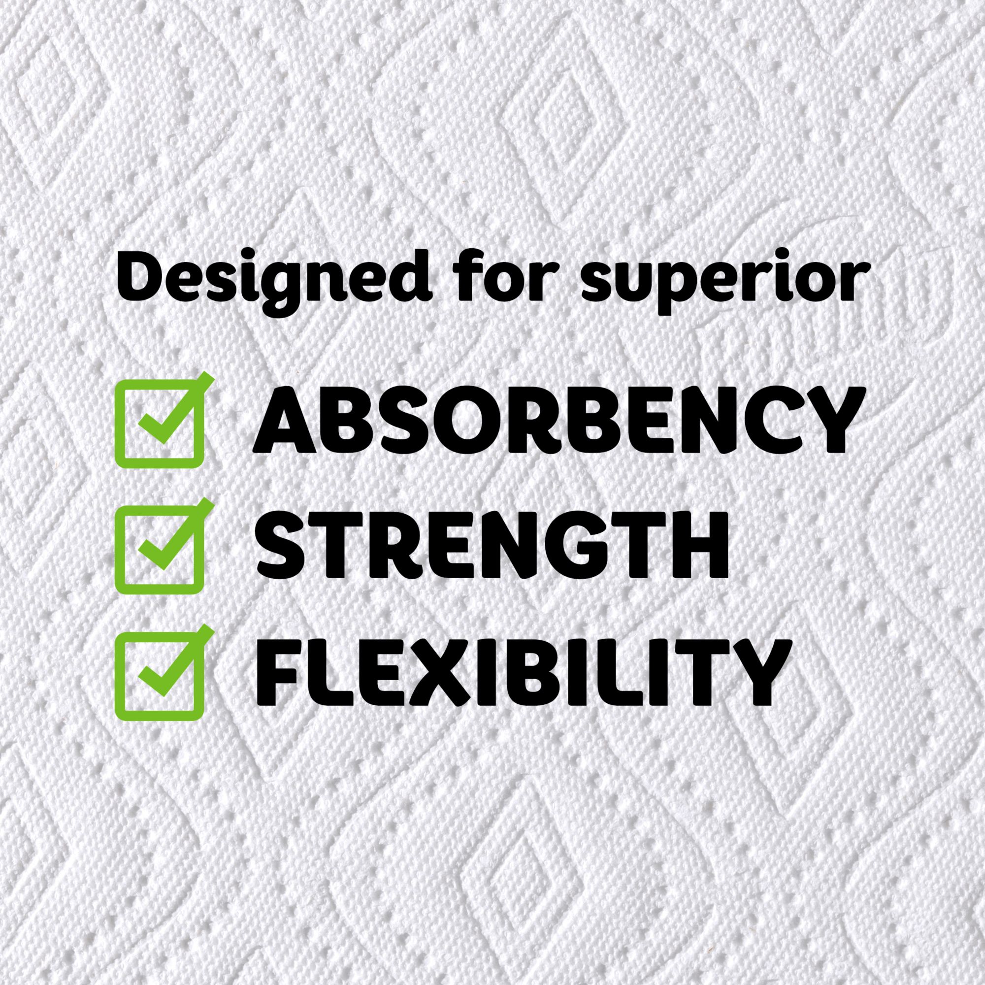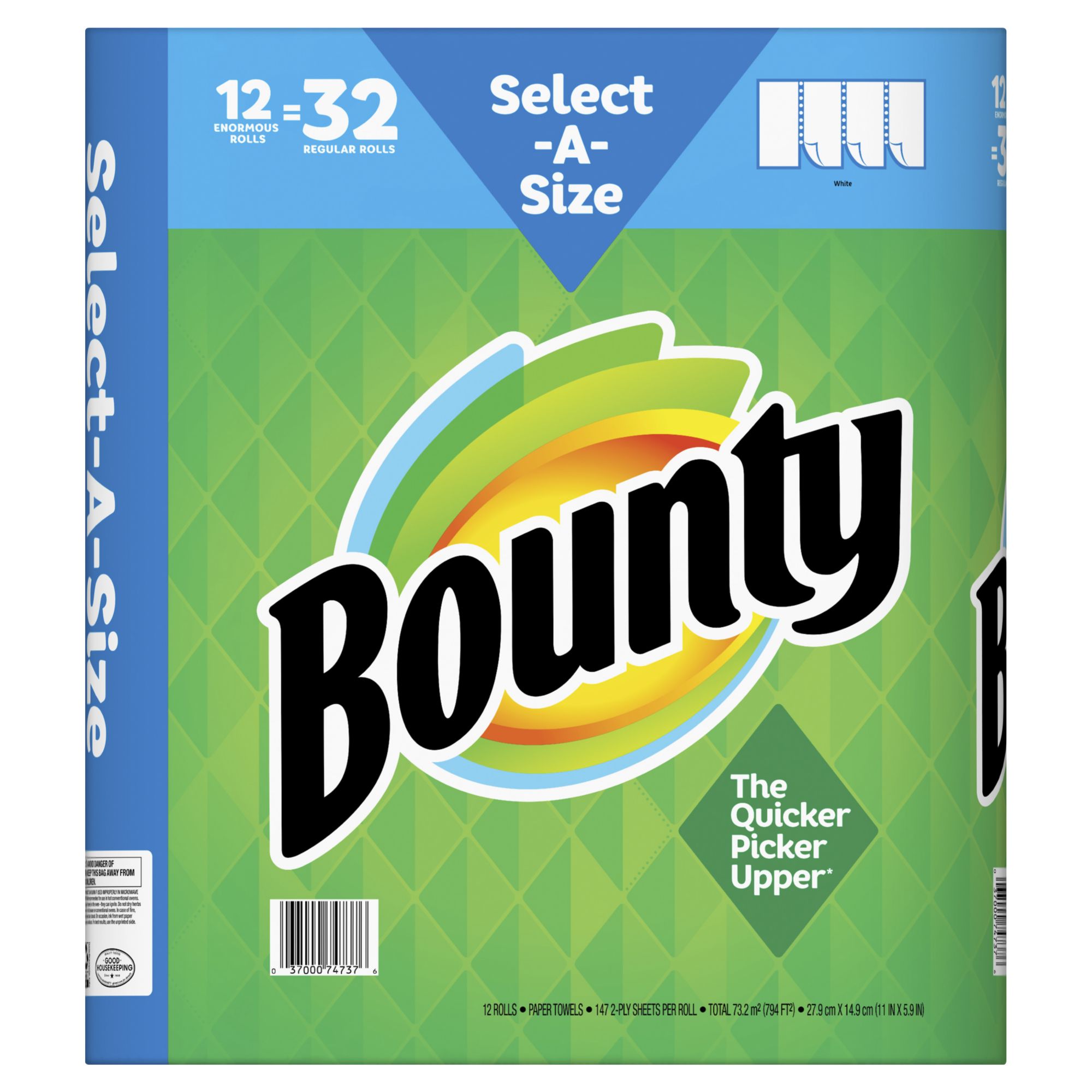Don’t let spills and messes get in your way. Lock in confidence with Bounty, the Quicker Picker Upper.* This pack contains Bounty white Select-A-Size paper towels that are two times more absorbent** and strong when wet, so you can get the job done quickly. Save money with the Bounty enormous rolls where 12 equals 32 normal rolls.